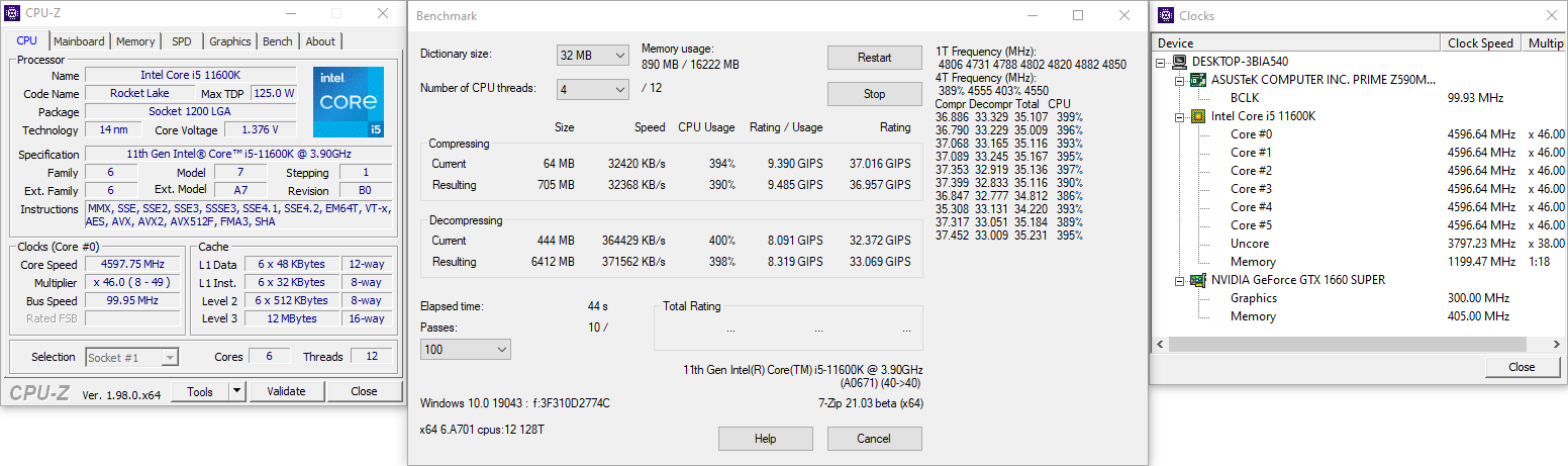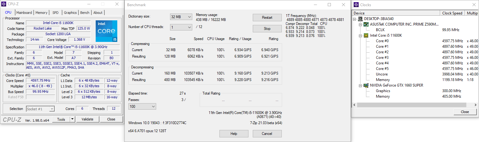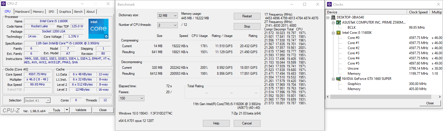 Поскольку круглой частоты для Core i5-11600 K с участием LinX на этой плате получить не вышло, руки оказались развязаны в поисках предельно стабильной частоты памяти, и, вместо ранее повсеместно зафиксированных 3,6 ГГц, здесь я улучшил результат — 3650 МГц. Правда, он был сопряжён с заблаговременно установленными 1,55 В на модулях, являющихся условно-безопасными для воздушных экспериментов с чипами Samsung B-die. Схема задержек приобрела вид 14-13-13-28-256-1T. SA Voltage устанавливался равным 1,35 В, а для IO 2 достаточными стали 1,17 В. Настройки для процессора брались из вышепроведённого теста, отстроенного под LinX. Кольцевую шину удалось ускорить до 4258 МГц. Само собой, всё это сопровождалось делителем Gear 1.