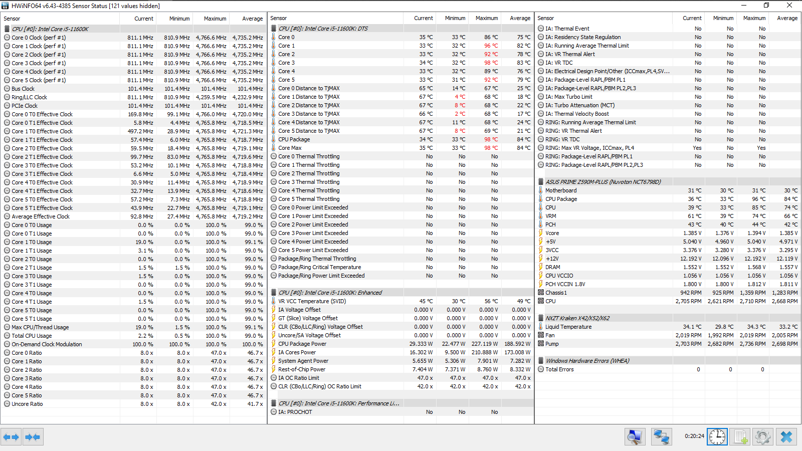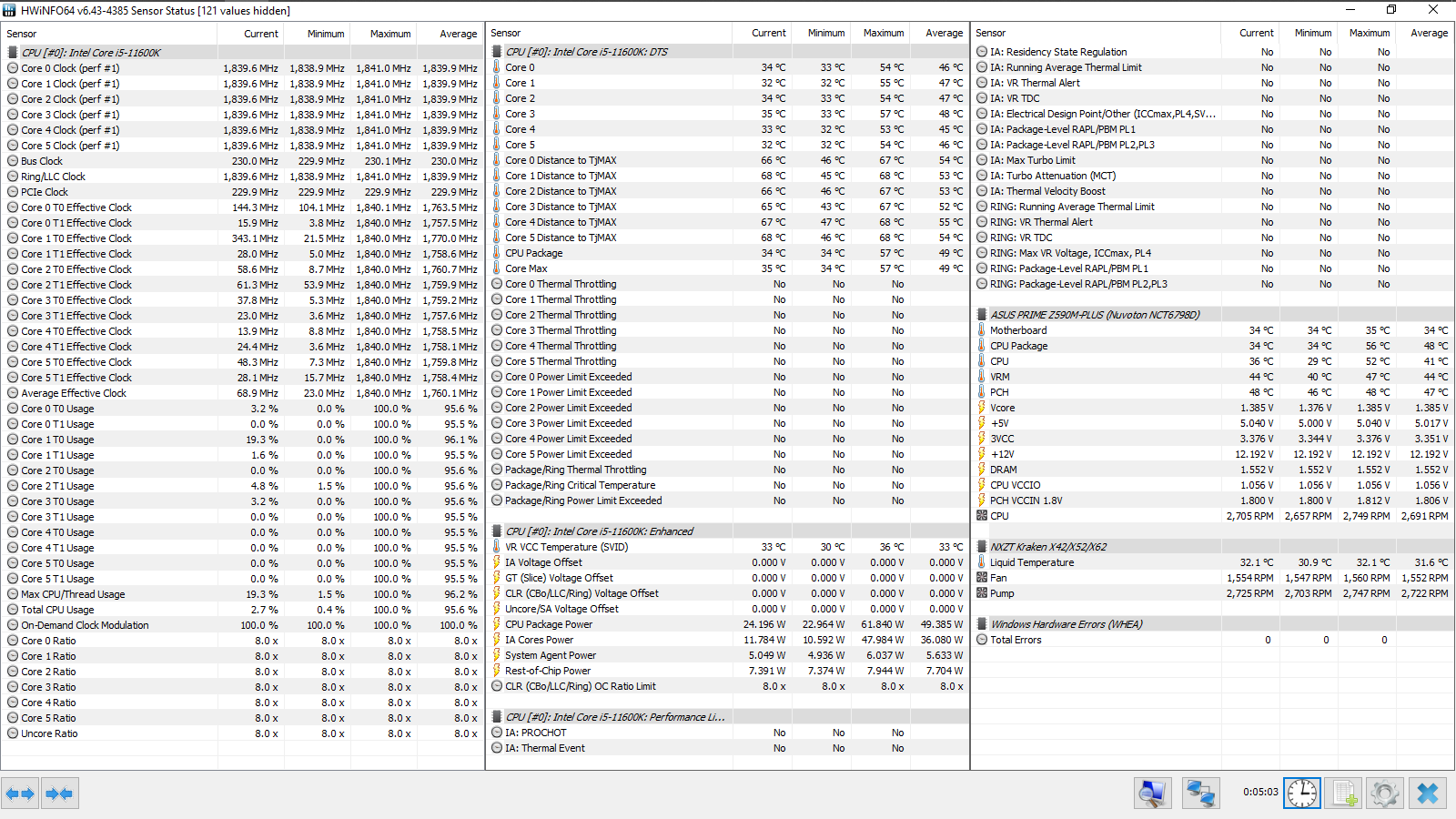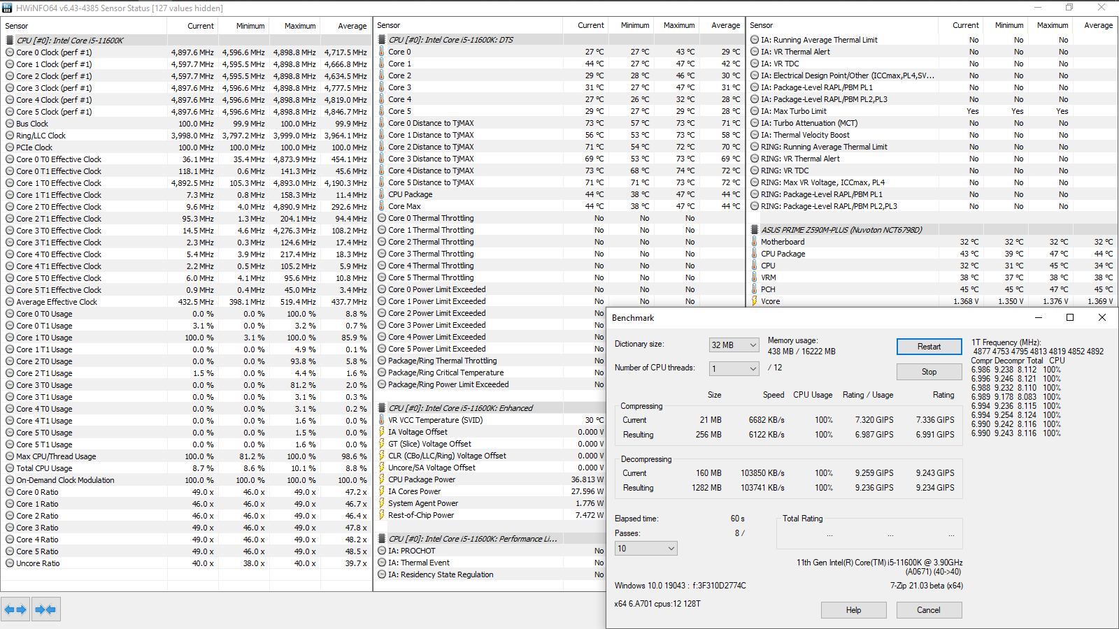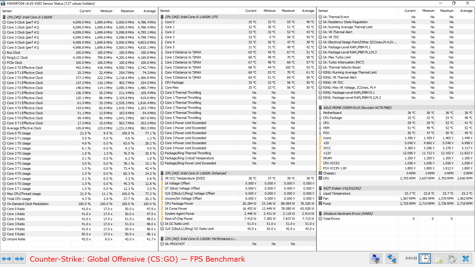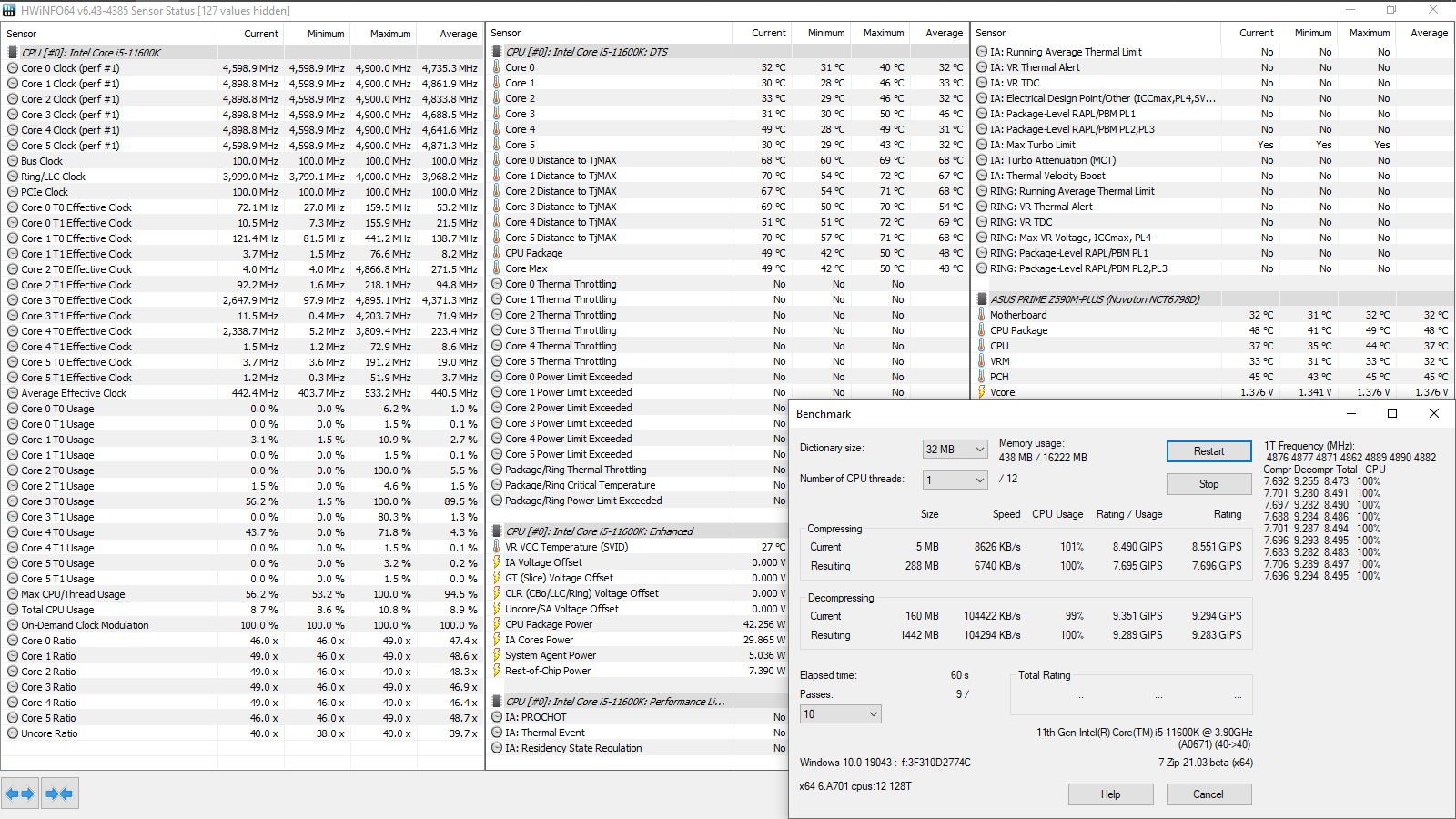 Здесь схема отрабатывала ровно так же, как и на TUF Gaming Z590-Plus WiFi: с несложными задачами частота ЦП была выше, как и питающее напряжение; использование всех потоков частоту на ядрах уравнивало, снижалось и напряжение. Нет проблем с температурами и стабильностью ПК.