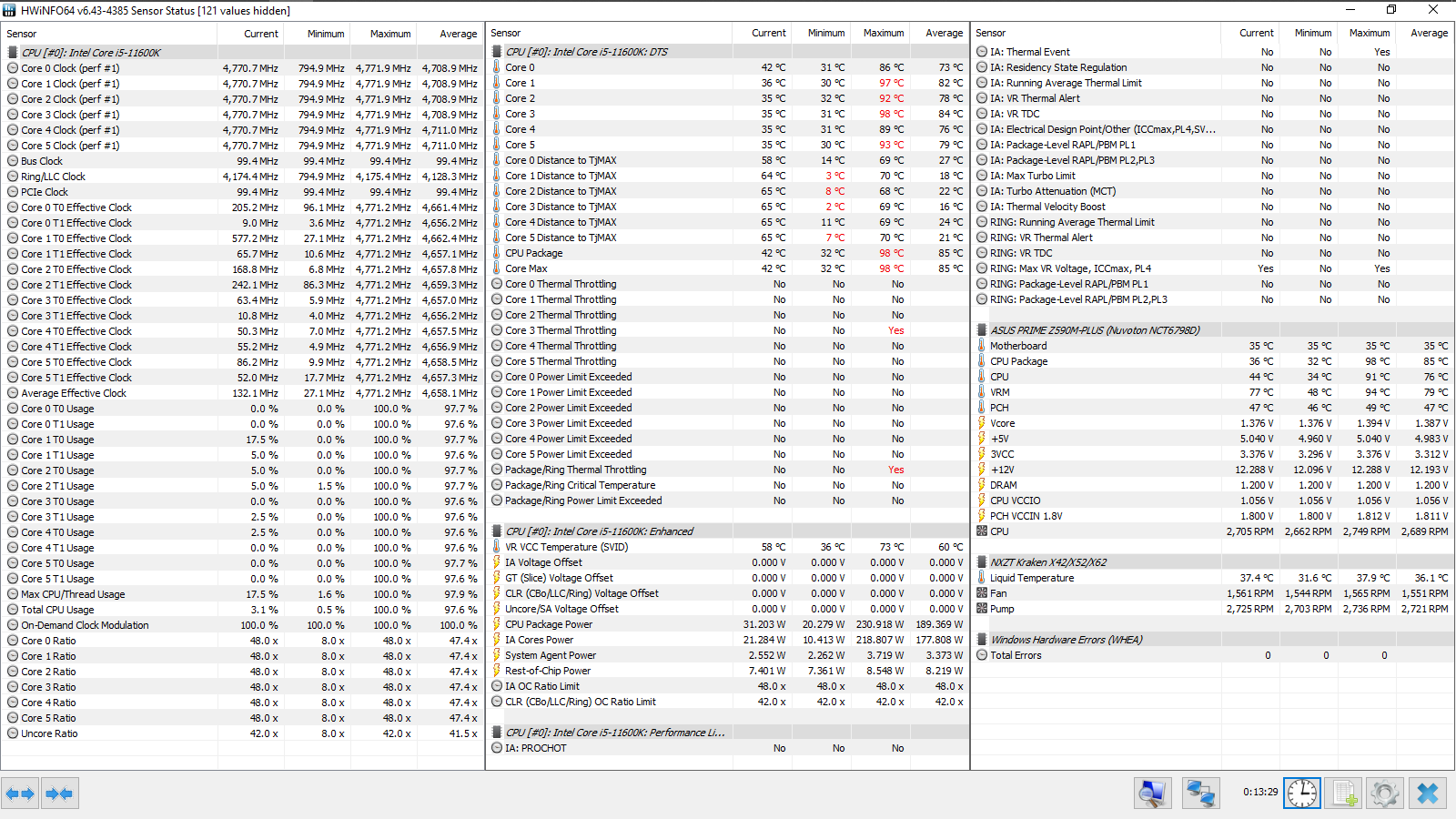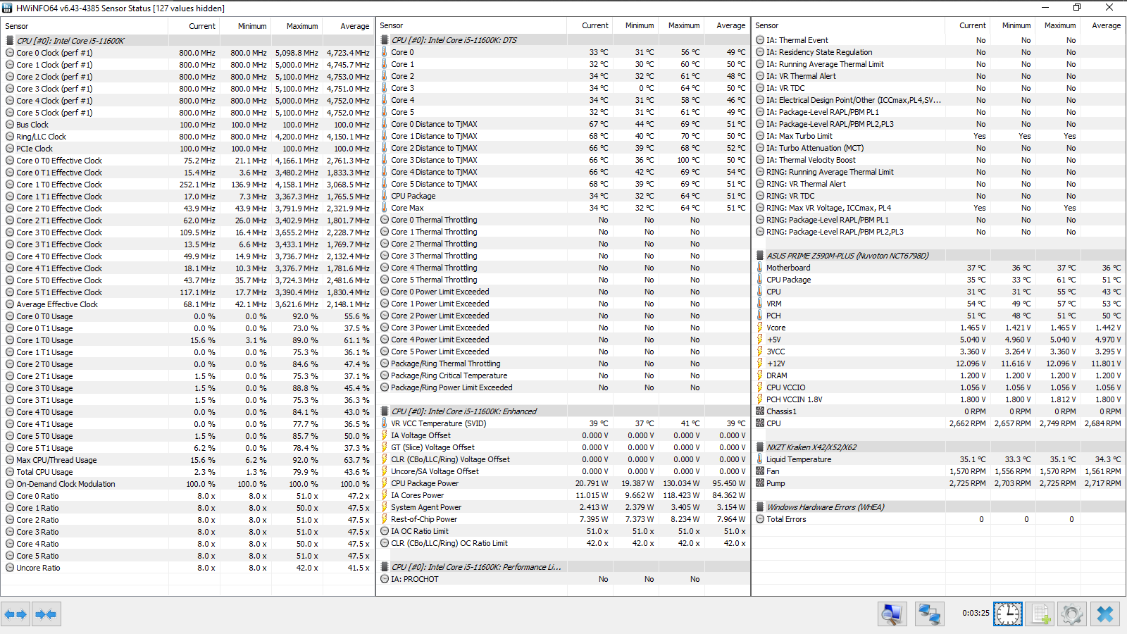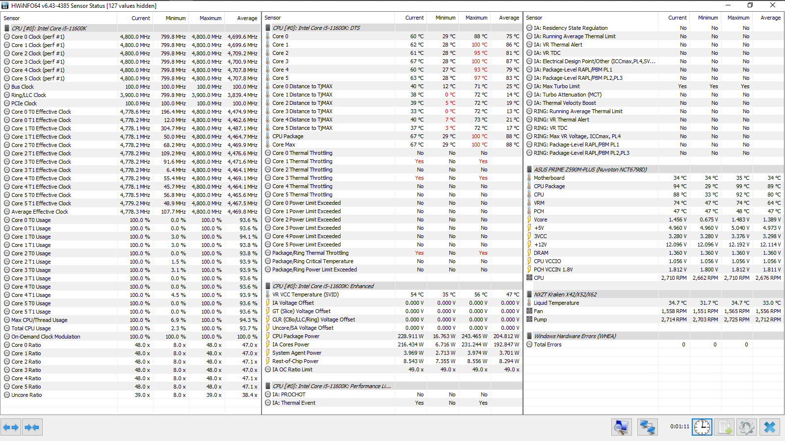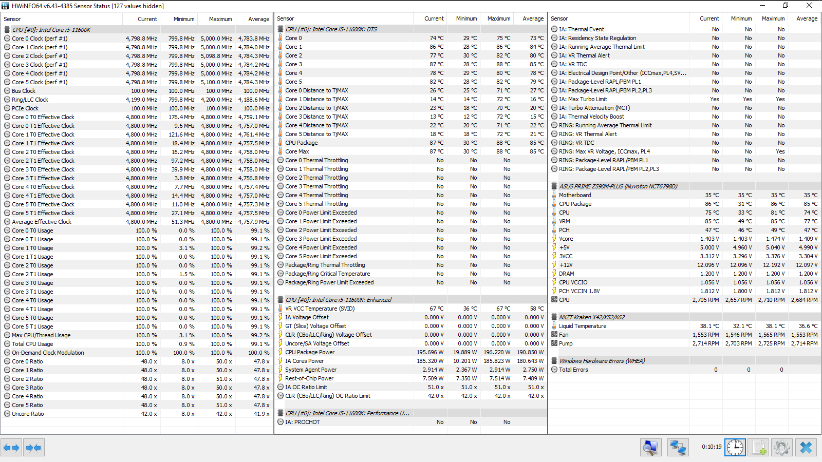 Здесь схема отрабатывала ровно так же, как и на TUF Gaming Z590-Plus WiFi: с несложными задачами частота ЦП была выше, как и питающее напряжение; использование всех потоков частоту на ядрах уравнивало, снижалось и напряжение. Нет проблем с температурами и стабильностью ПК.