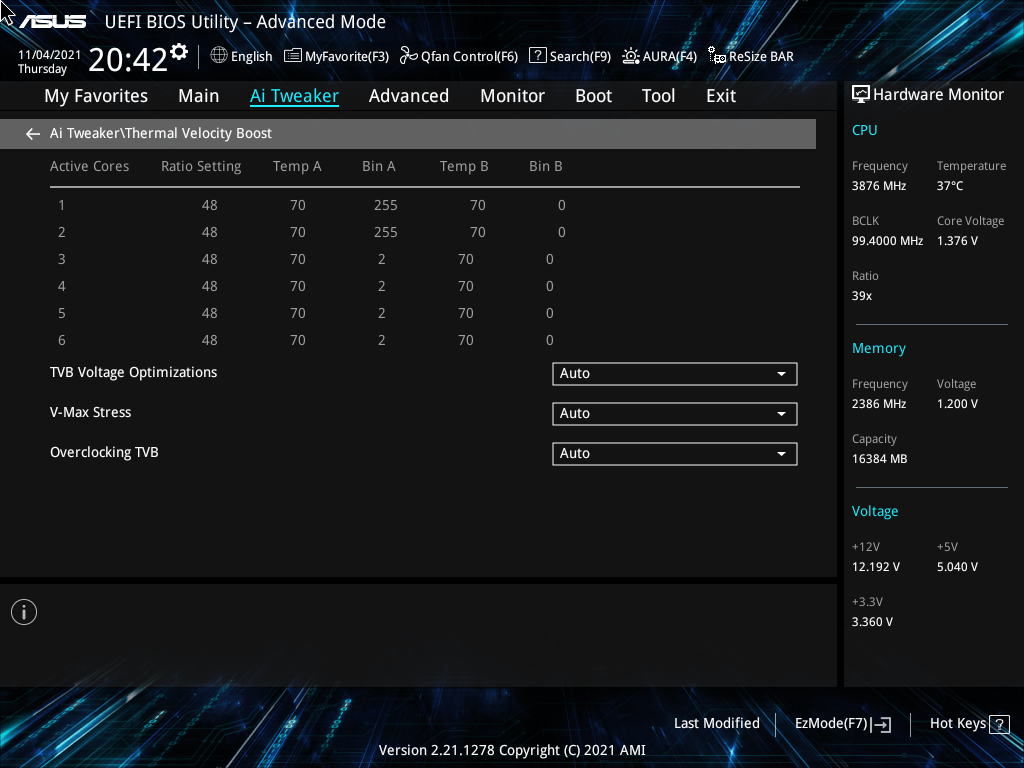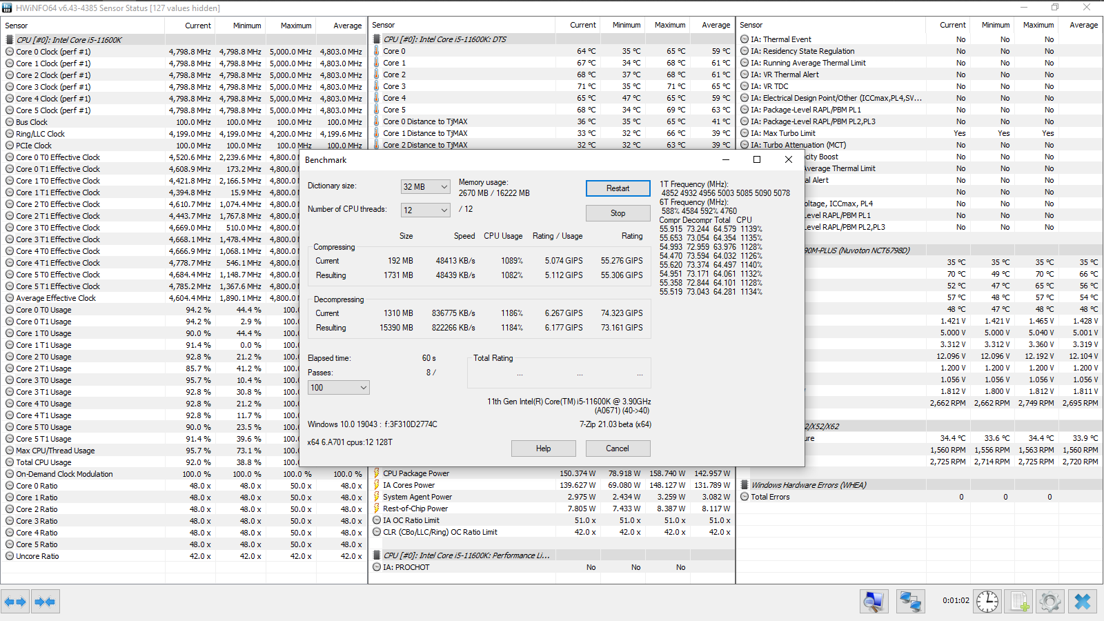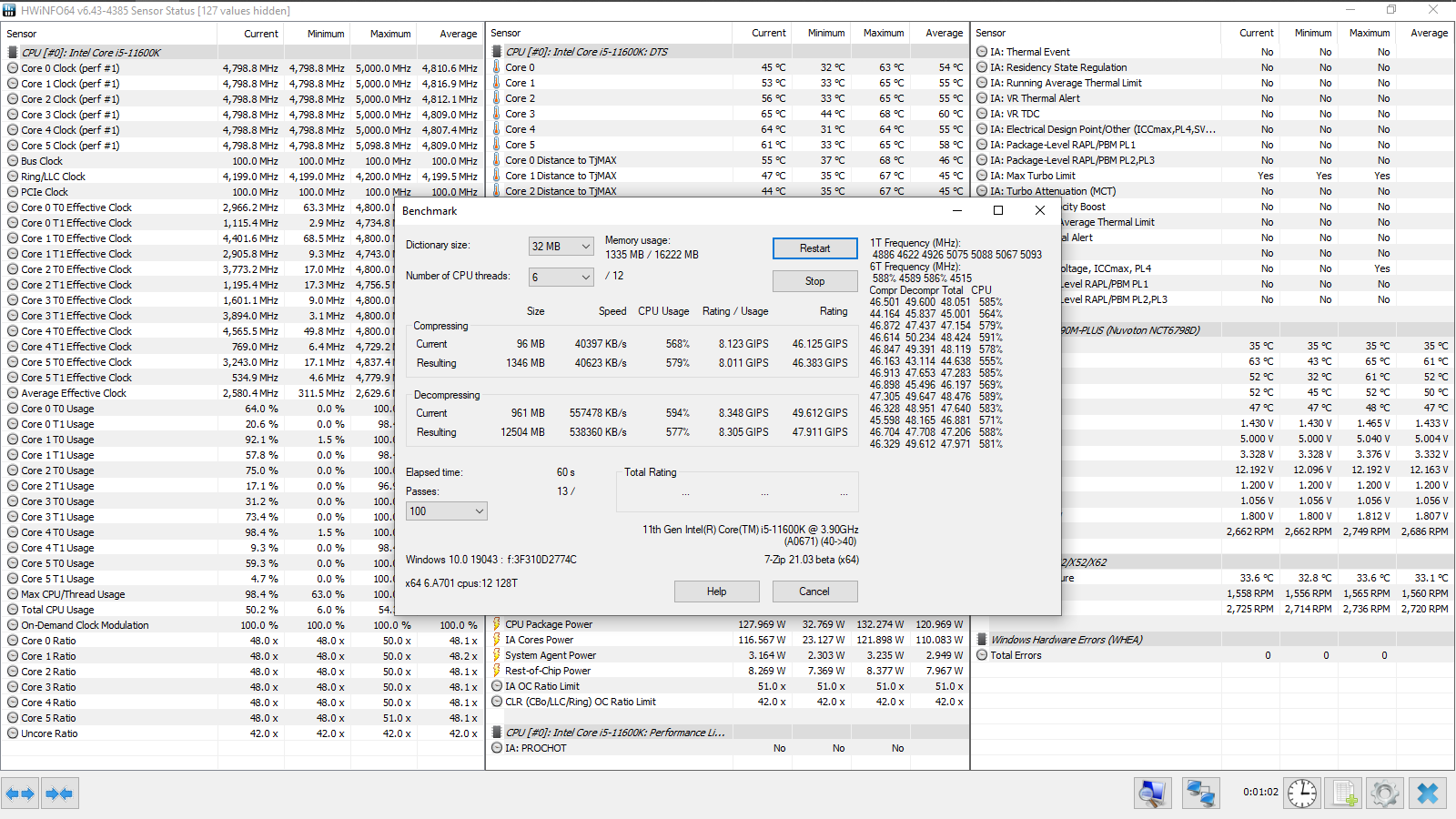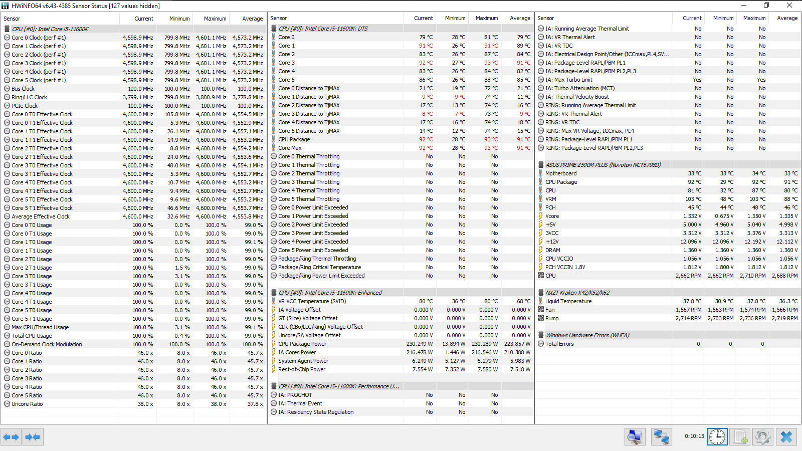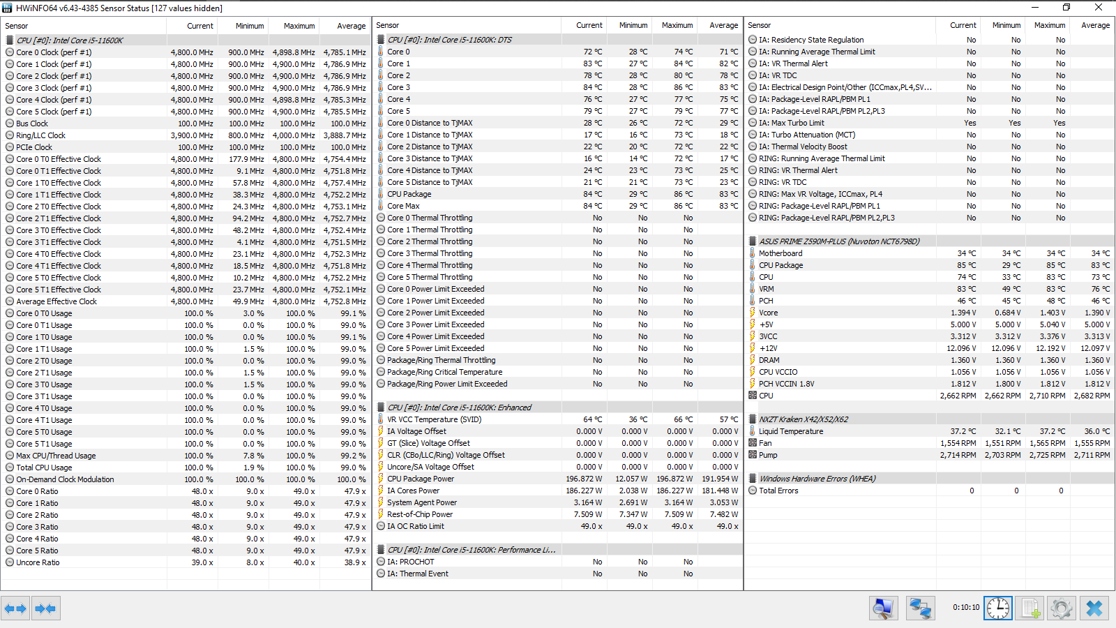 Здесь схема отрабатывала ровно так же, как и на TUF Gaming Z590-Plus WiFi: с несложными задачами частота ЦП была выше, как и питающее напряжение; использование всех потоков частоту на ядрах уравнивало, снижалось и напряжение. Нет проблем с температурами и стабильностью ПК.