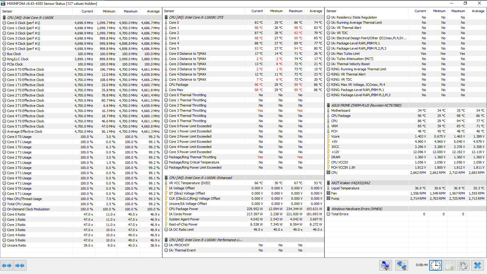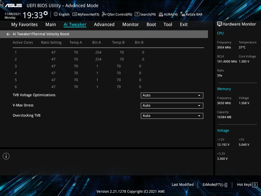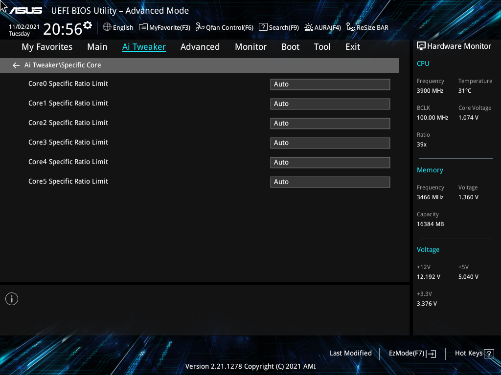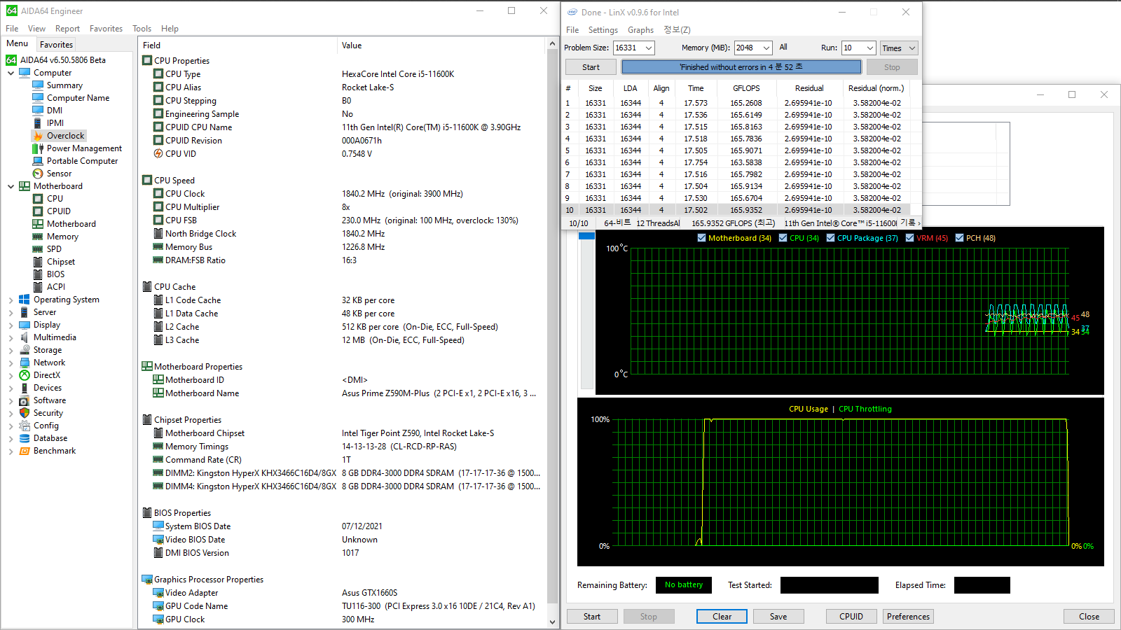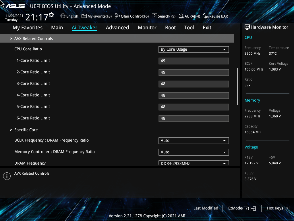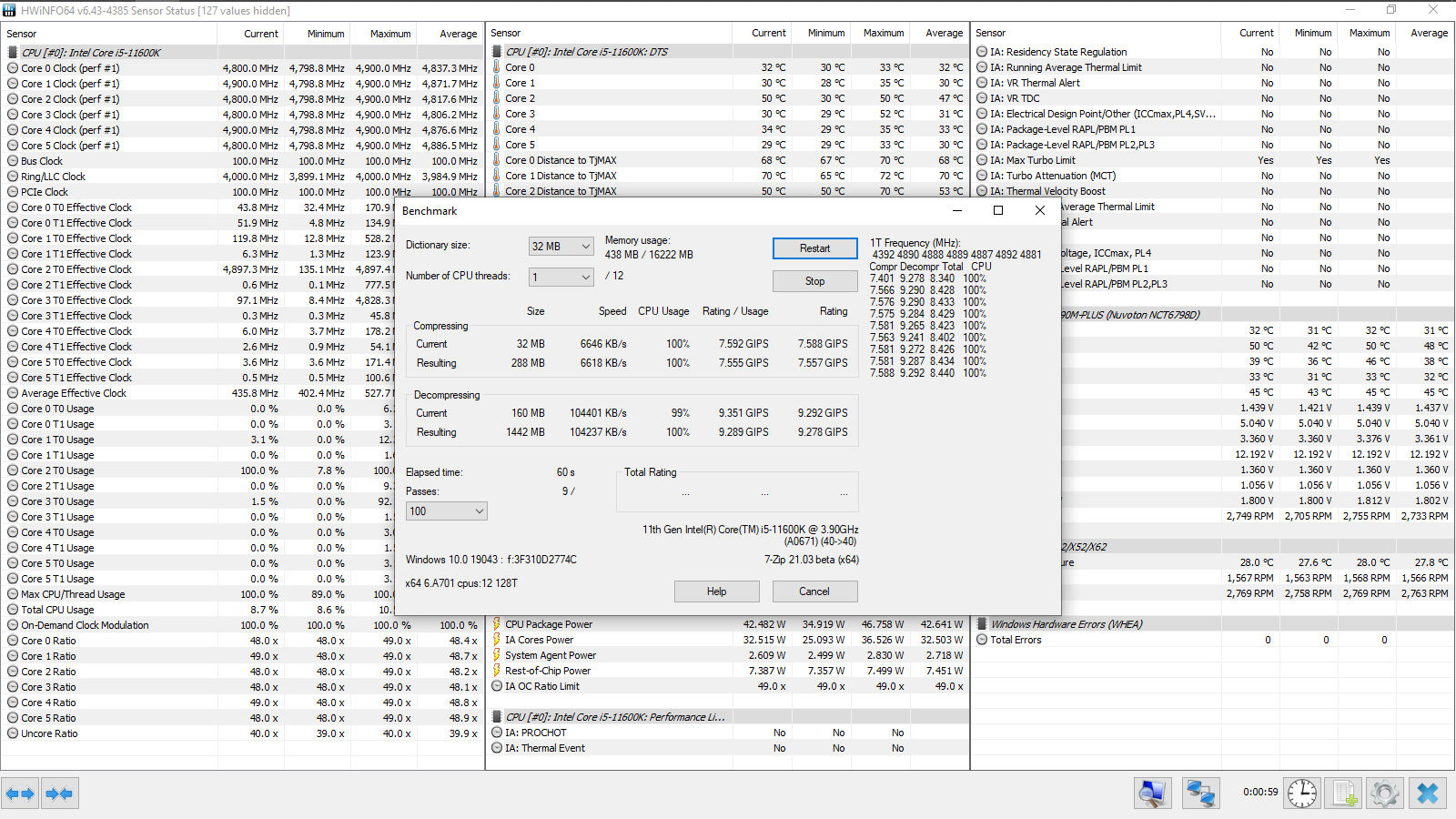 Здесь схема отрабатывала ровно так же, как и на TUF Gaming Z590-Plus WiFi: с несложными задачами частота ЦП была выше, как и питающее напряжение; использование всех потоков частоту на ядрах уравнивало, снижалось и напряжение. Нет проблем с температурами и стабильностью ПК.