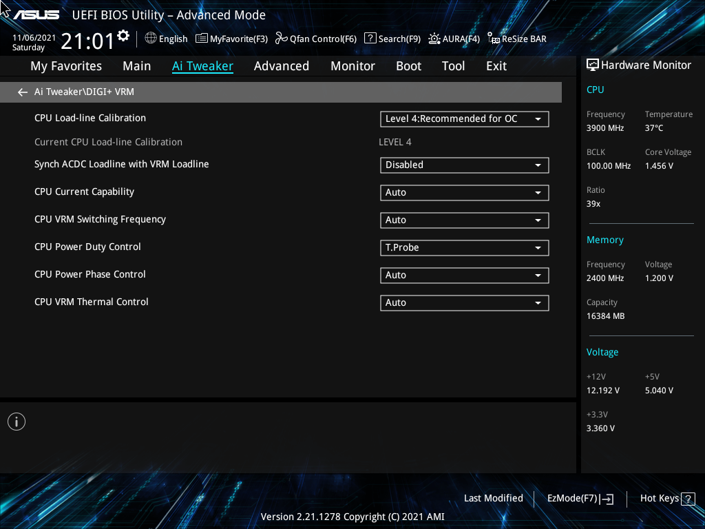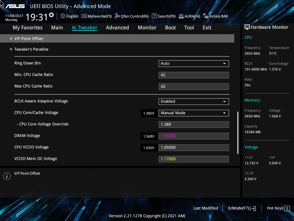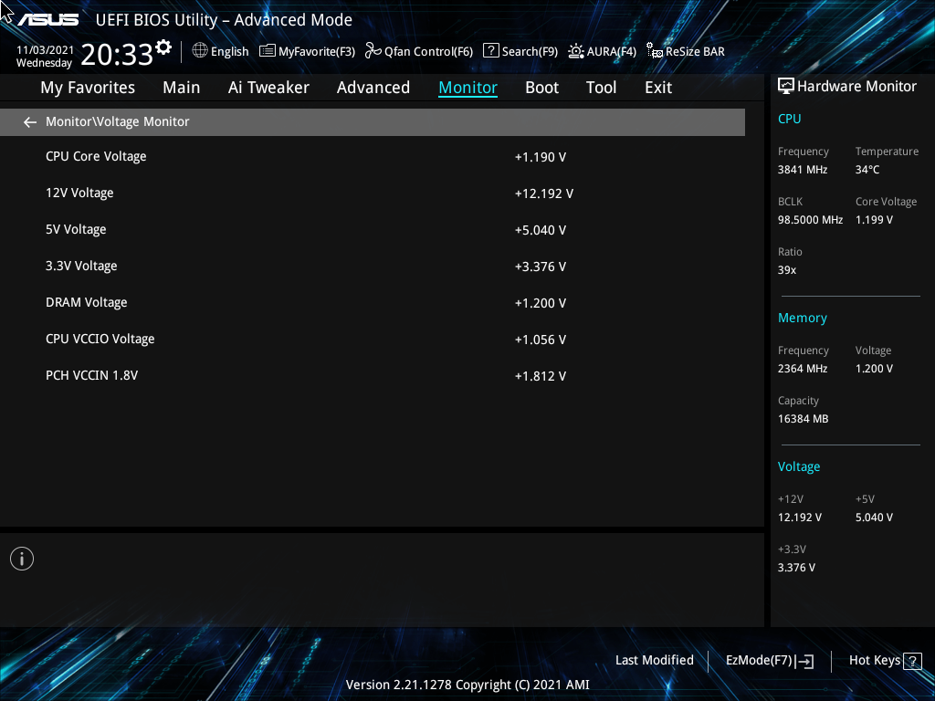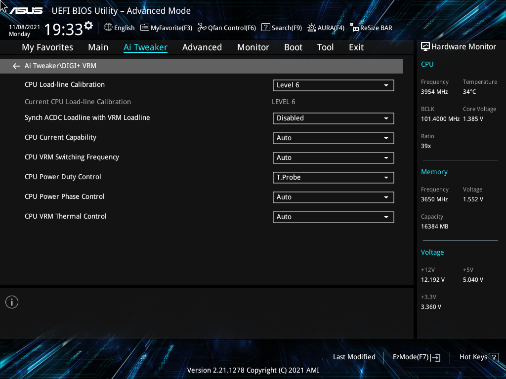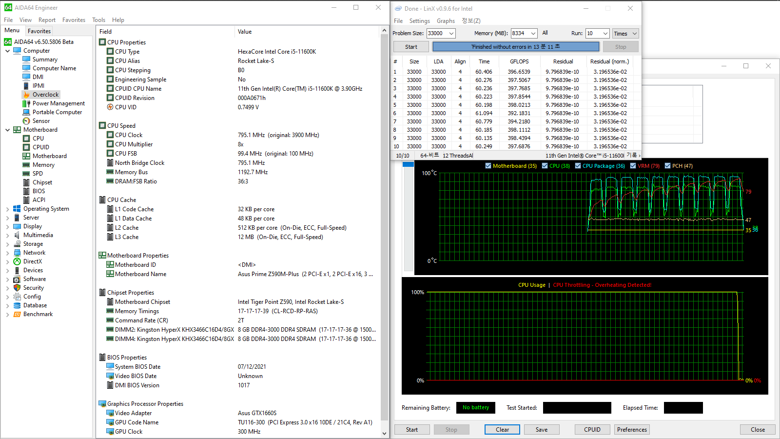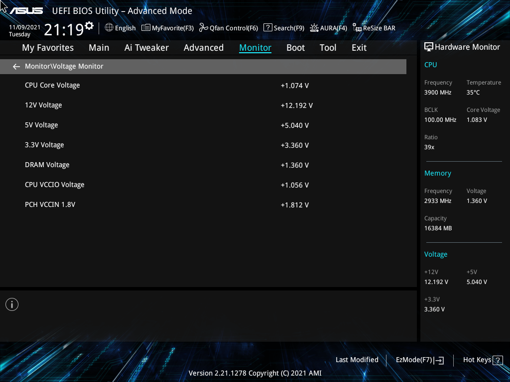 Здесь схема отрабатывала ровно так же, как и на TUF Gaming Z590-Plus WiFi: с несложными задачами частота ЦП была выше, как и питающее напряжение; использование всех потоков частоту на ядрах уравнивало, снижалось и напряжение. Нет проблем с температурами и стабильностью ПК.