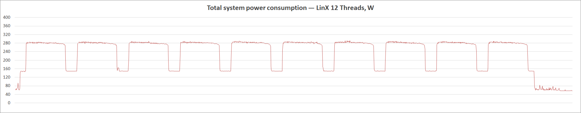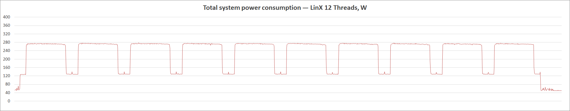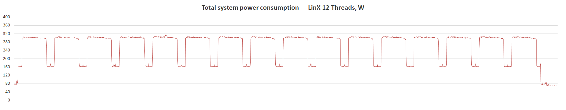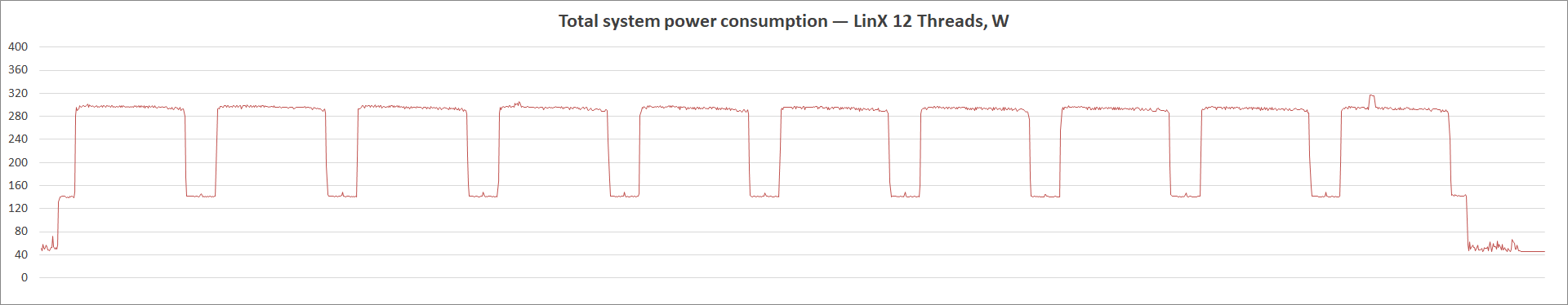Исключив всплески, предельным потреблением в LinX оказались 301 Вт, а пиковые отметки такие — 317, 292 и 335 Вт. В простое понижение величины достигало 44 Вт, выходит, пара ватт ушла на форсированную работу AIO.