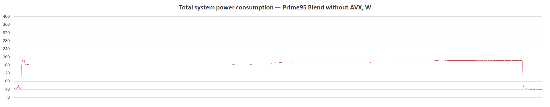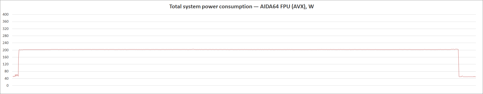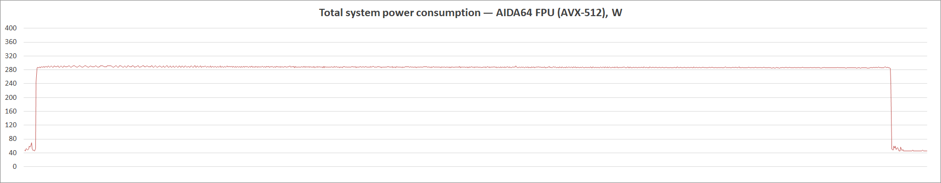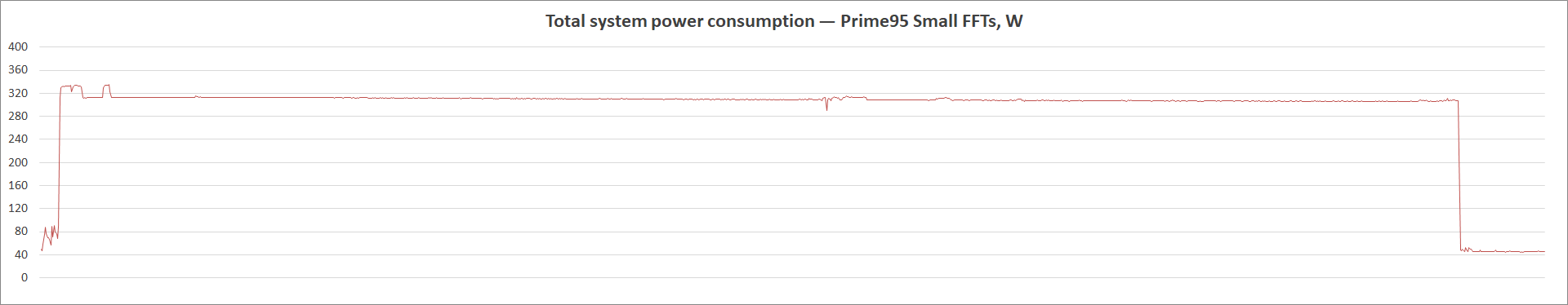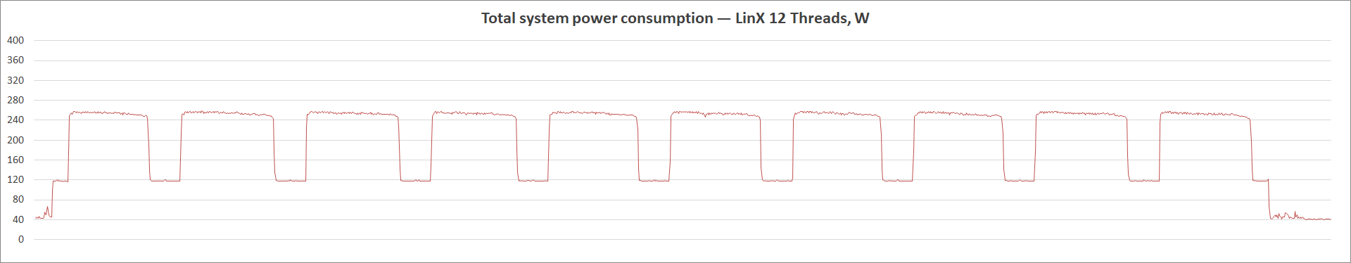 Исключив всплески, предельным потреблением в LinX оказались 301 Вт, а пиковые отметки такие — 317, 292 и 335 Вт. В простое понижение величины достигало 44 Вт, выходит, пара ватт ушла на форсированную работу AIO.