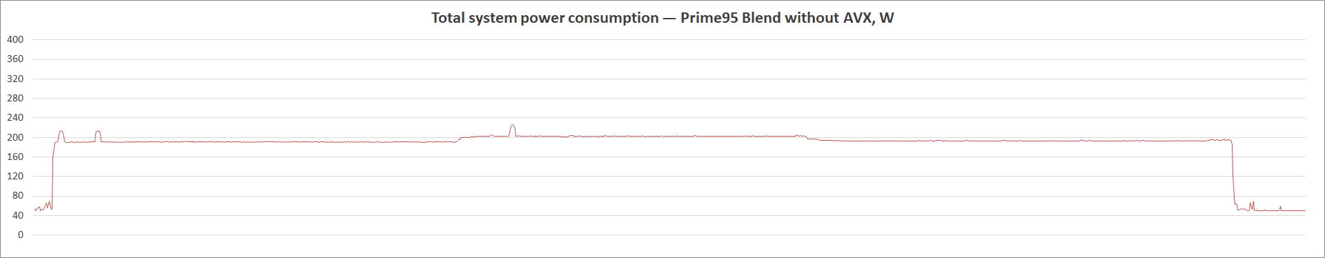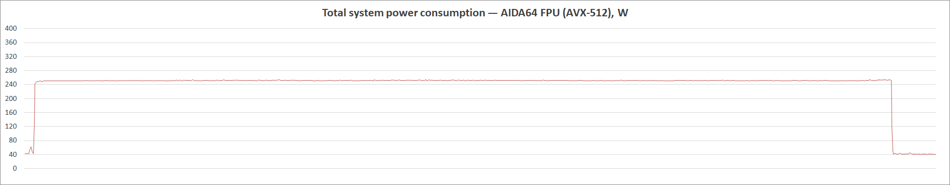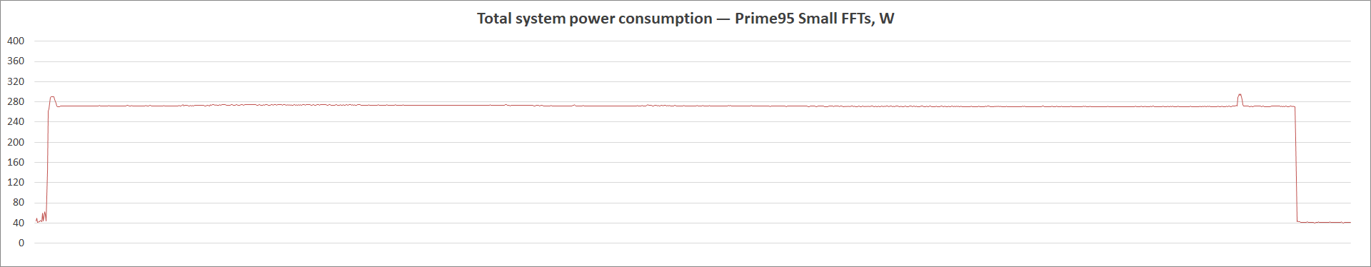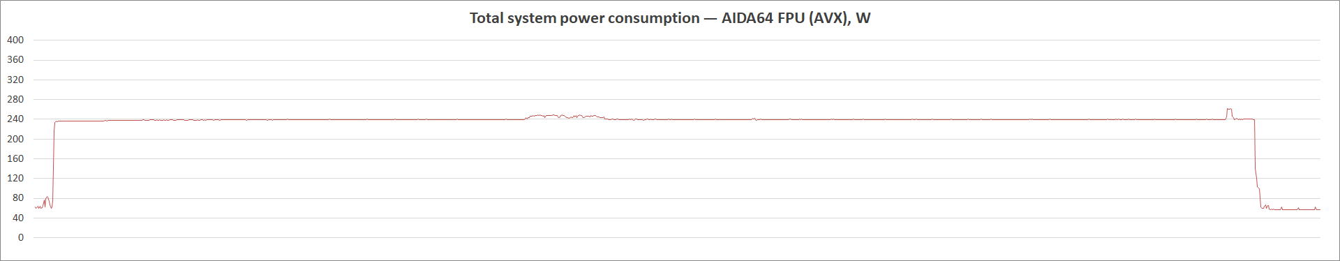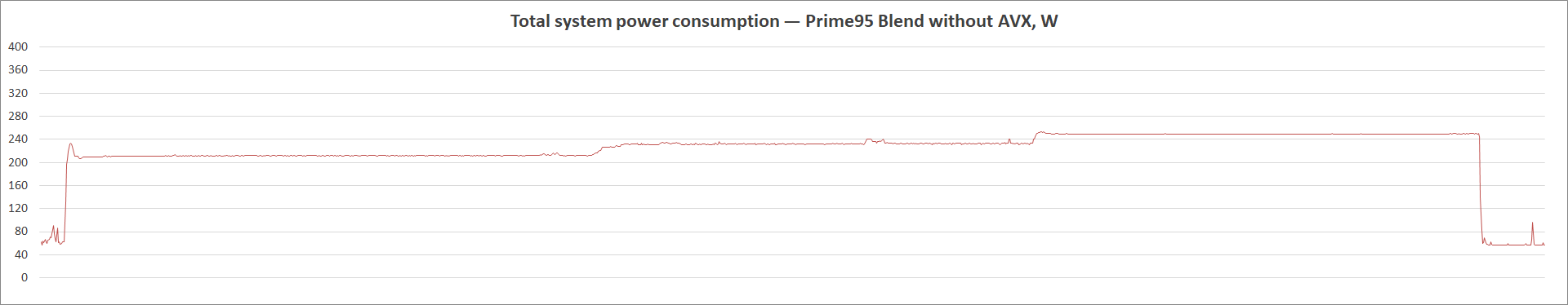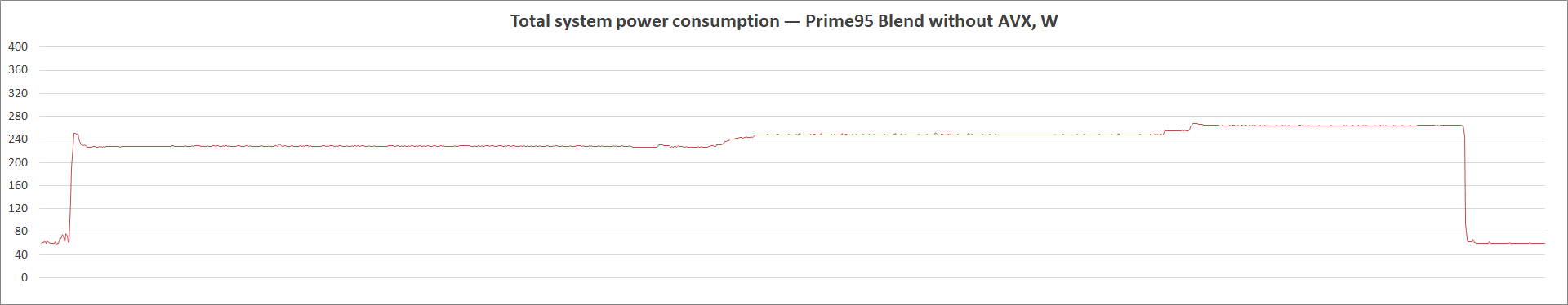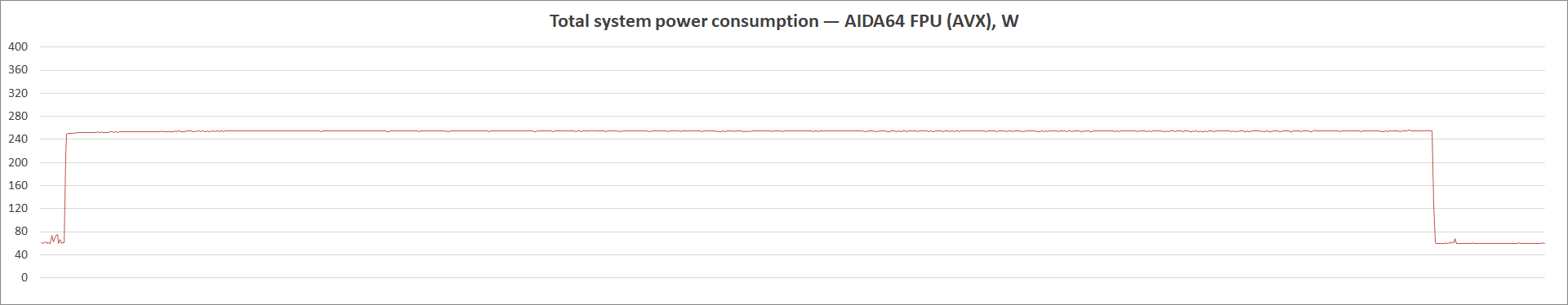 В простое наблюдались 42 Вт потребления, при нагрузке пики составили 257 и 250 Вт.