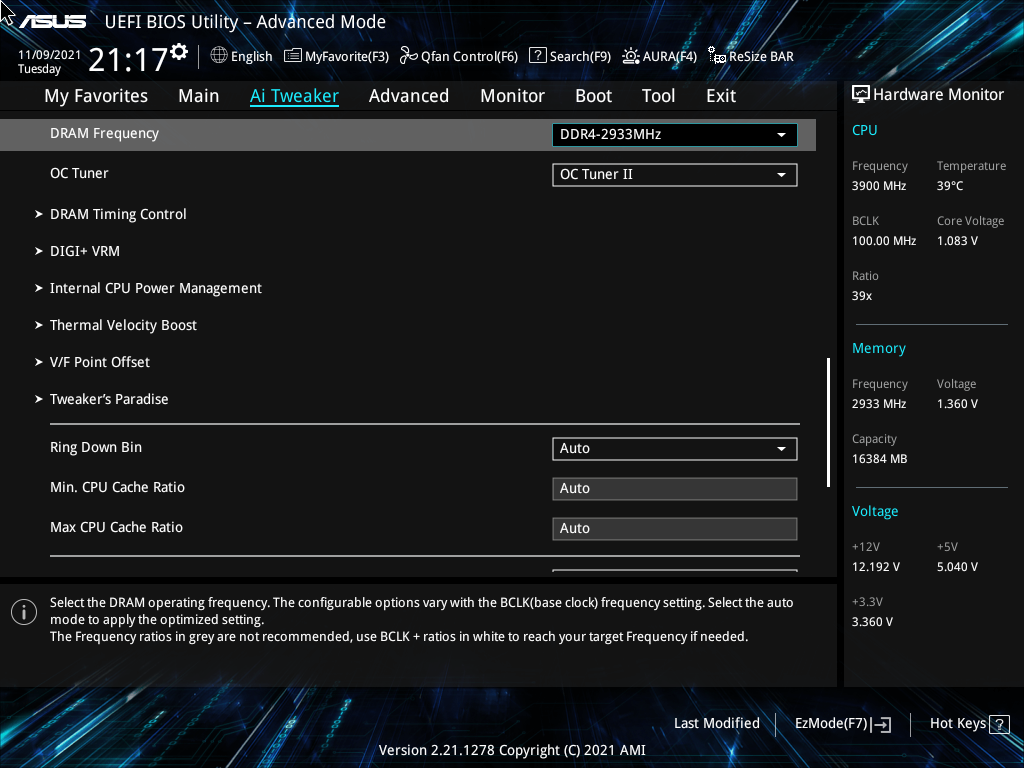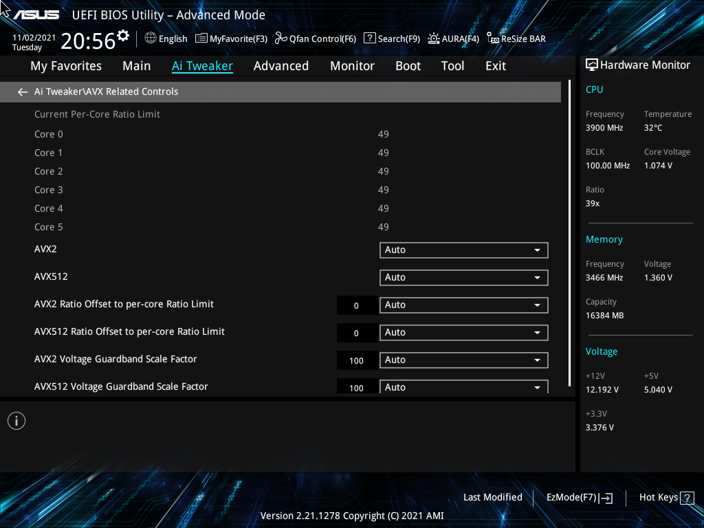 Оба фирменных профиля OC Tuner идентичны виденным на более дорой плате. Второй — более агрессивный, с него и начнём. Множители процессора будут установлены по схеме 49-49-48-48-48-48, разгон памяти связан с менее быстрым профилем XMP, оттуда подтягиваются основные задержки —в нашем случае это 15-17-17-36, а также устанавливается напряжение величиной 1,35 вольт. Затем частота прямым указанием снижается до 2933 МГц. Лимиты потребления оставались форсированными до максимальных, а профиль LLC тоже не менялся на фоне базовых настроек — это Level 2.