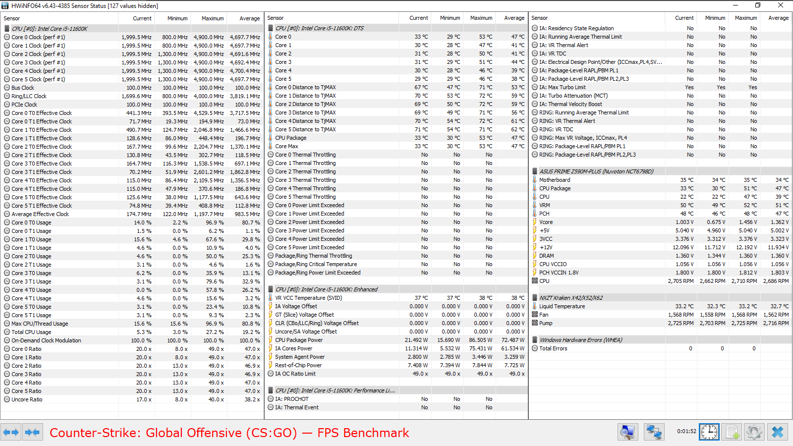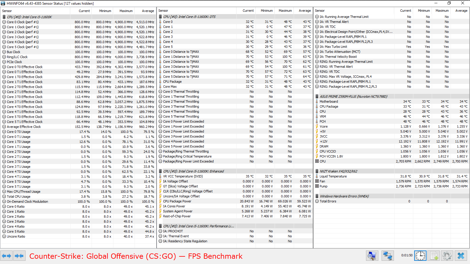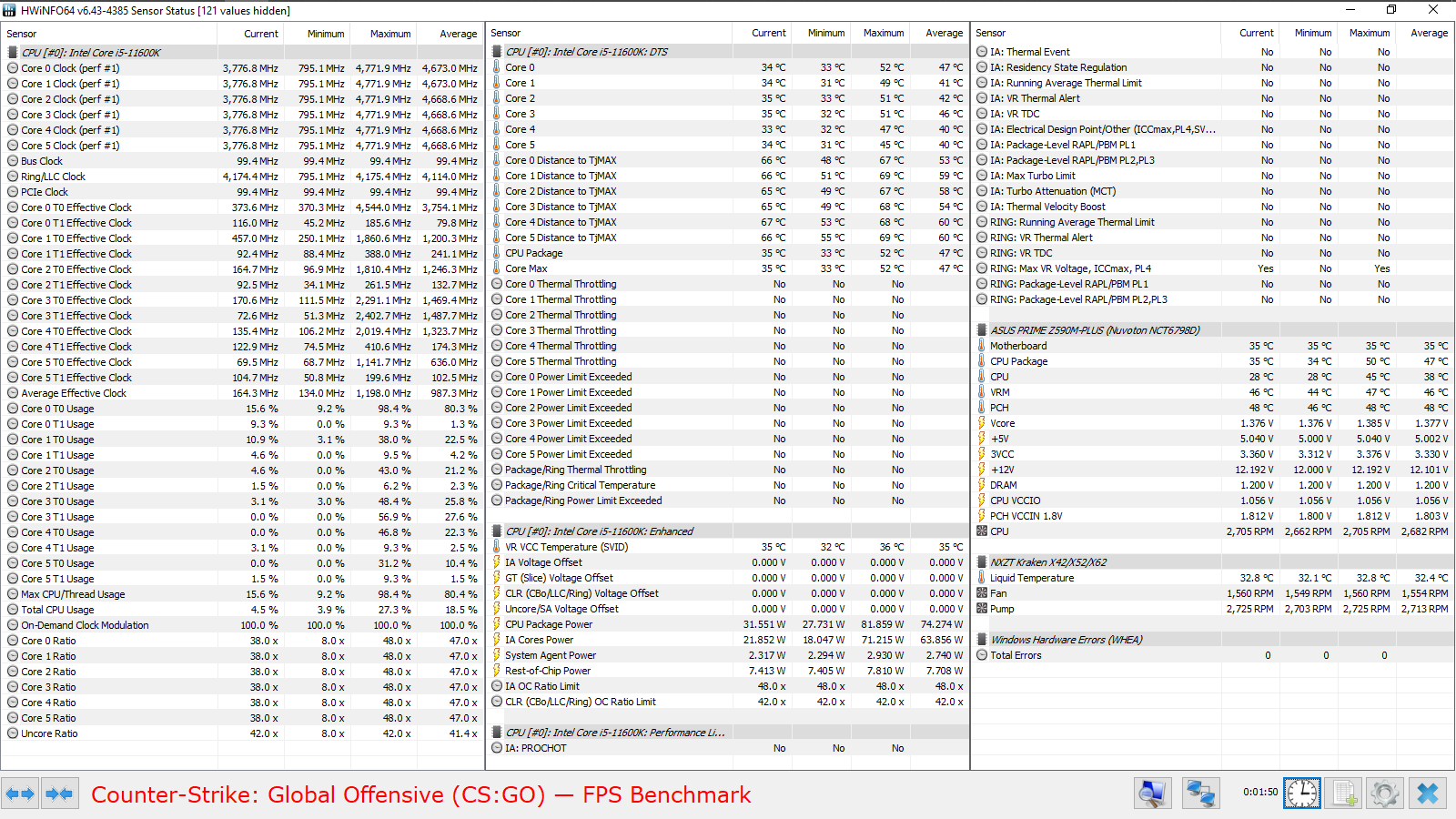 Эксперименты проводились на прошивке 1017 (12.07.2021), обновление данных в HWiNFO64 происходило с периодичностью 500 мс (Pooling Period). Тест кадровой частоты FPS Benchmark в CS:GO запускался с такими настройками — 1, 2.