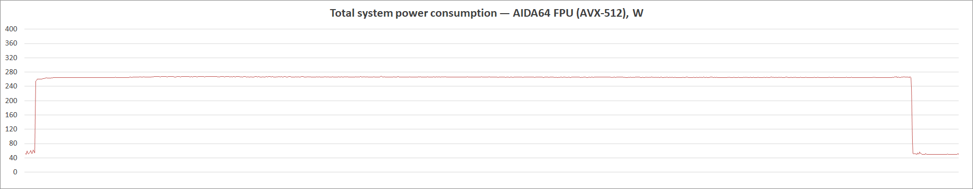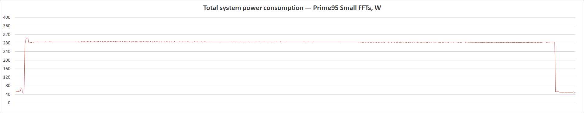 Потребление в простое подобралось к 56 Вт, а при нагрузке пики были следующими — 292, 262 и 253 Вт.