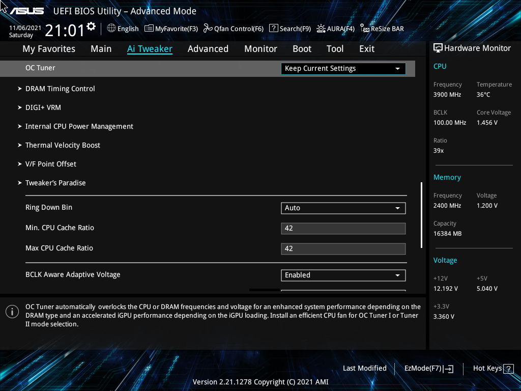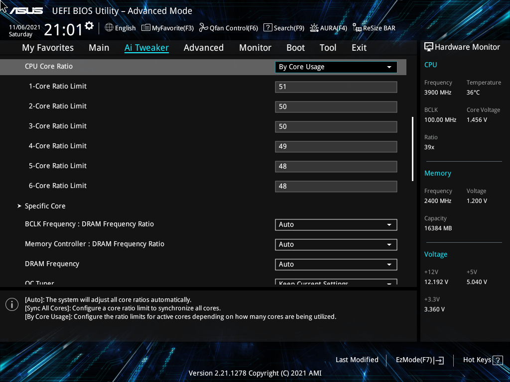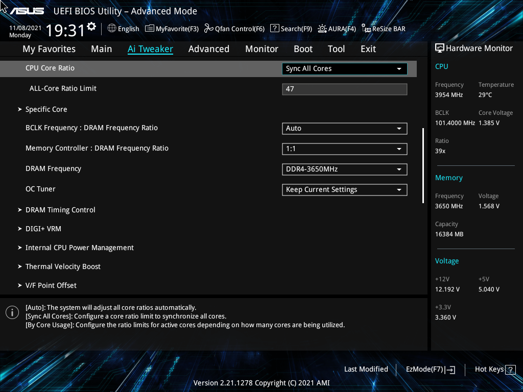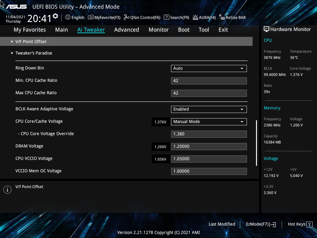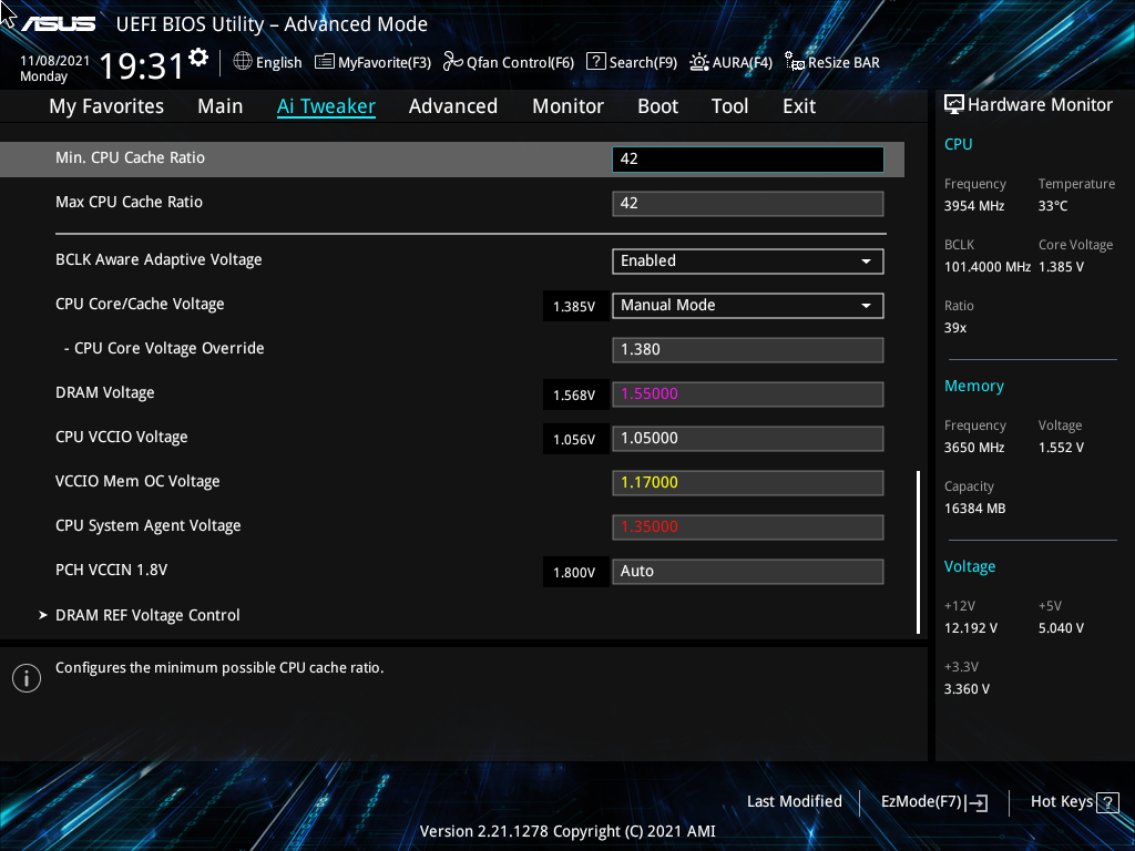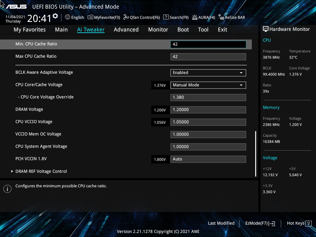 Наибольших успехов возымел разгон по динамической схеме установки множителя, она приобрела вид 51-50-50-49-48-48. Сопровождалось это Level 4 LLC и 1,475 В CPU Core Voltage Override. Кольцевая шина с небольшим значением SA Voltage оказалась стабильной при x42. Общая идея этого подхода изложена в обзоре ASRock Z590 Extreme.