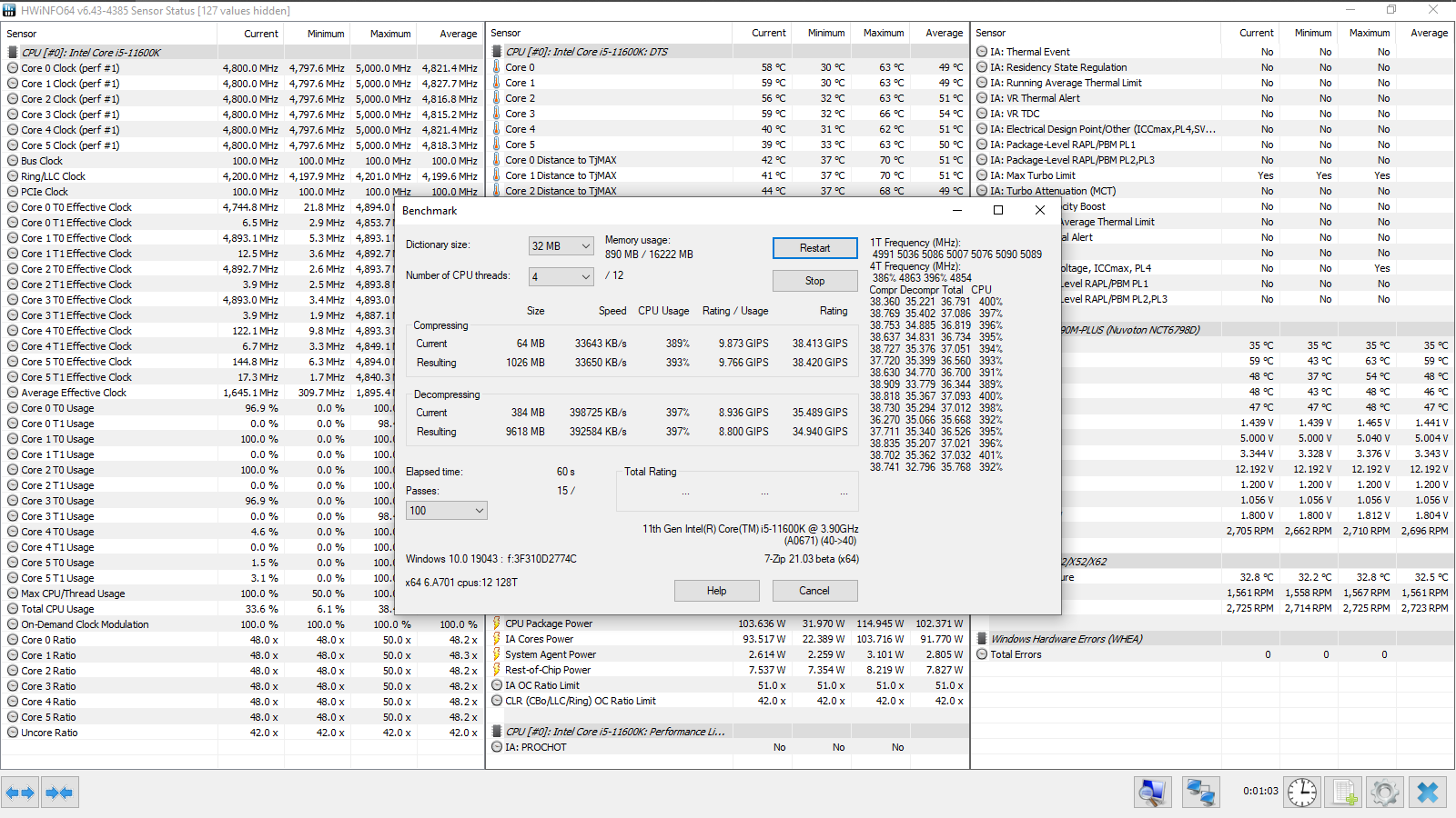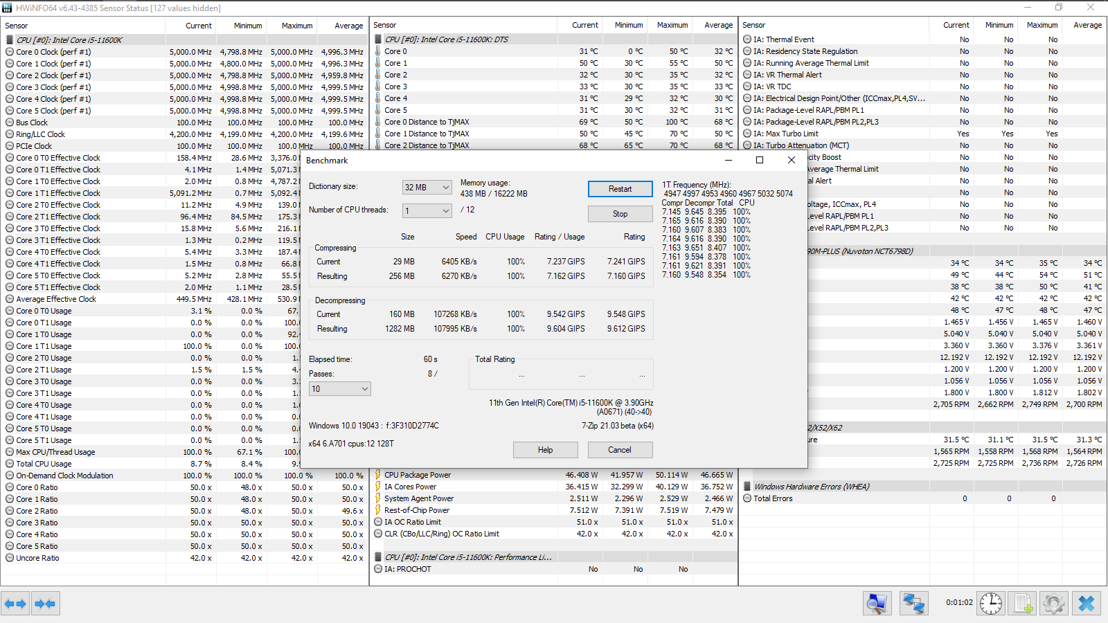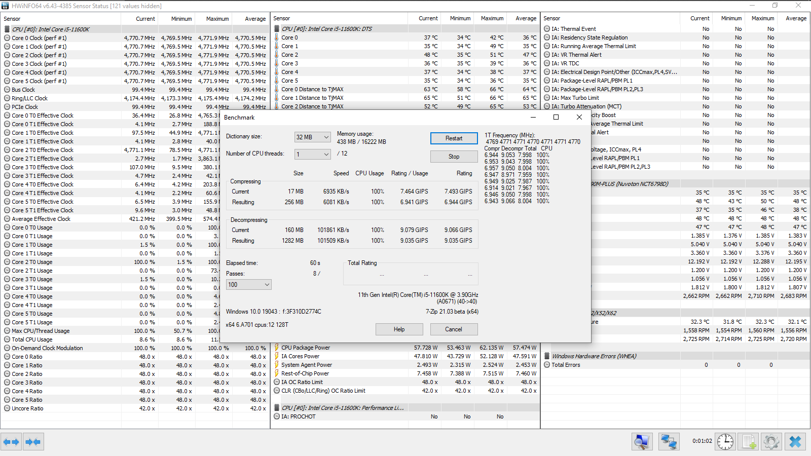 Разовые всплески частоты ЦП больше не видны с четырьмя и более потоками в бенчмарке 7-Zip.