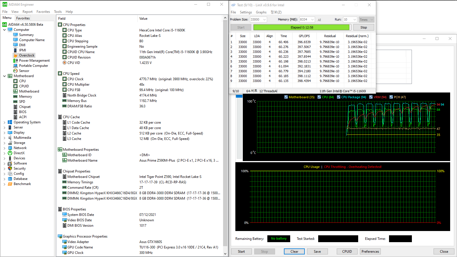 Быть может, на сниженном напряжении будет больше стабильности? Именно такое необходимо для работы с LinX (AVX-512), чтобы избежать перегрева ядер ЦП. Прежде наш тестовый процессор был работоспособен при 4,8 ГГц. Нет, ничего из названного здесь не подтвердилось. Есть замечания к стабильности напряжения и ниже 1,5 В, они очевидны, ведь избыточное, подобранное на грани перегрева процессора, не помогло при работе с 4,8 ГГц, частоту пришлось снизить до 4771 МГц и, балансируя на грани троттлинга с обычными оборотами для всех компонентов AIO, завершить 10 этапов в LinX с одинаковыми невязками. Базовая снижалась до 99,4 МГц. Установленные 1,38 В CPU Core Voltage Override сопровождались Level 6 LLC, так в ходе пиковых нагрузок было превышение запланированного уровня, но это оправданнее, чем понижение величины вместе с Level 5 и утрата общей стабильности. Форсаж 1 В для SA Voltage привёл к стабилизации кольцевой шины на частоте 4174 МГц, другими словами, её разгон вышел весьма условным, вновь меньшим, чем обычно.