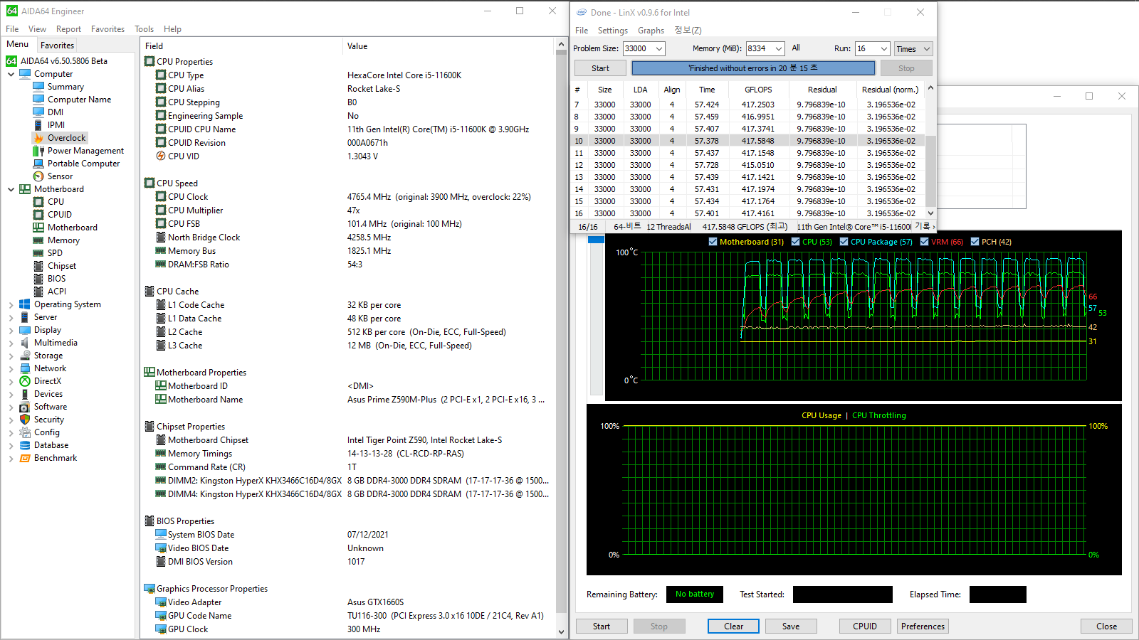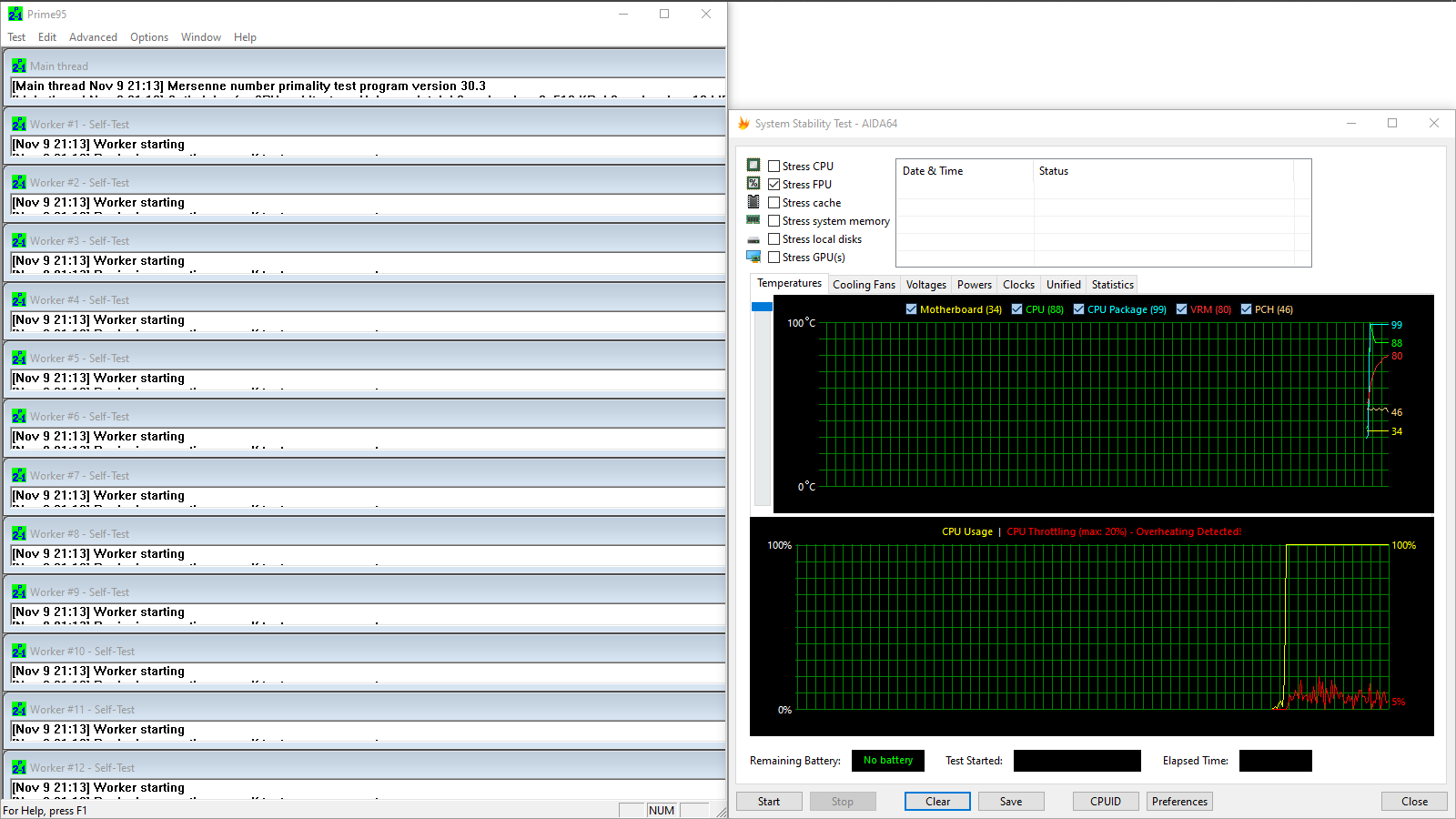 Стресс-тесты без участия AVX-512 не приведут к появлению проблем со стабильностью (оно и понятно, ведь напряжения подаётся с избытком), однако и перегрева платы или процессора тоже нет.