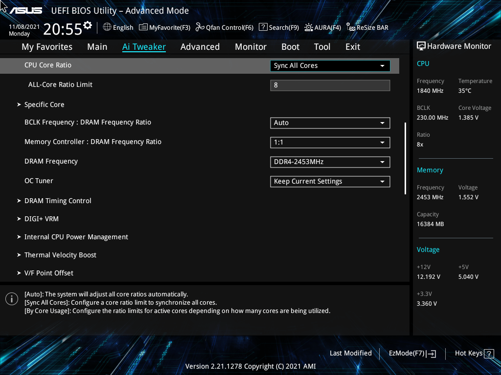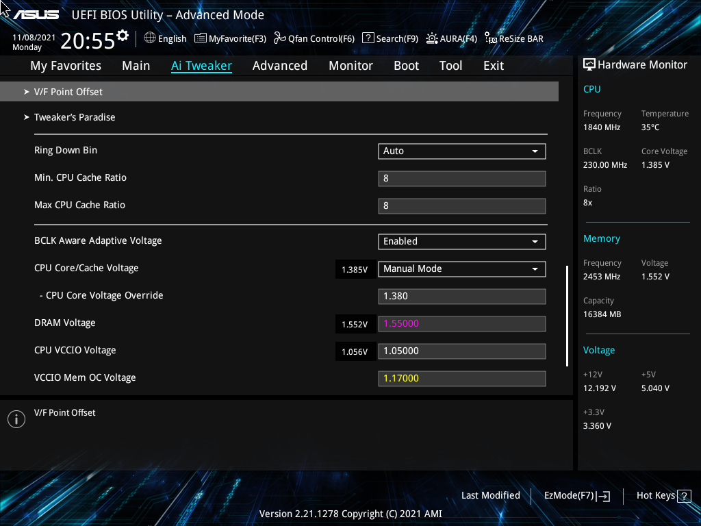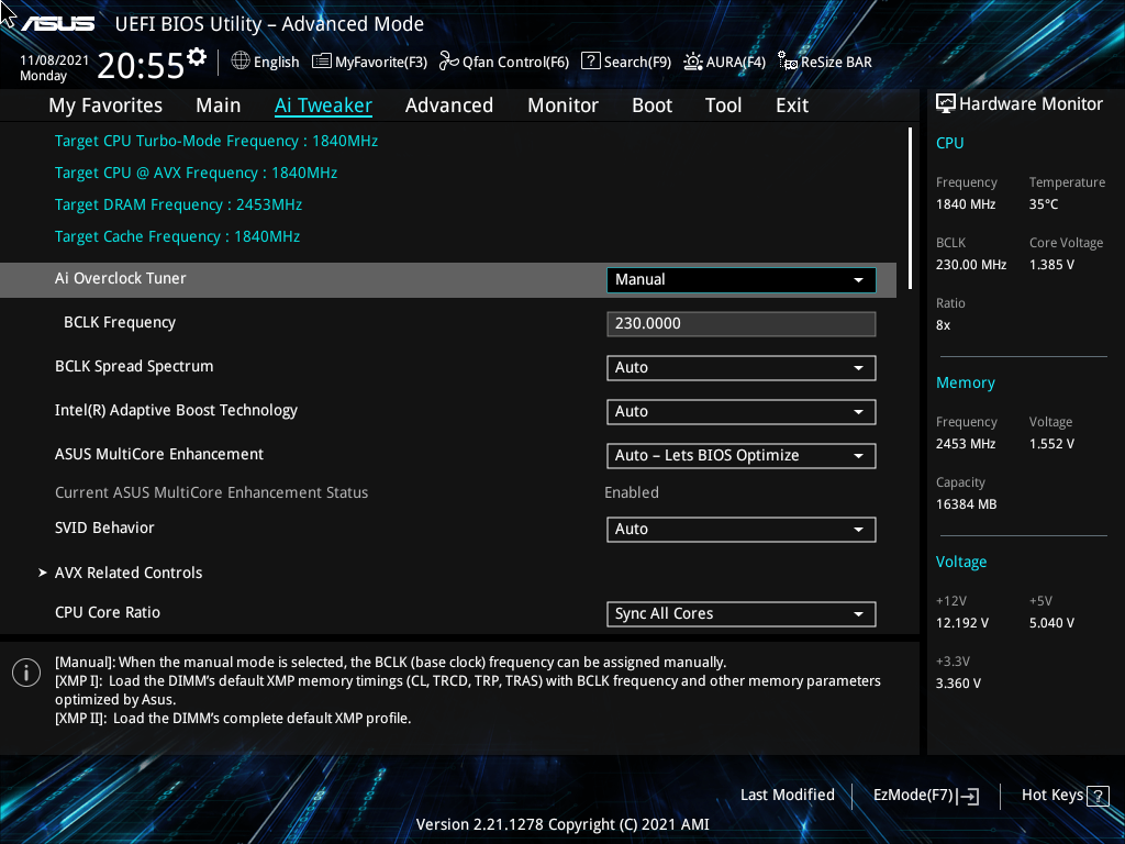 Снизив множители, проверим разгон базовой. 230 МГц стали числом, которое без затруднений давалось плате, дальнейшие меры требуют более тщательного подхода. Перед этим мы уже стали свидетелями работы как на чуть более высокой, относительно штатных 100 МГц, величине, так и на чуть сниженной отметке. Эти варианты куда более применимы в жизни, а к самой Prime Z590M-Plus вопросов нет в этой части испытаний, переразгон завершался загрузкой с безопасными параметрами, без нужды сброса CMOS вручную.