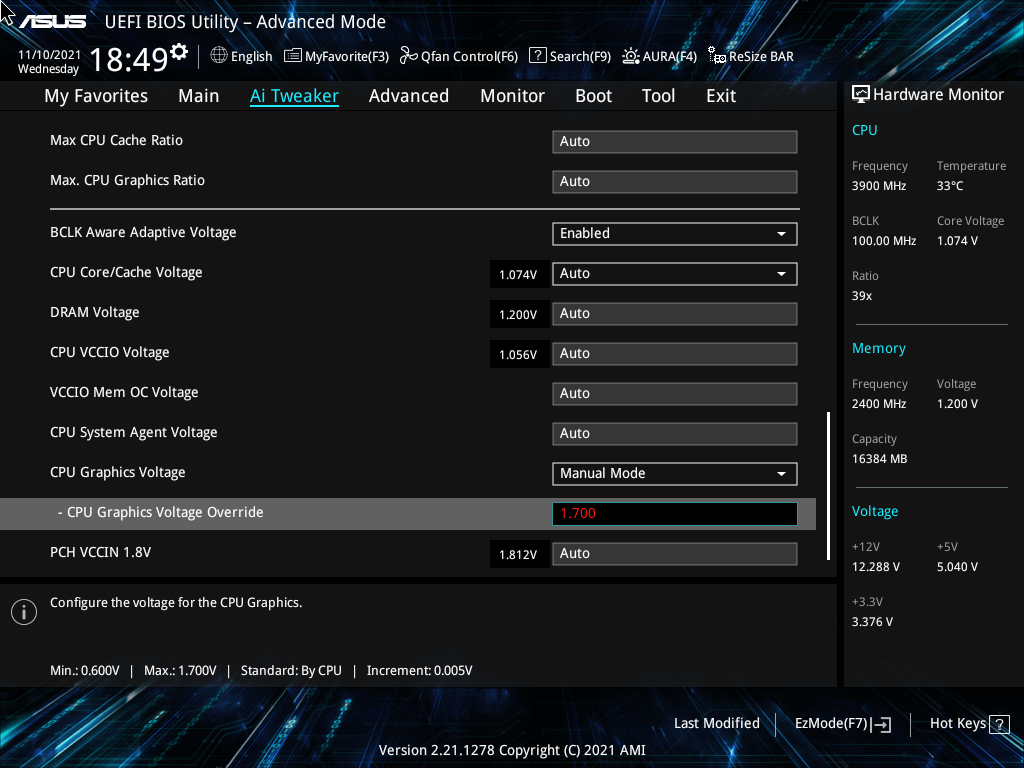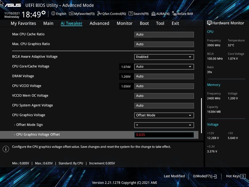 | CPU Graphics Voltage Override (В) | 0,6–1,7 | 0,005 |