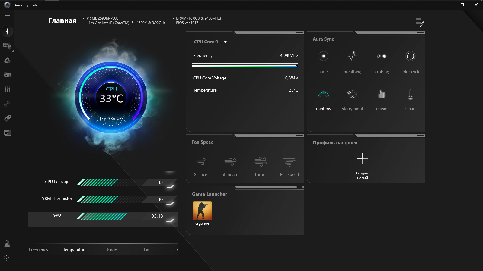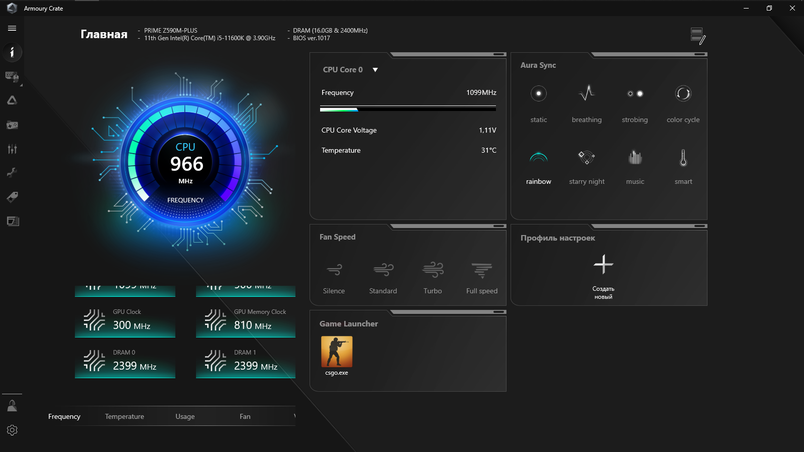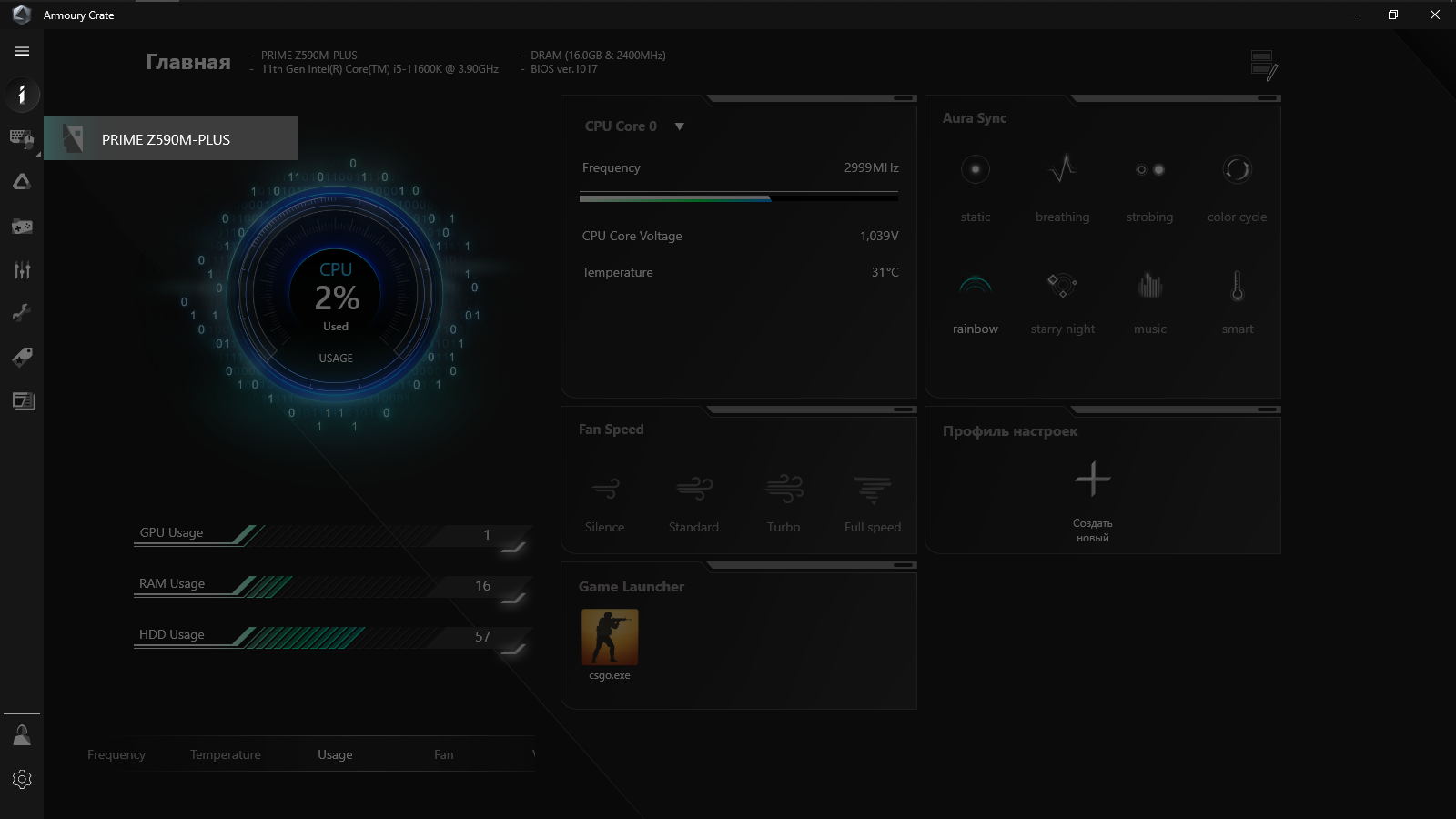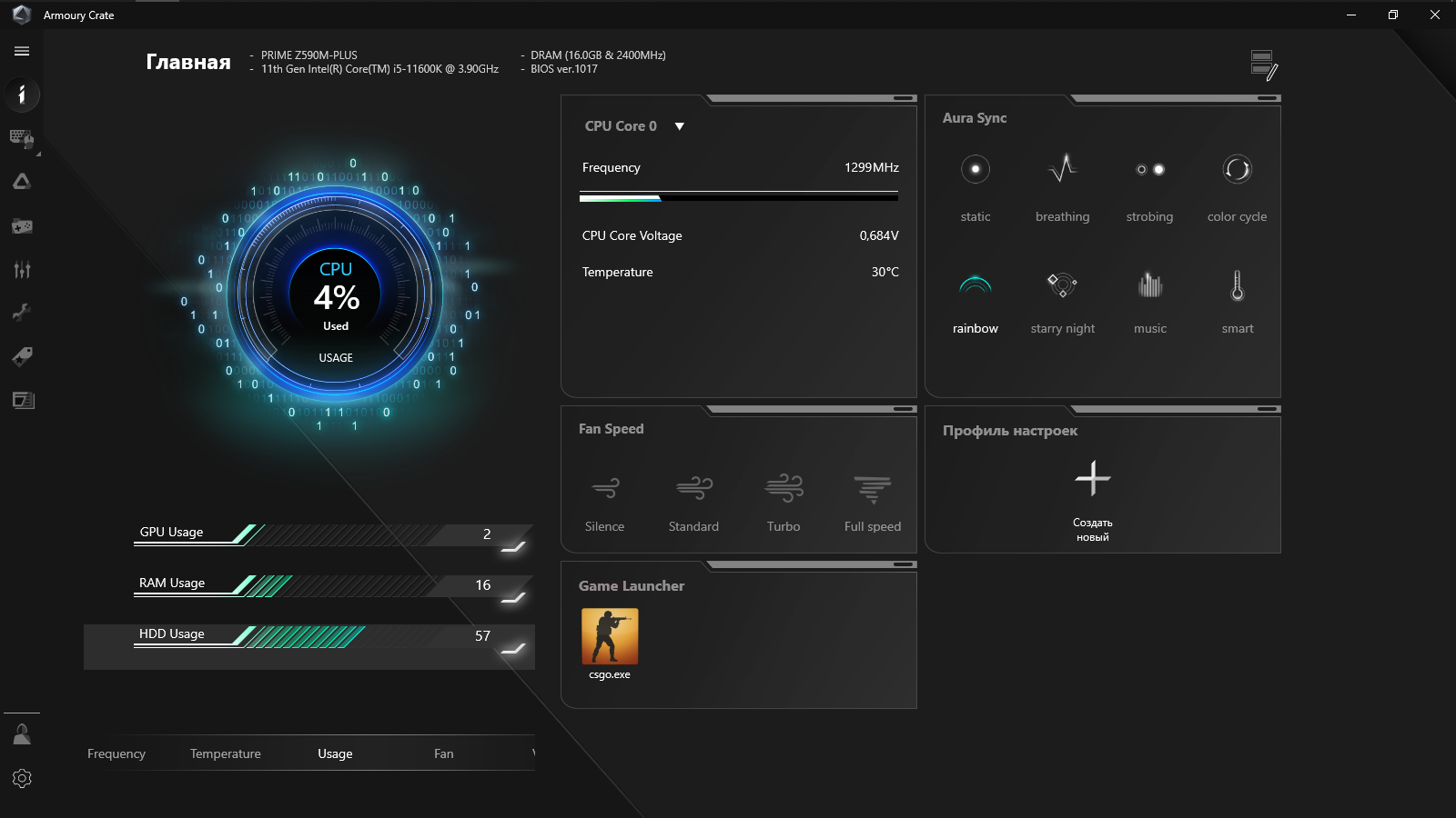 | Дополнительные возможности | Armoury Crate, Aura Sync, Fan Xpert 4, Thunderbolt header |