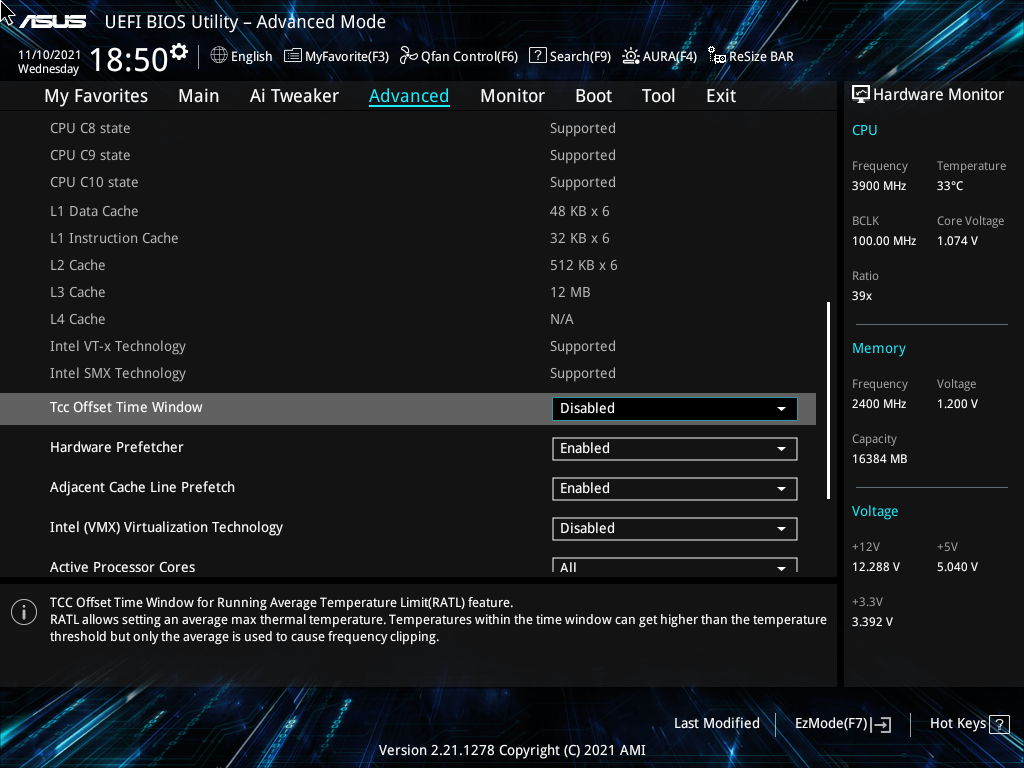 Здесь схема отрабатывала ровно так же, как и на TUF Gaming Z590-Plus WiFi: с несложными задачами частота ЦП была выше, как и питающее напряжение; использование всех потоков частоту на ядрах уравнивало, снижалось и напряжение. Нет проблем с температурами и стабильностью ПК.