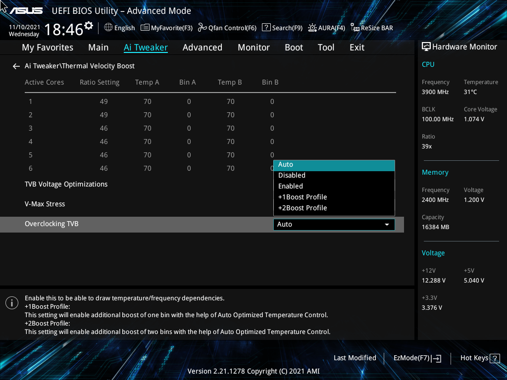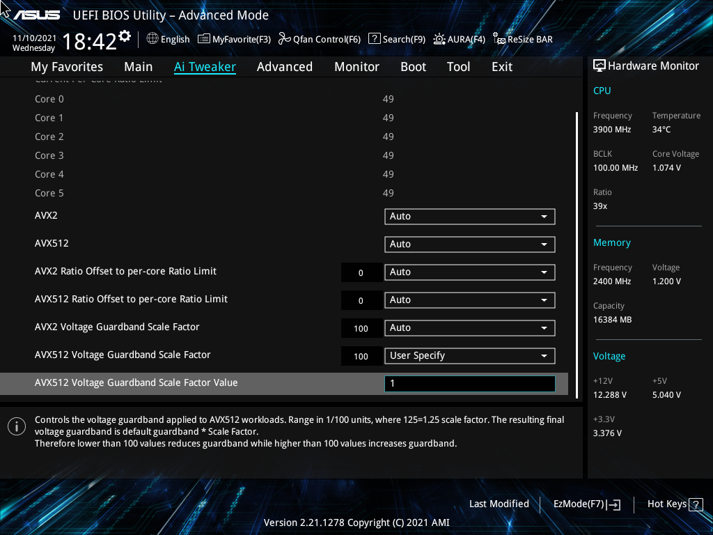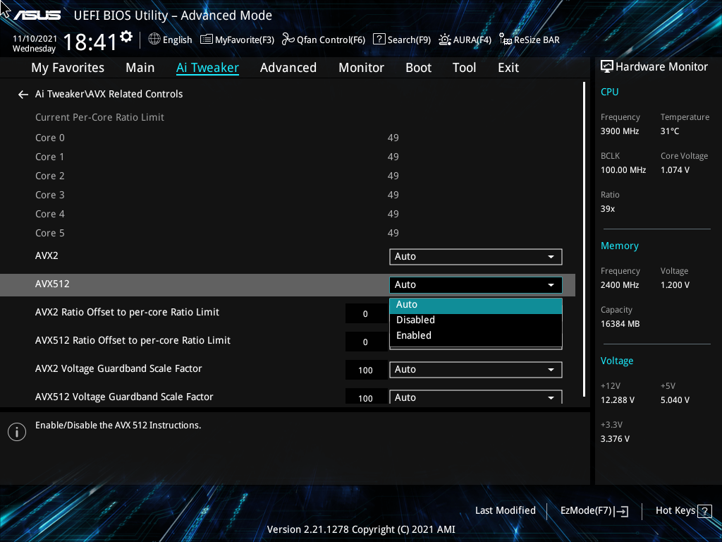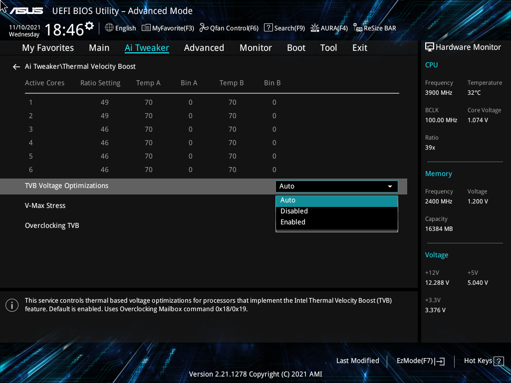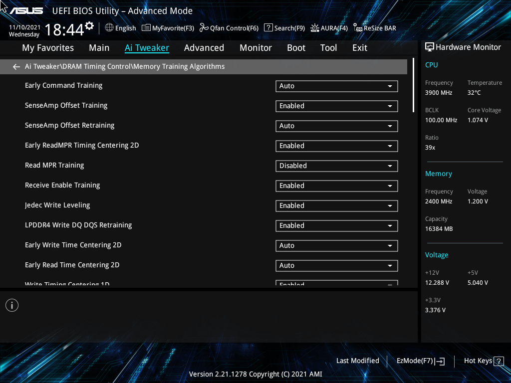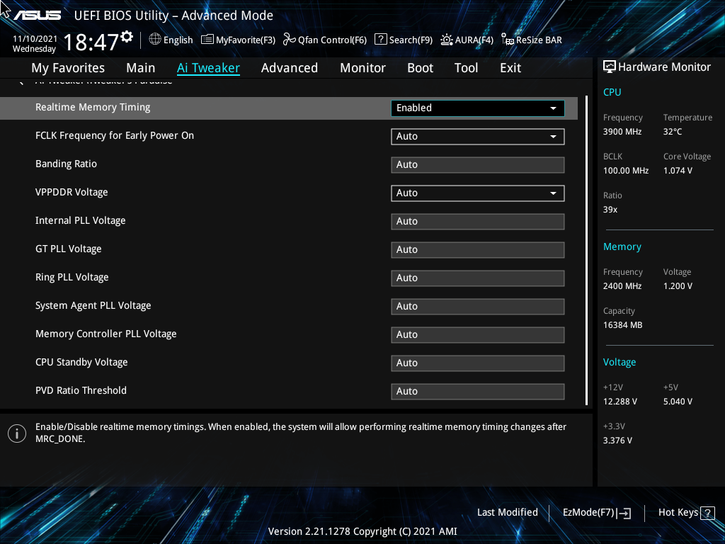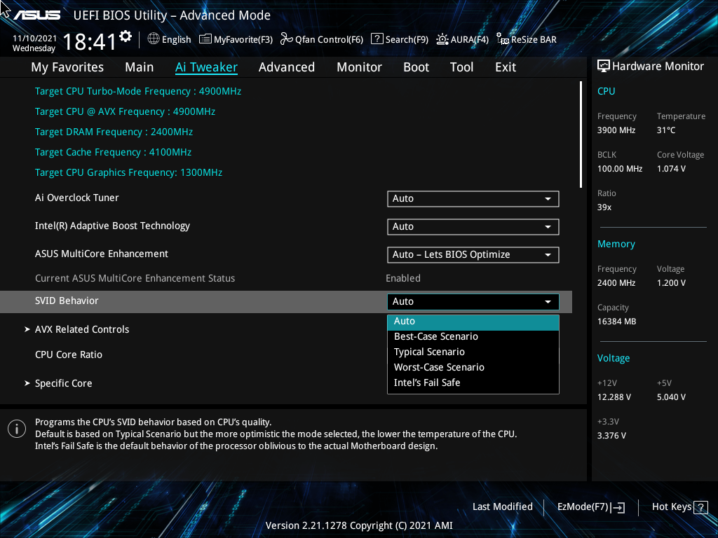 Раздел Ai Tweaker наполнен ровно так же, как у более статусной TUF Gaming Z590-Plus WiFi, то есть ни о каких упрощениях искусственного характера тут нет и речи. Вместе с тем, наблюдение за уровнями SA и IO 2 Voltage всё так же отсутствует.