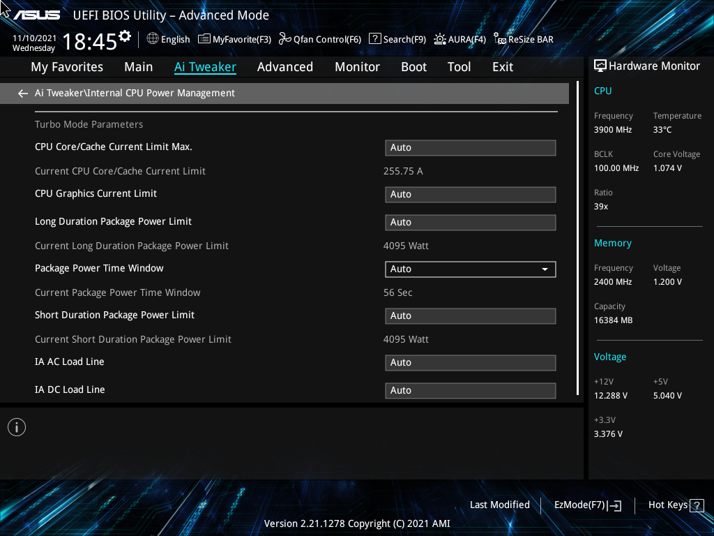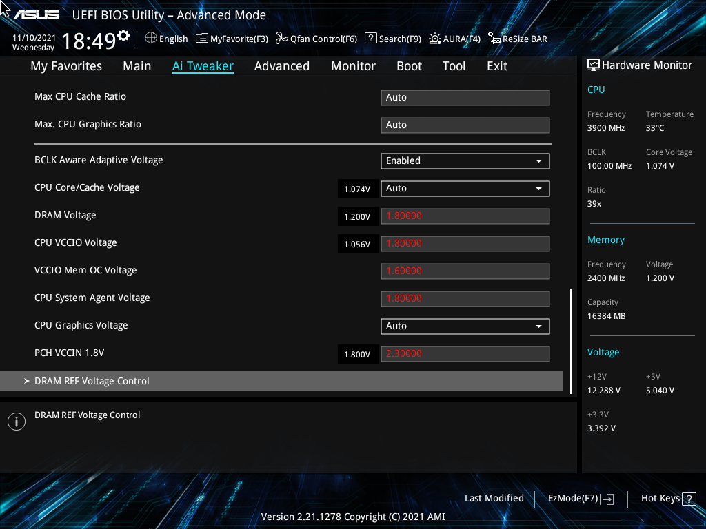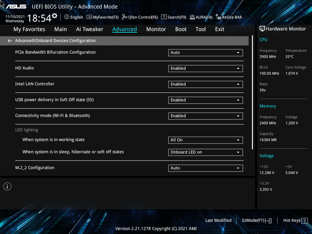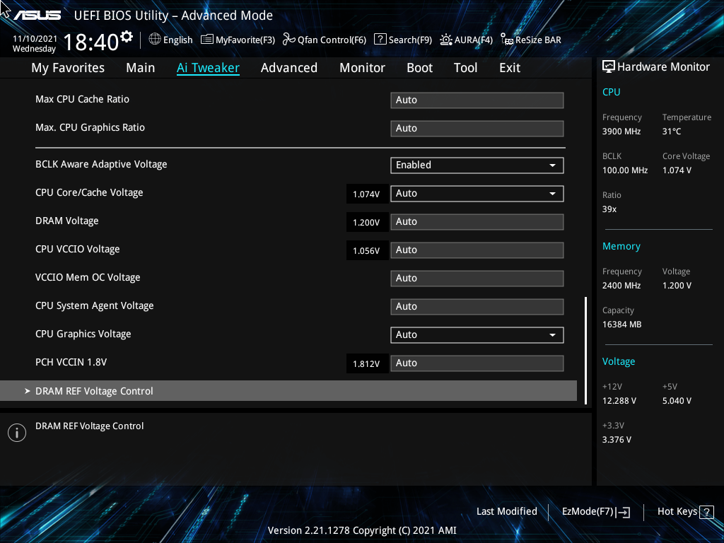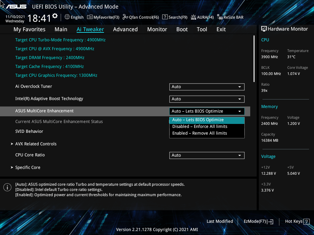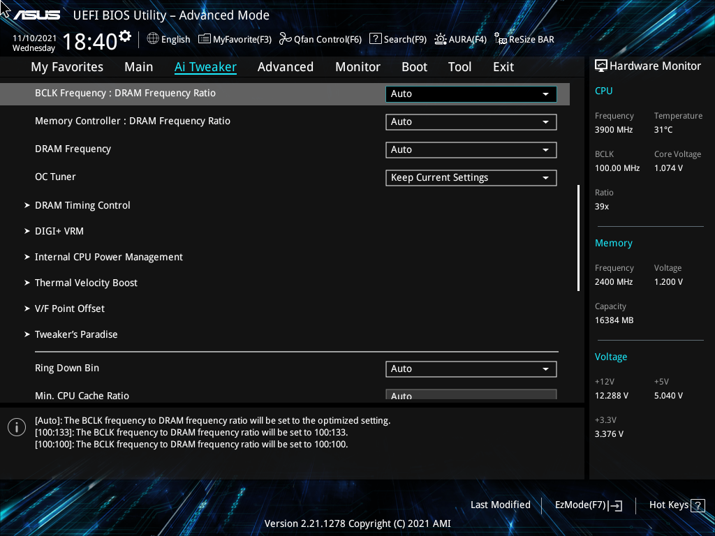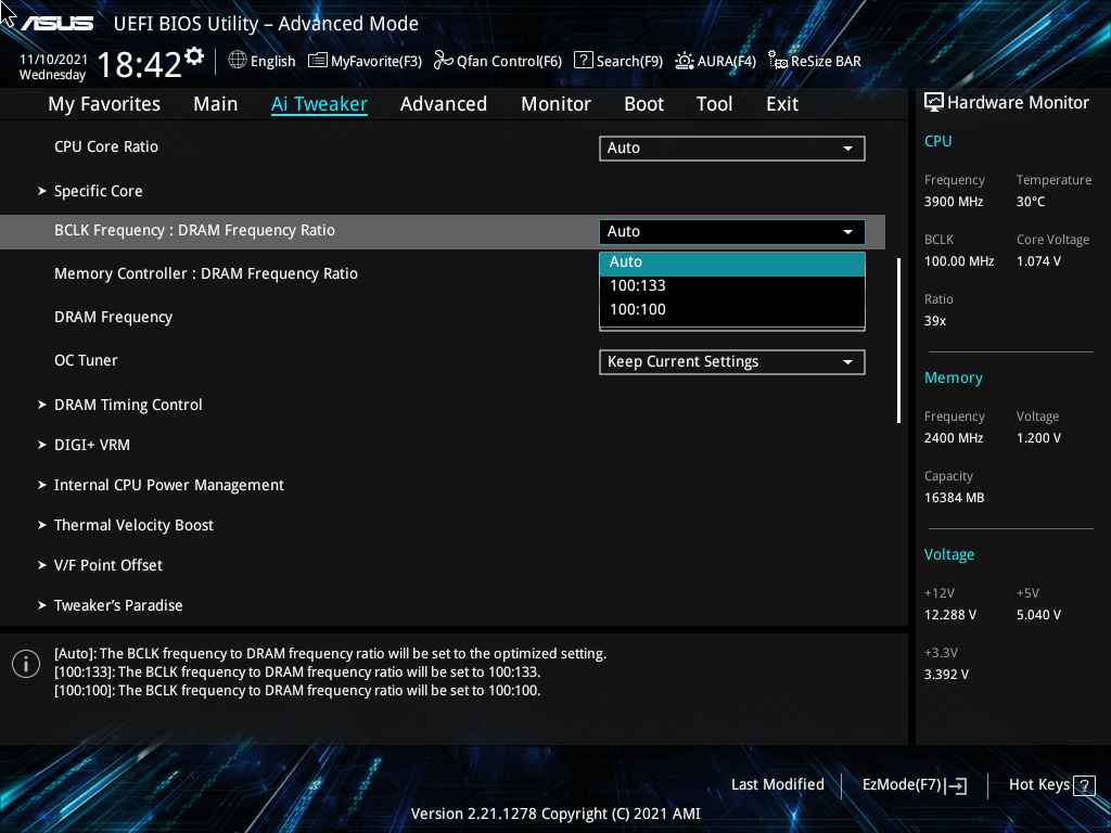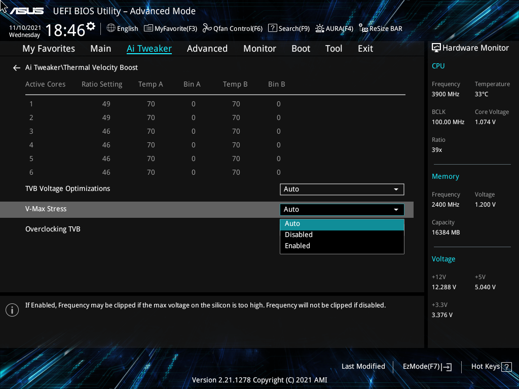 Раздел Ai Tweaker наполнен ровно так же, как у более статусной TUF Gaming Z590-Plus WiFi, то есть ни о каких упрощениях искусственного характера тут нет и речи. Вместе с тем, наблюдение за уровнями SA и IO 2 Voltage всё так же отсутствует.