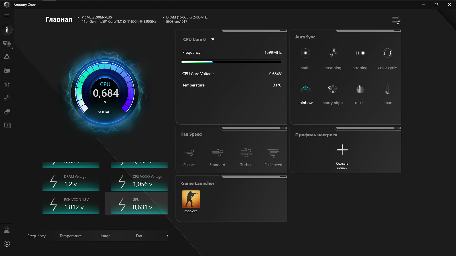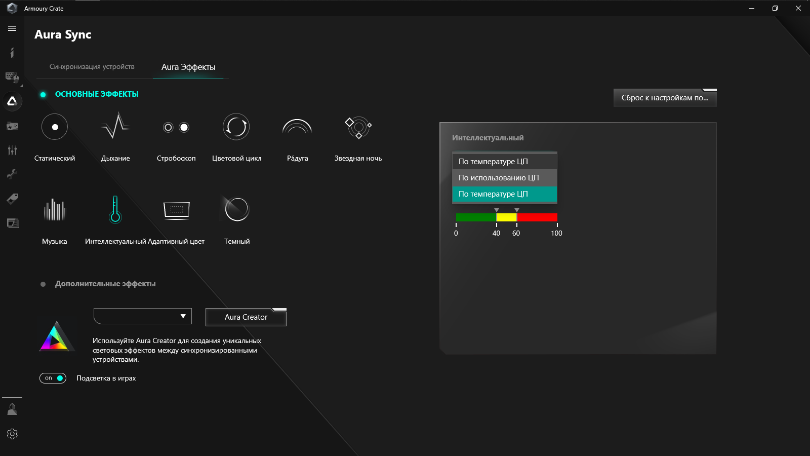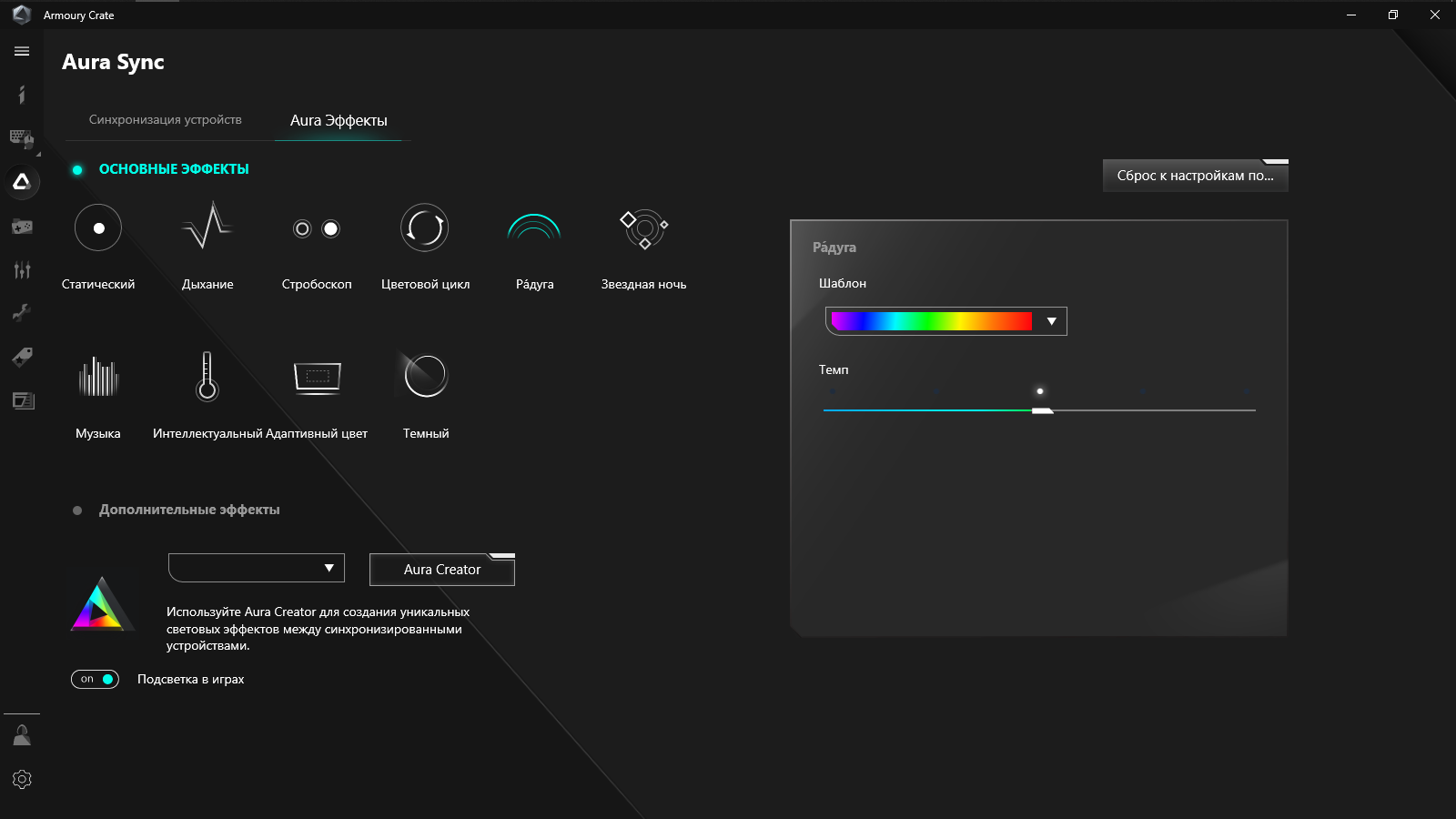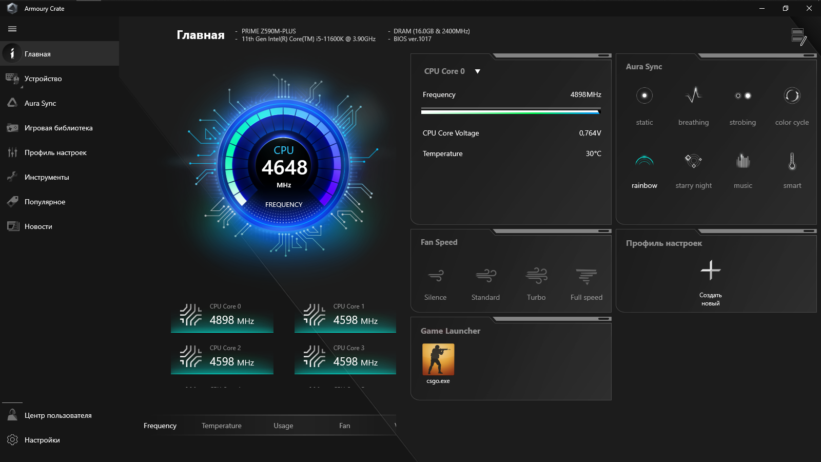 Aura Sync поможет объединить все элементы с подсветкой общим сценарием мерцания. Механизм един для всех плат ASUS, допускается создание собственного при содействии инструмента Aura Creator.