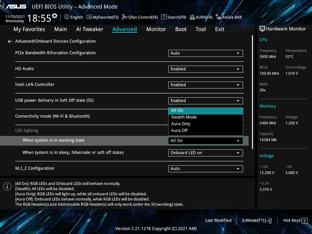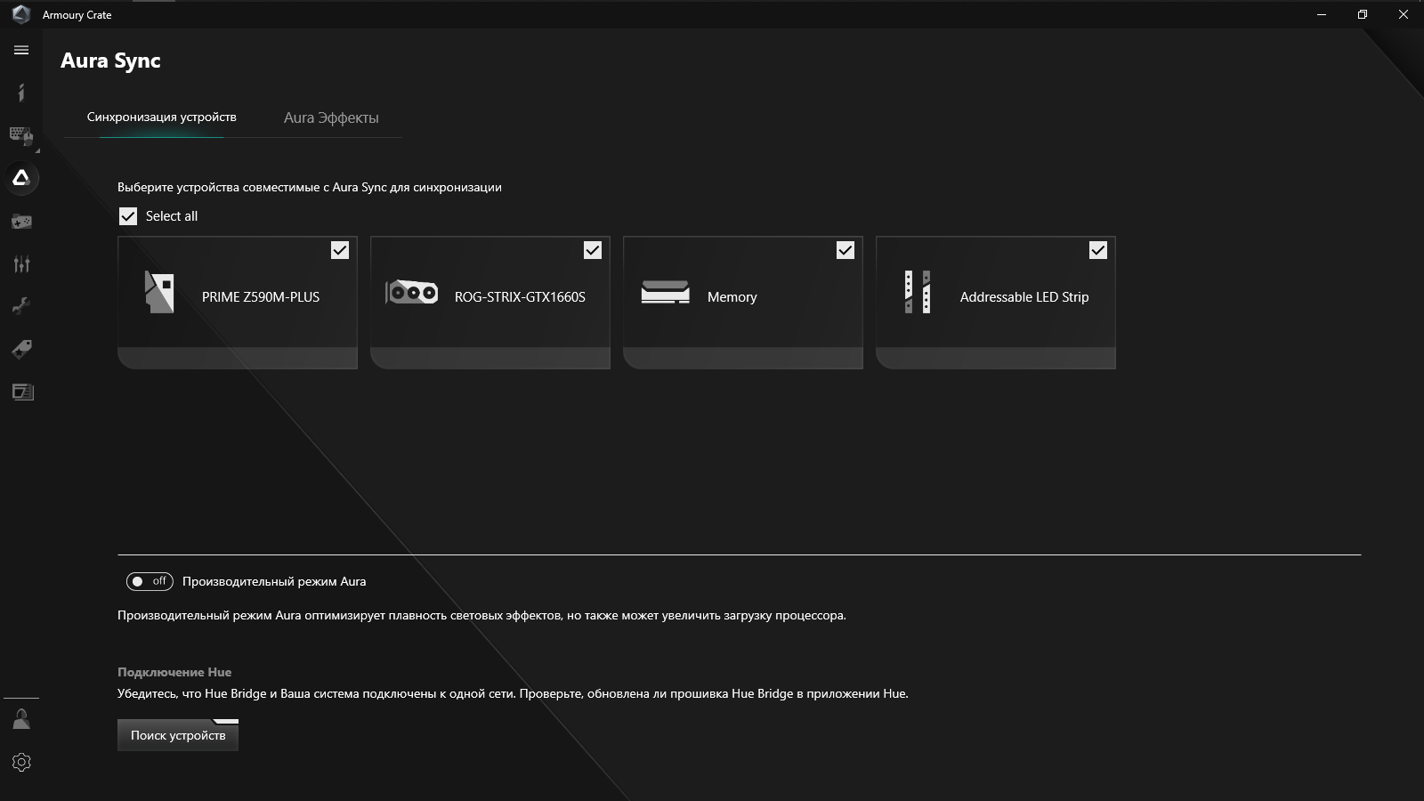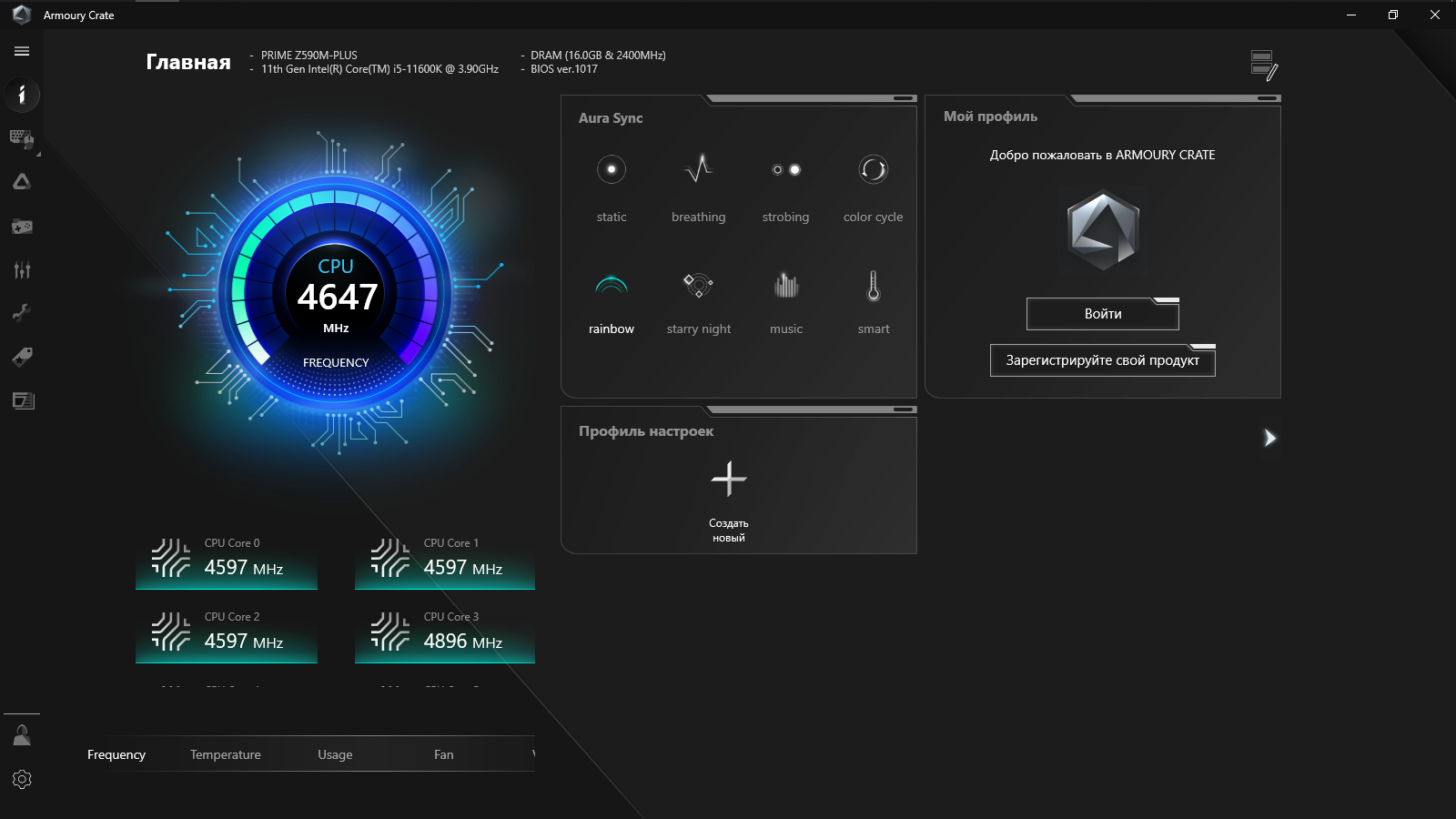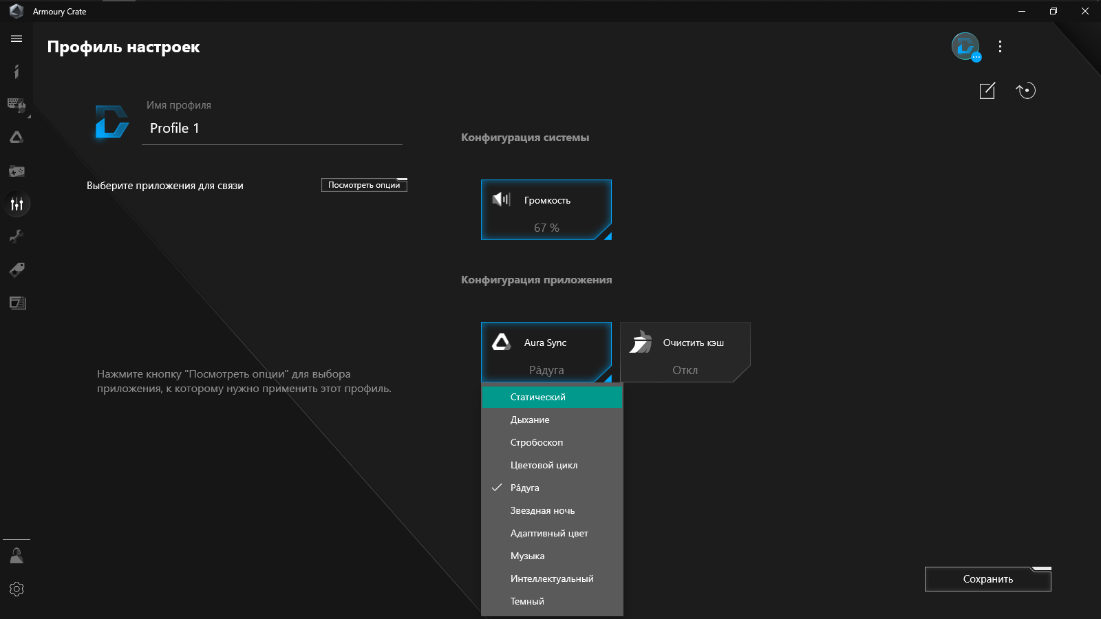 Aura Sync поможет объединить все элементы с подсветкой общим сценарием мерцания. Механизм един для всех плат ASUS, допускается создание собственного при содействии инструмента Aura Creator.