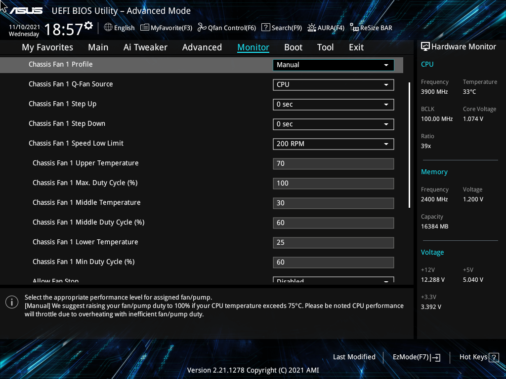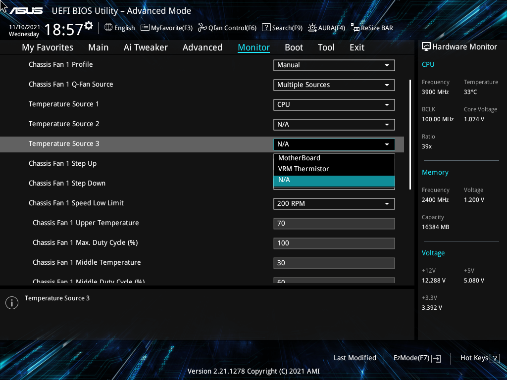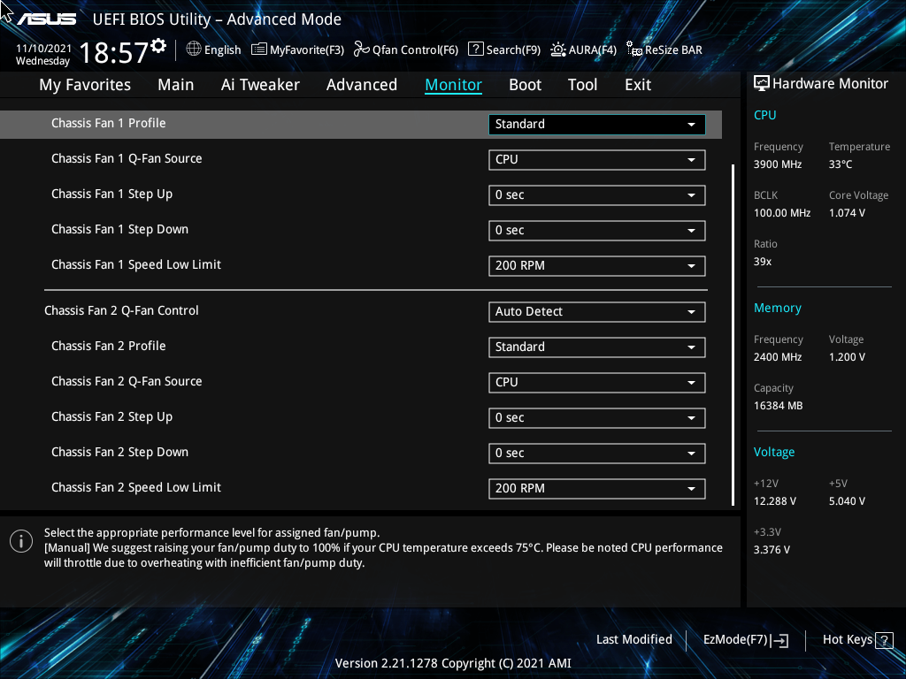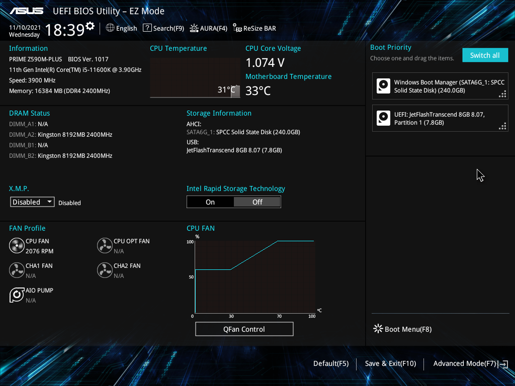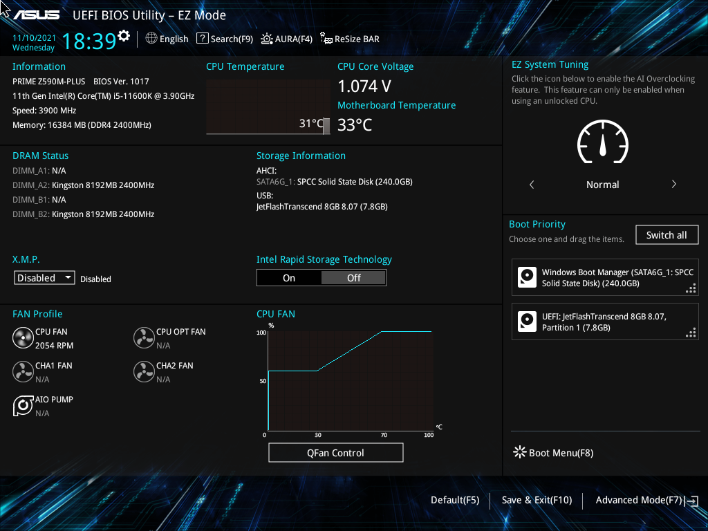 Базовая наладка происходит из простого режима Ez Mode, где доступны рядовые операции вроде установки времени, активации XMP и выбора загрузочного устройства. Уже здесь можно увидеть наличие независимых алгоритмов управления вентиляторами в числе четырёх штук.