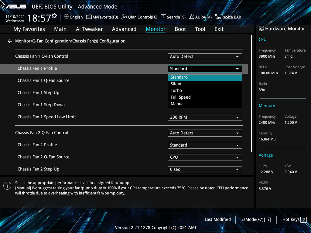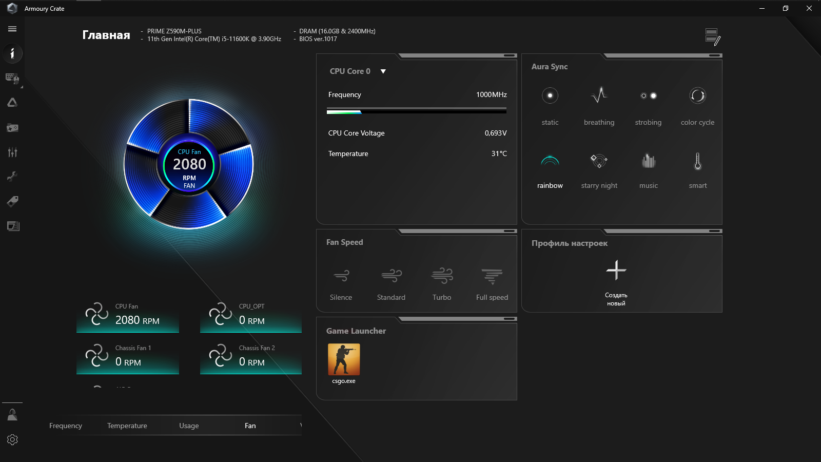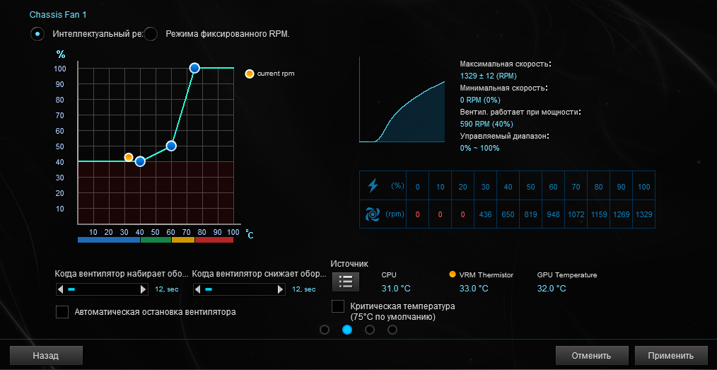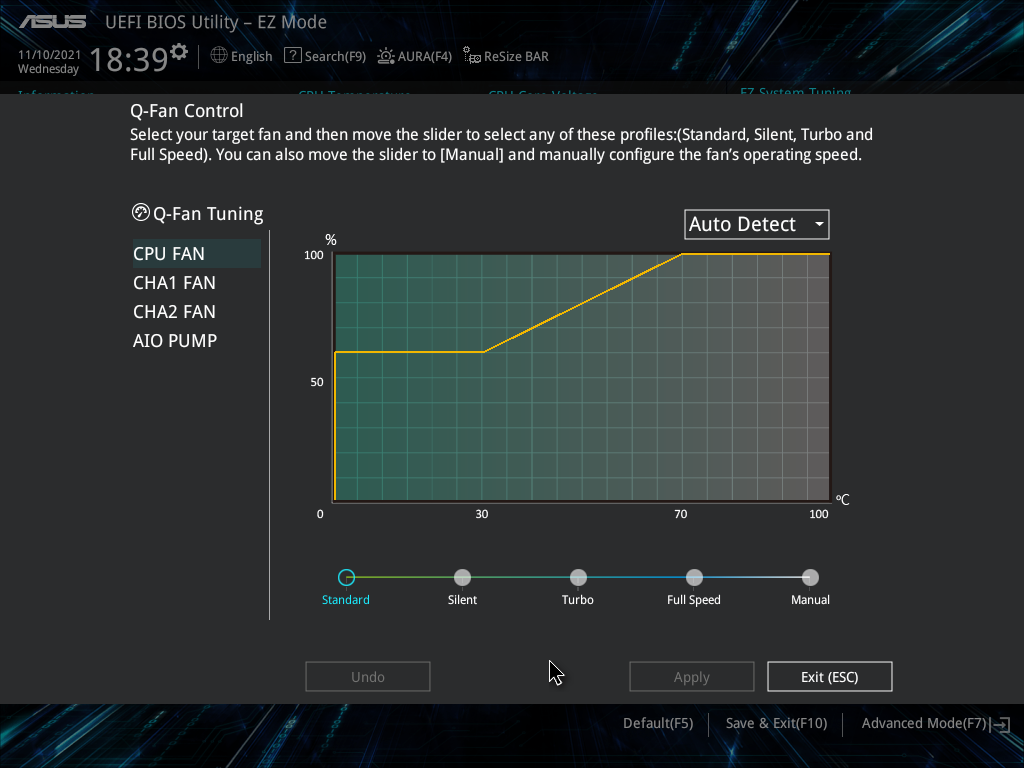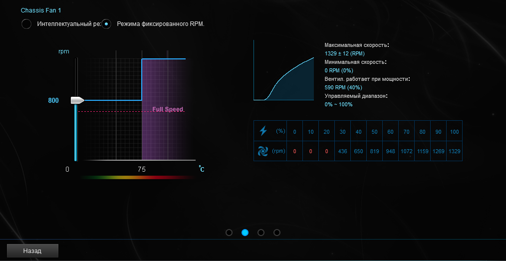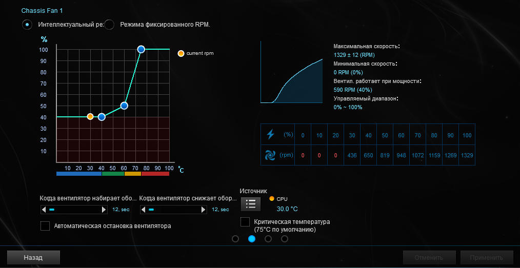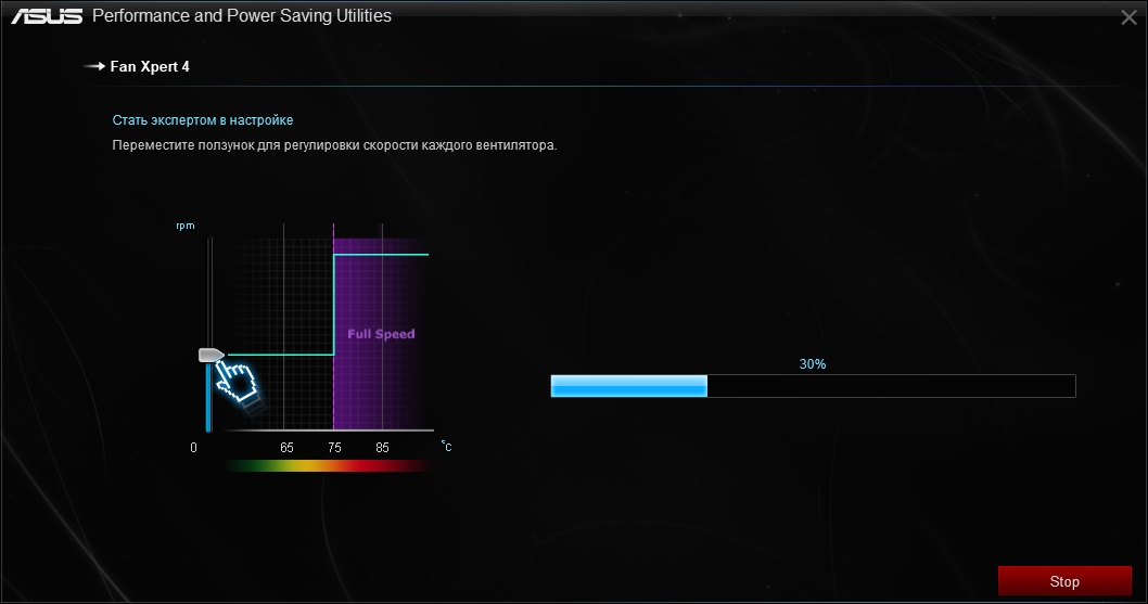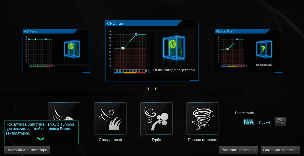 Четыре независимых алгоритма могут быть привлечены для контроля работы пяти охладителей разных типов исполнения. Помимо готовых профилей работы, сформировать можно и собственный. Сразу, без калибровки устройств, будет доступен вариант с нулём процентов, что прежде было проблемой для плат от ASUS.