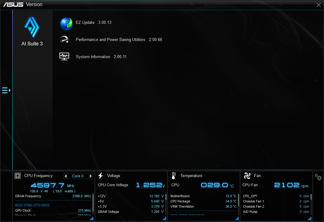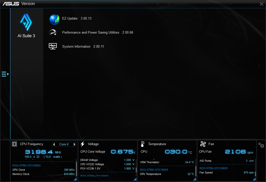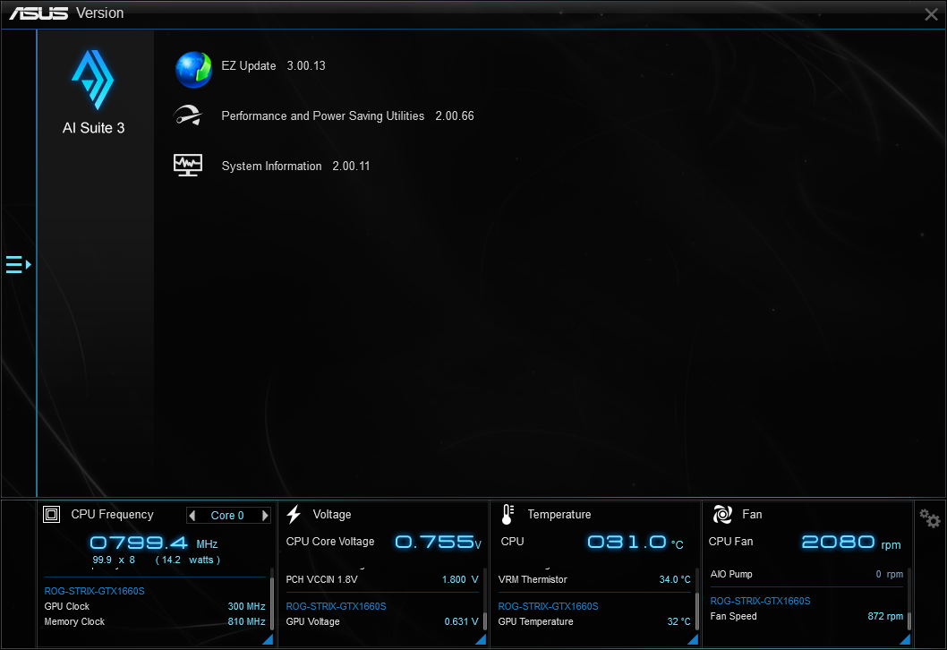 В случае использования фирменной видеокарты, сведения о ней будут доступны в Ai Suite 3, как на примере ниже. Что до самой материнской платы, то ничего нового относительно UEFI здесь не найти. Performance and Power Saving Utilities образуют классический список с поштучным доступам к каждому модулю.