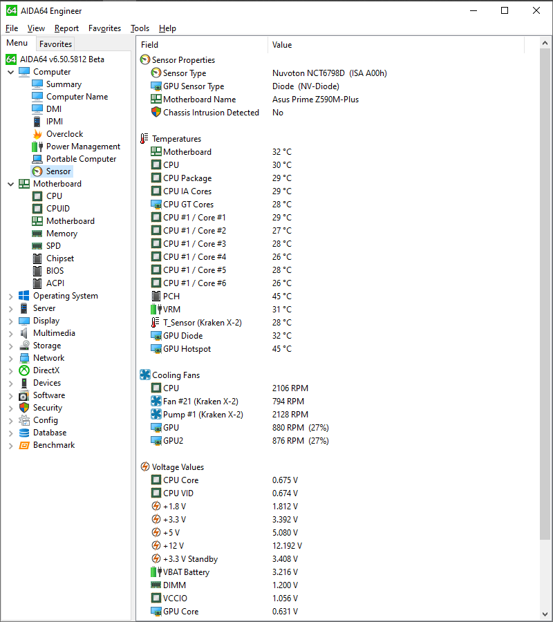 В фирменной среде управления NZXT CAM режим работы помпы устанавливался на 100% (2725 об/мин), для вентиляторов я остановился на 88% (1575 об/мин). Это не вызывало явного акустического дискомфорта рядом со стендом. Форсаж настроек происходил сразу по загрузке ОС, после чего NZXT CAM закрывался (выгружался), чтобы исключить влияние на загрузку ядер CPU и опрос датчиков другими утилитами. ПО HWiNFO64 корректно взаимодействовало с доступными переменными у AIO, отображая все текущие значения физических величин. В отдельно указанных случаях обороты вентиляторов были максимальными.