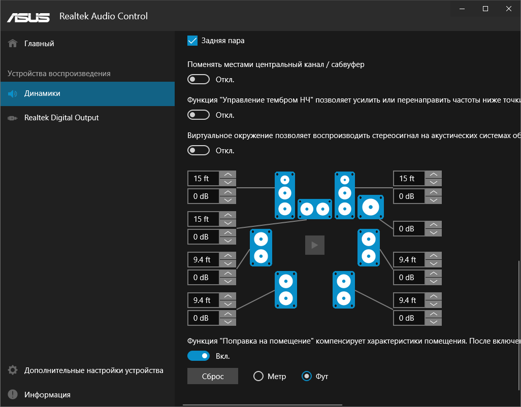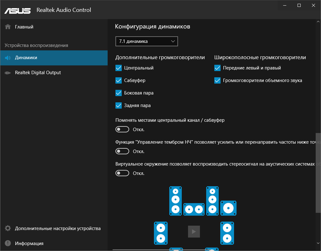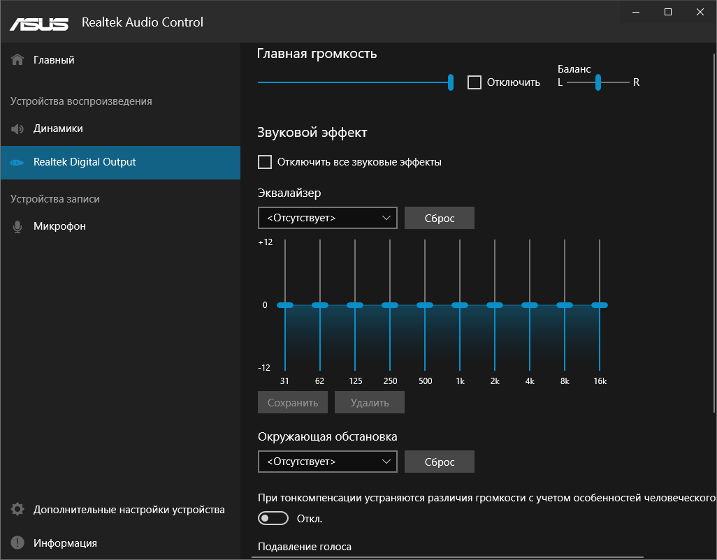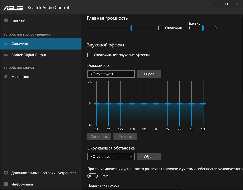 Ввиду использования самого простого кодека и отсутствию бонусных продуктов для работы со звуком, наладка будет проходить исключительно при содействии конфигуратора от Realtek. Он обладает привычным набором функций. Каких-либо чудес в подаче материала ожидать не стоит, звук стартового уровня и этим всё сказано. Используя фирменные схемы, можно пытаться модифицировать поток, подчеркнув акценты на интересующих слушателя вещах. Но оттого глубины у баса не появится, равно как и более чистых ВЧ.