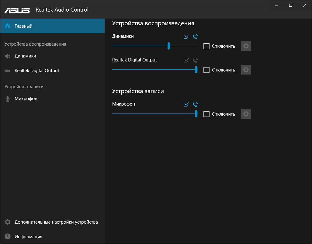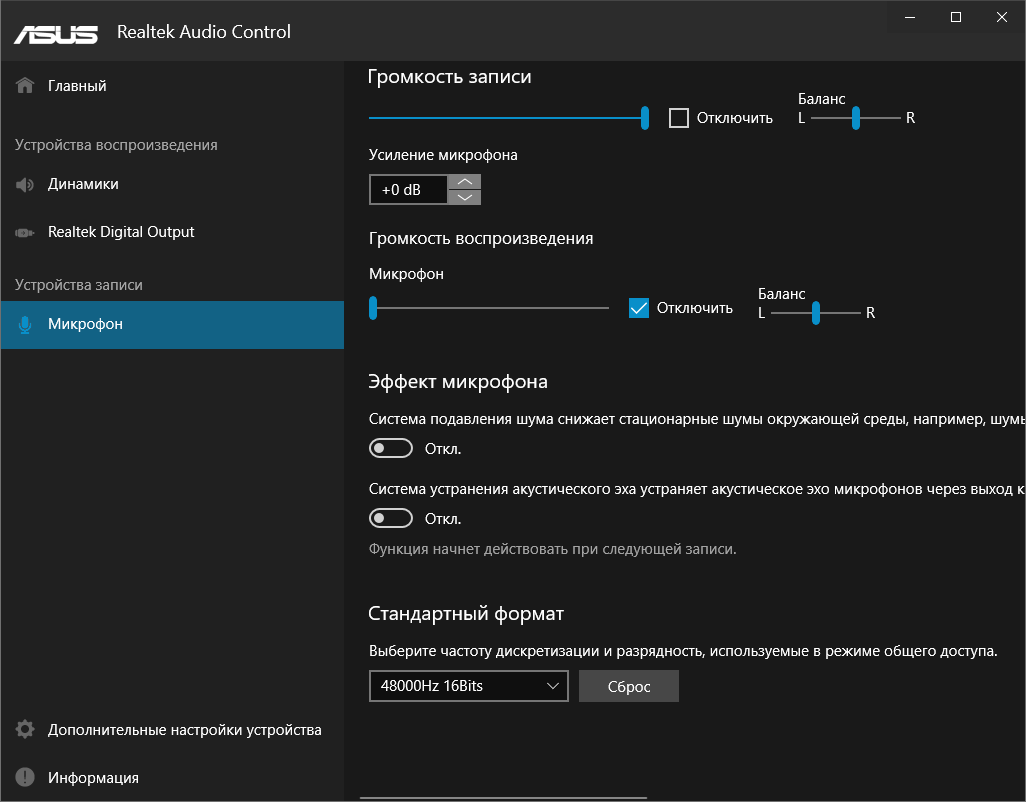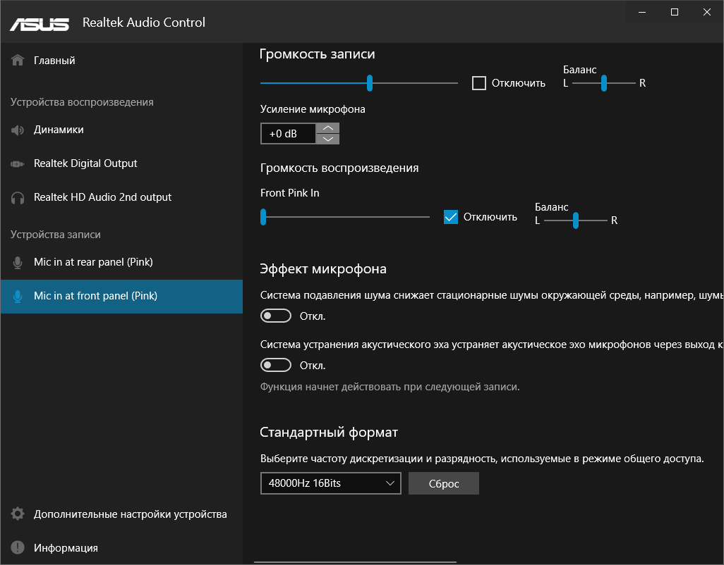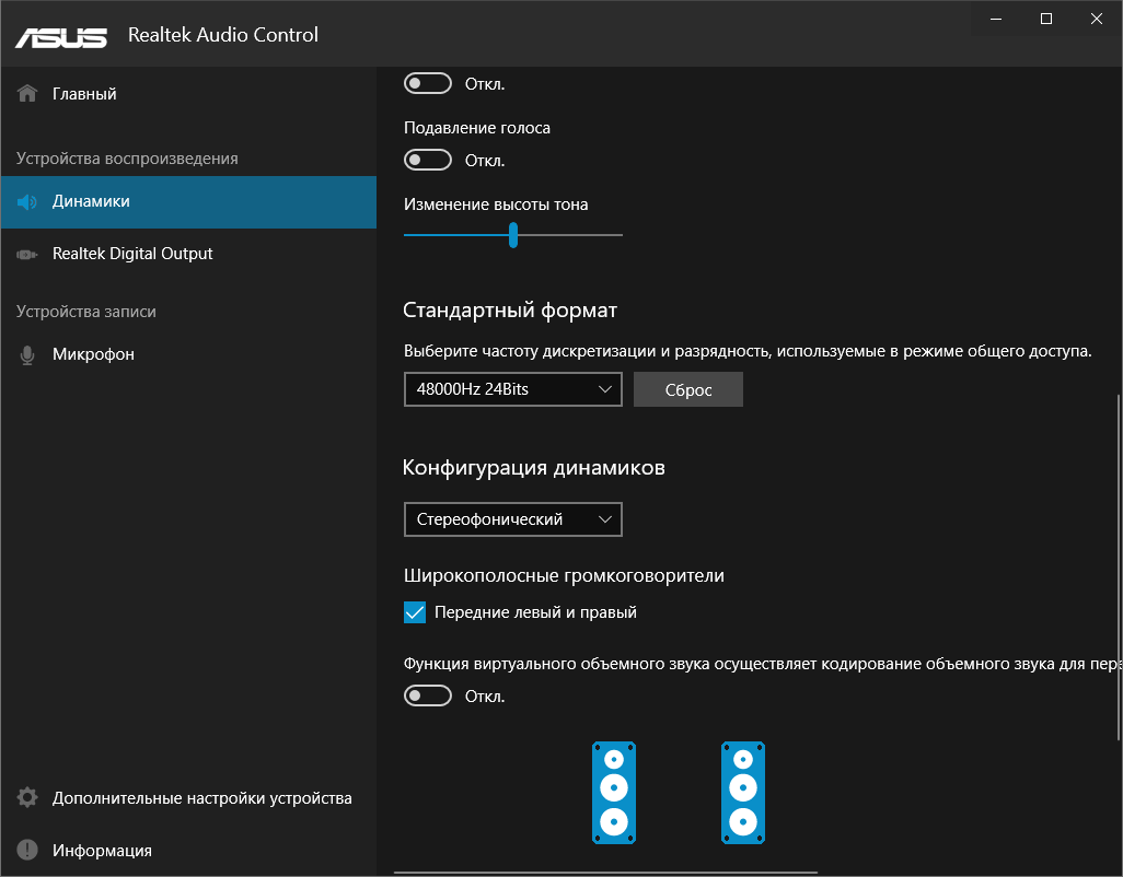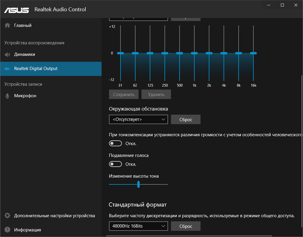 Ввиду использования самого простого кодека и отсутствию бонусных продуктов для работы со звуком, наладка будет проходить исключительно при содействии конфигуратора от Realtek. Он обладает привычным набором функций. Каких-либо чудес в подаче материала ожидать не стоит, звук стартового уровня и этим всё сказано. Используя фирменные схемы, можно пытаться модифицировать поток, подчеркнув акценты на интересующих слушателя вещах. Но оттого глубины у баса не появится, равно как и более чистых ВЧ.
