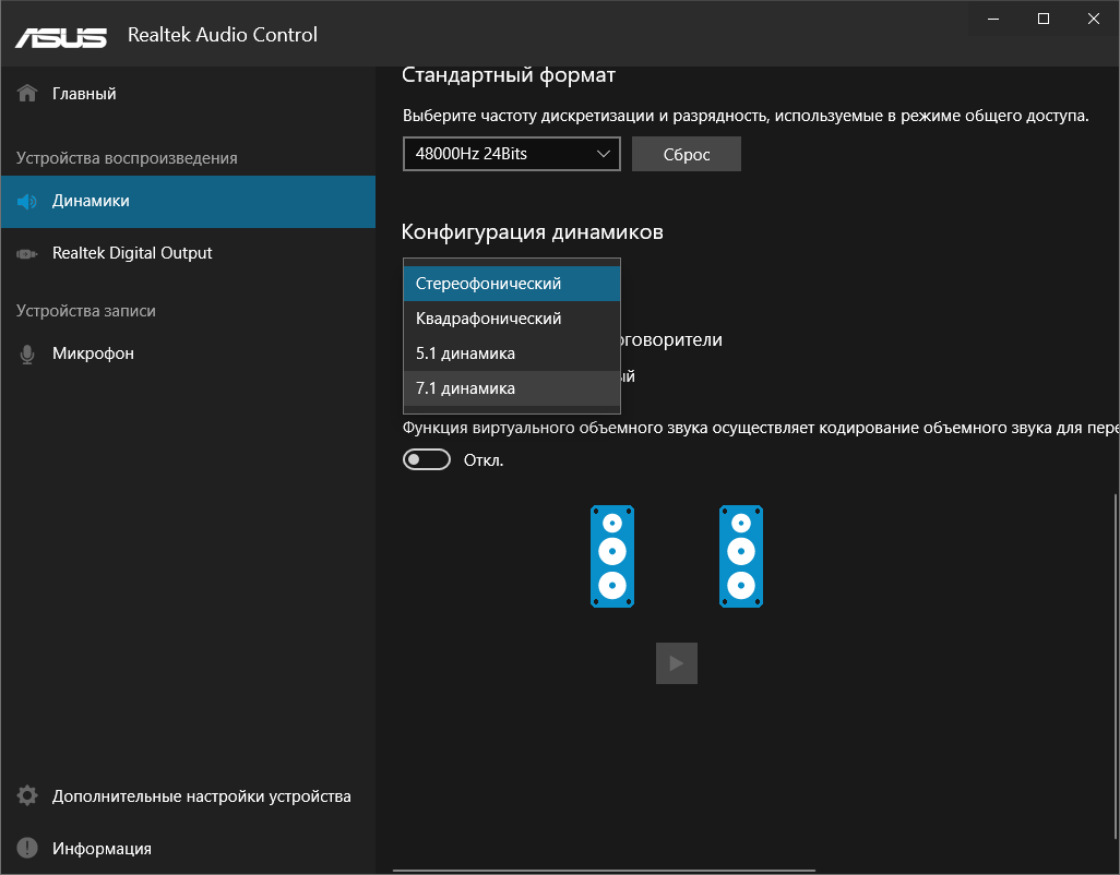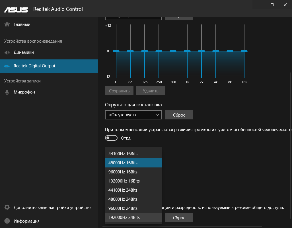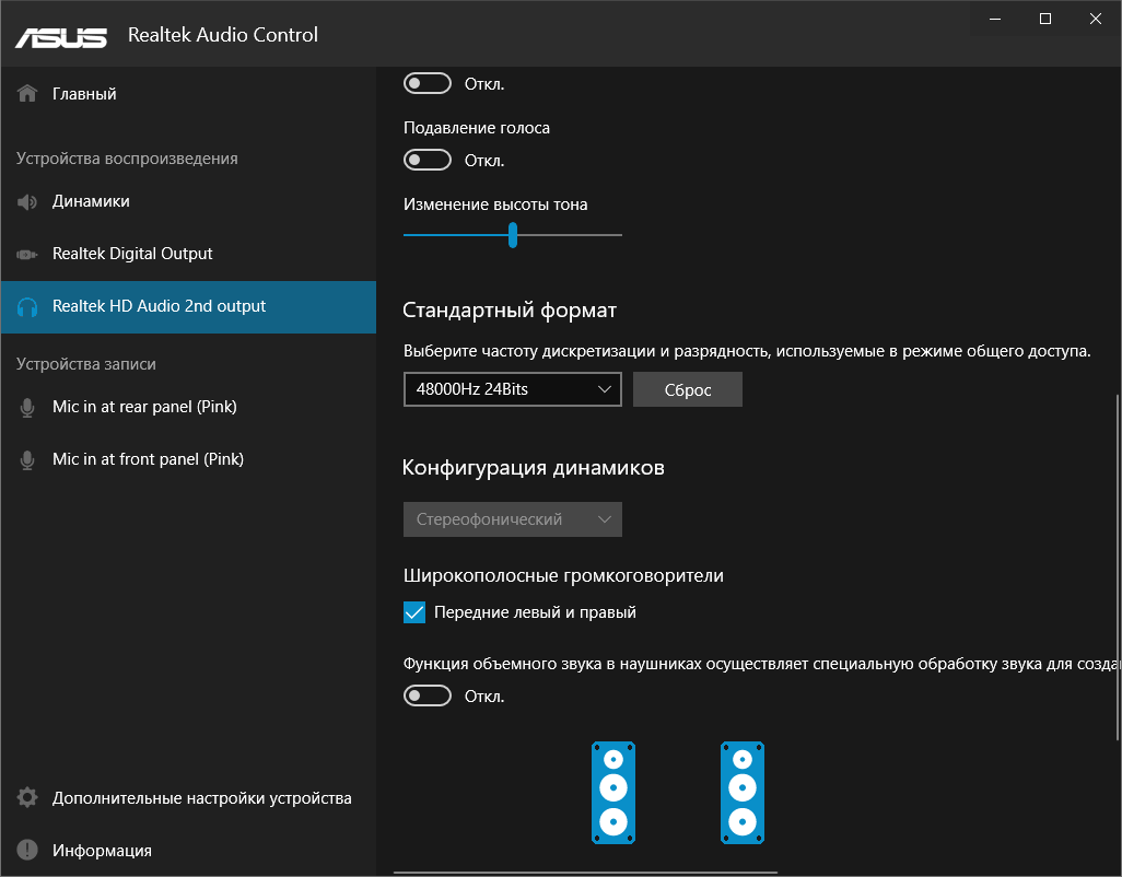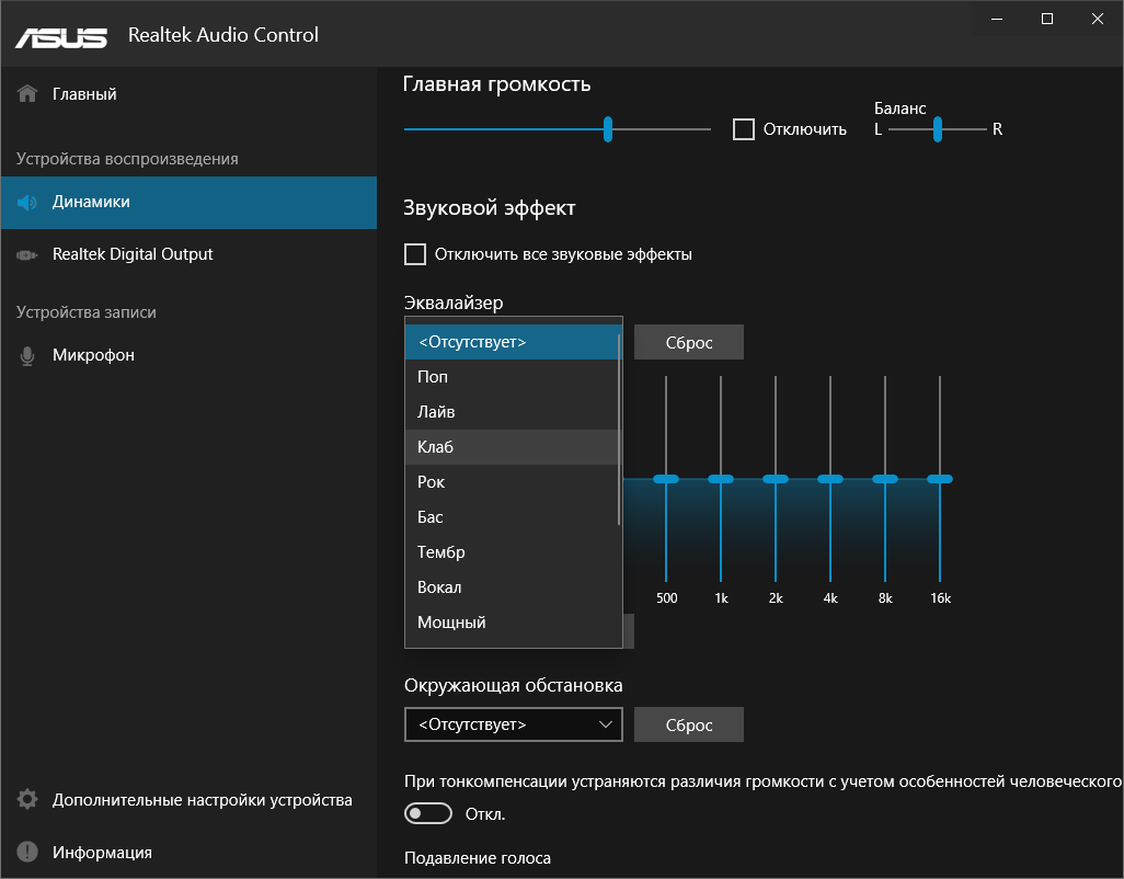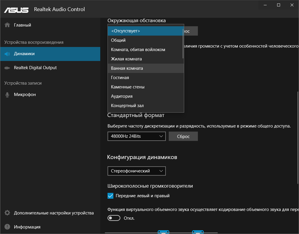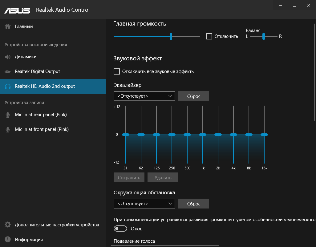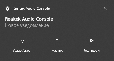 А ещё упростить подбор акцентов призваны всплывающие окна, доступные пользователю лишь в моменты подключения оборудования. Так, видим три профиля для стереодинамиков и столько же под наушники. Все они оказывают влияние на выходной сигнал, в частности, с любым типом «Наушников» громкость будет явно выше, чем с «передними динамиками».