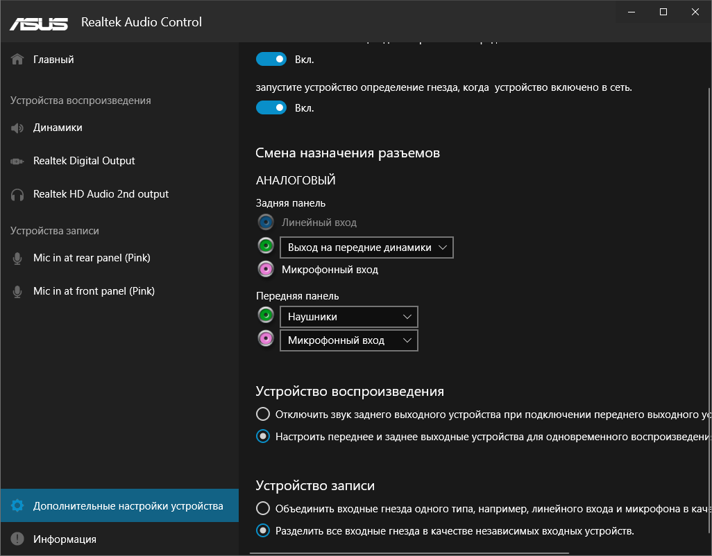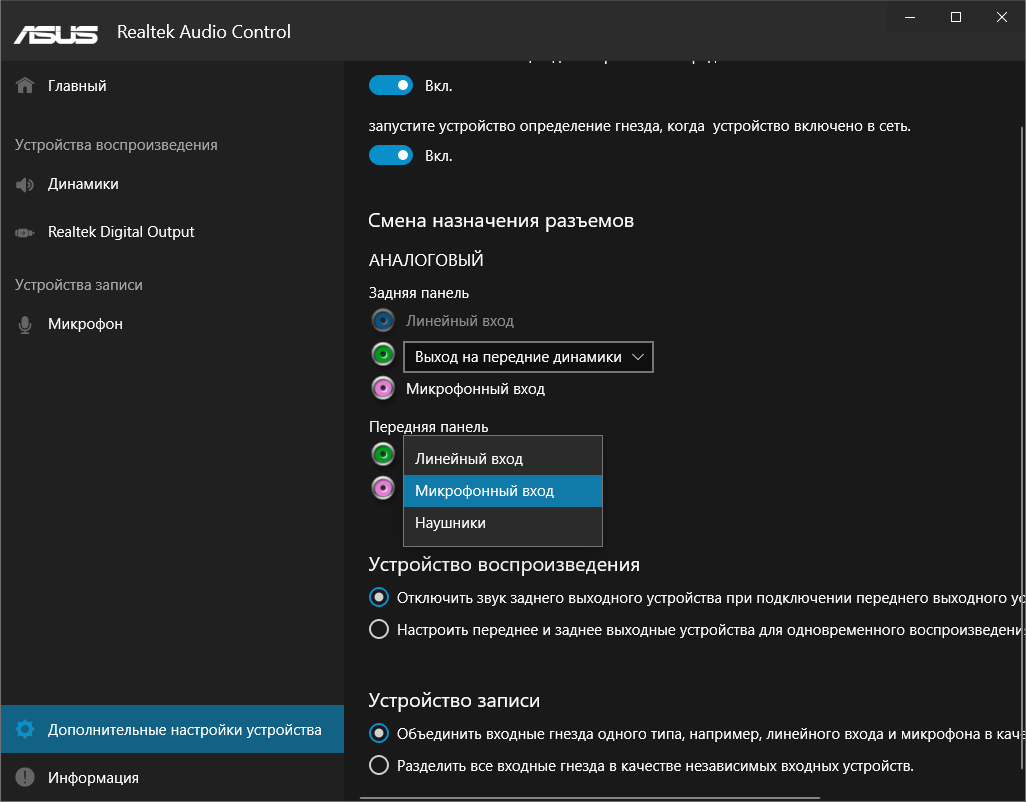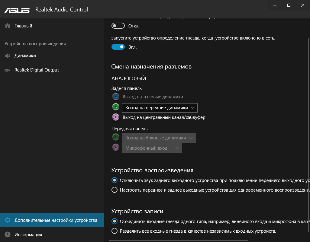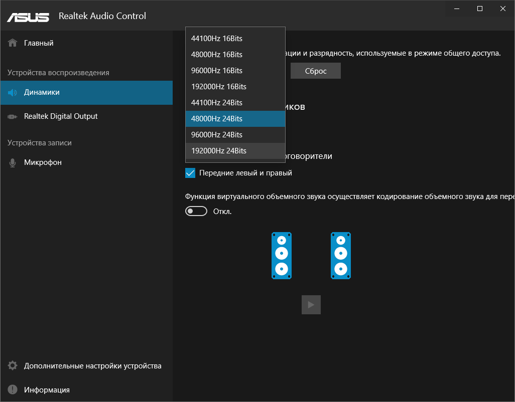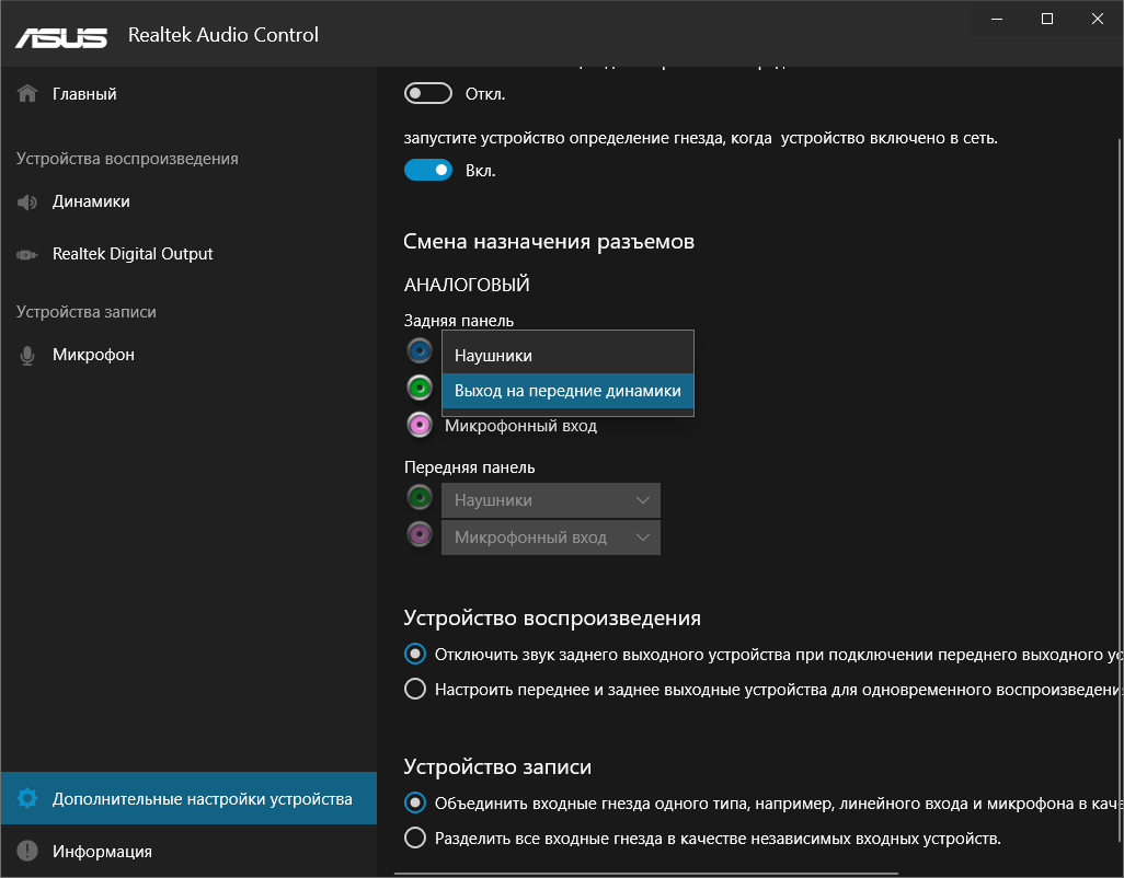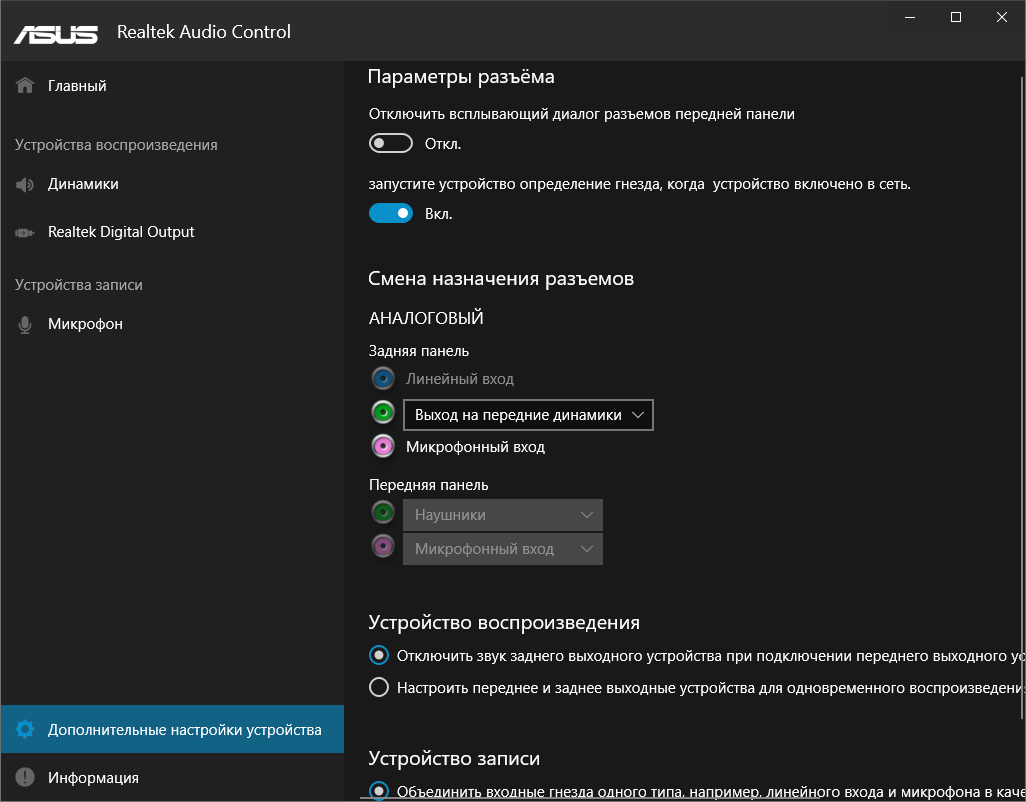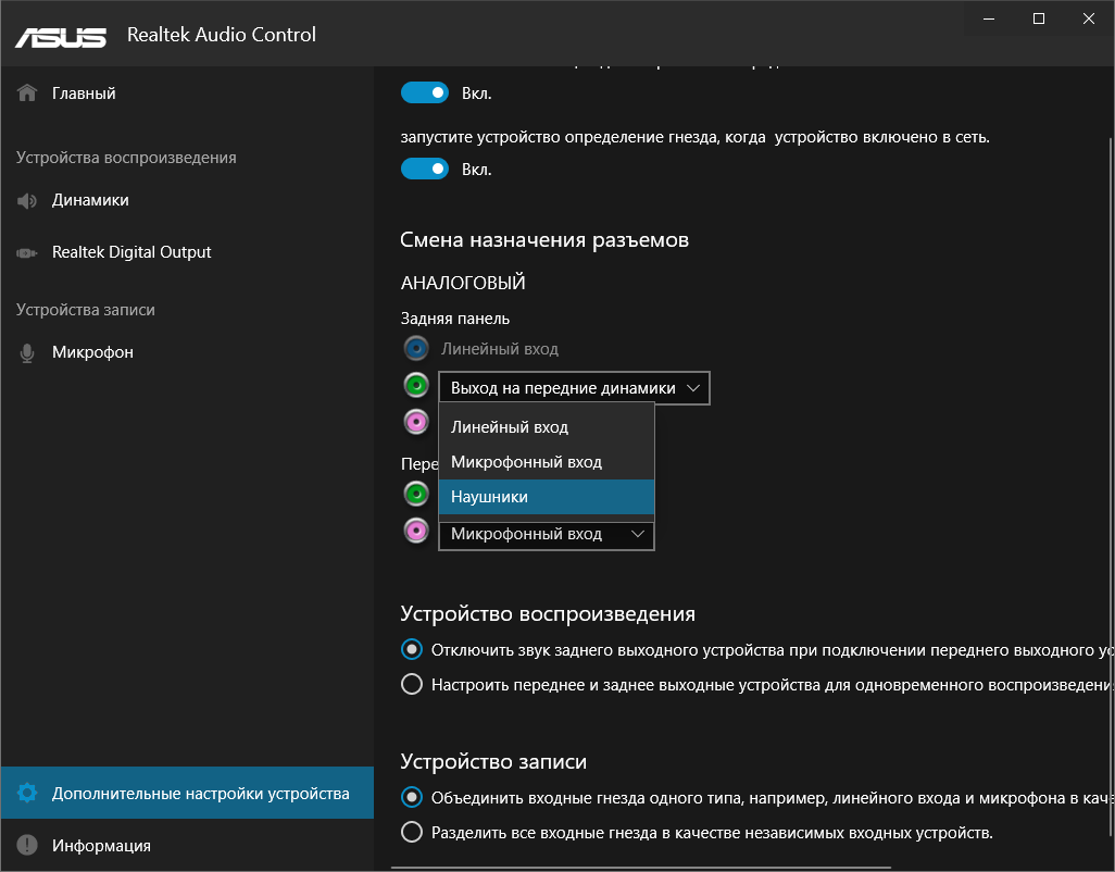 А ещё упростить подбор акцентов призваны всплывающие окна, доступные пользователю лишь в моменты подключения оборудования. Так, видим три профиля для стереодинамиков и столько же под наушники. Все они оказывают влияние на выходной сигнал, в частности, с любым типом «Наушников» громкость будет явно выше, чем с «передними динамиками».