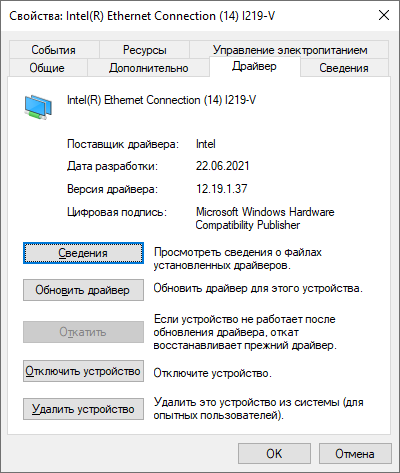 Технические данные о единственном сетевом контроллере Intel можно изучить на скриншотах экрана ниже.