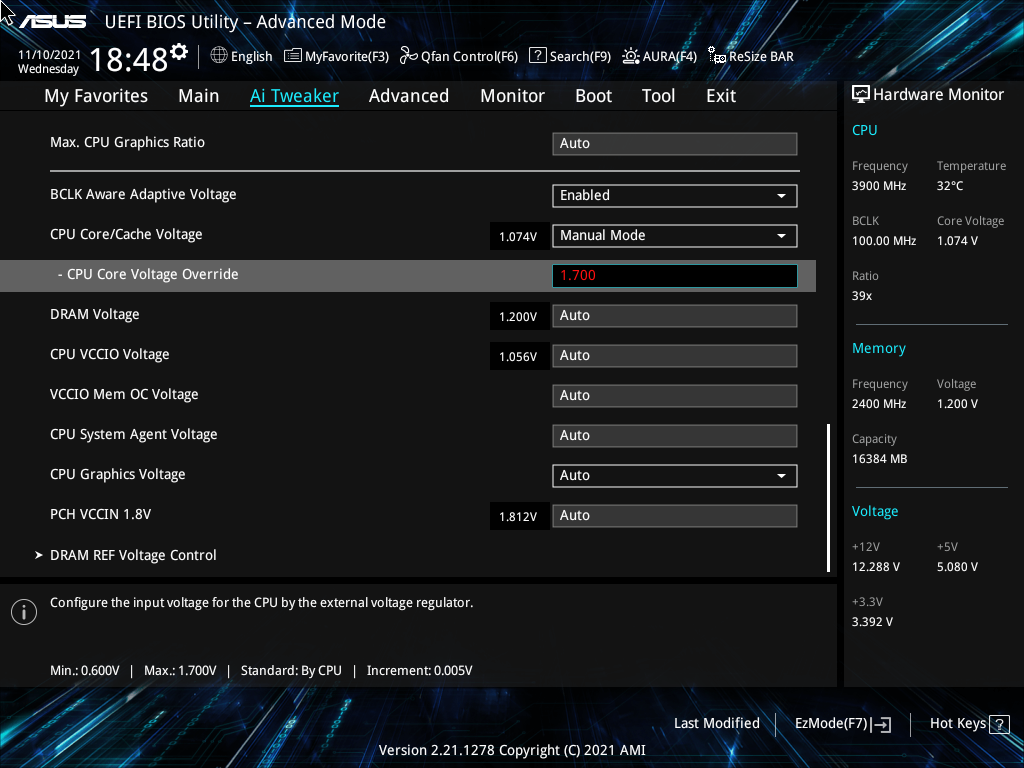 | CPU Core Voltage Override (В) | 0,6–1,7 | 0,005 |
