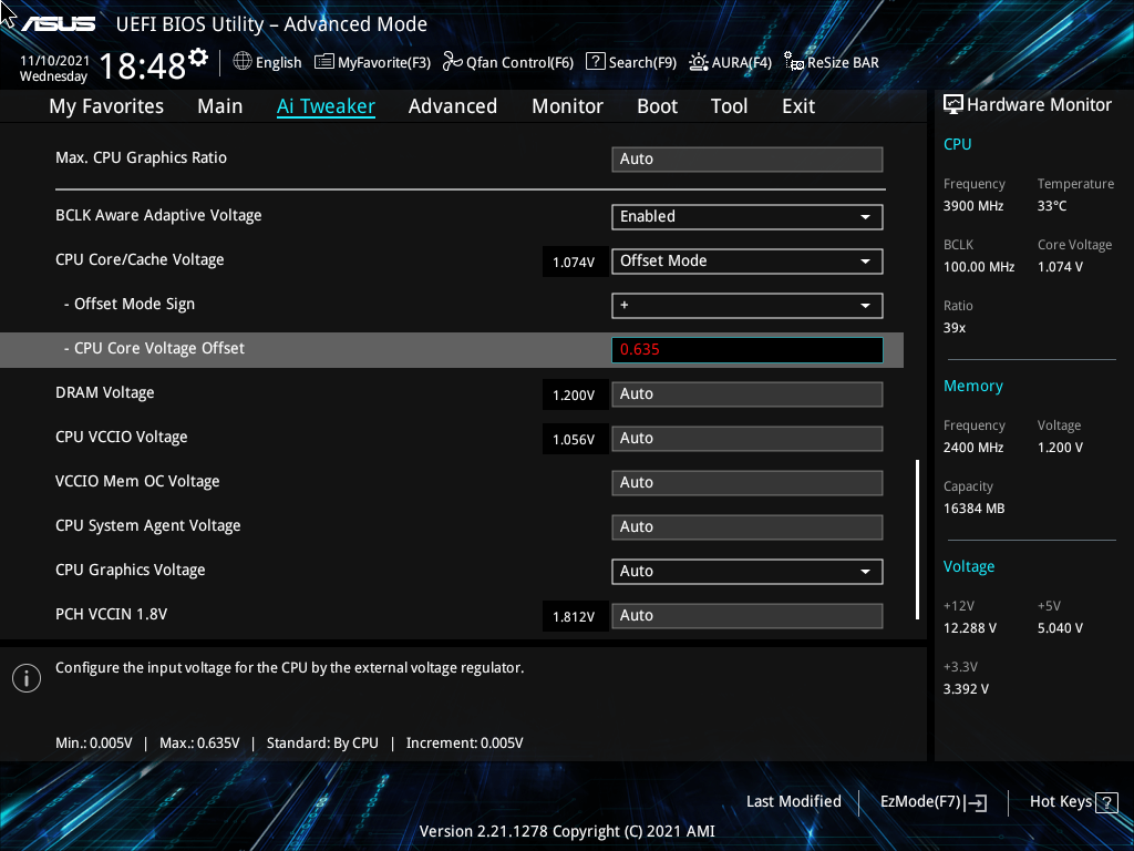 | CPU Core Voltage Offset (В) | (+/–) 0,005–0,635 | 0,005 |