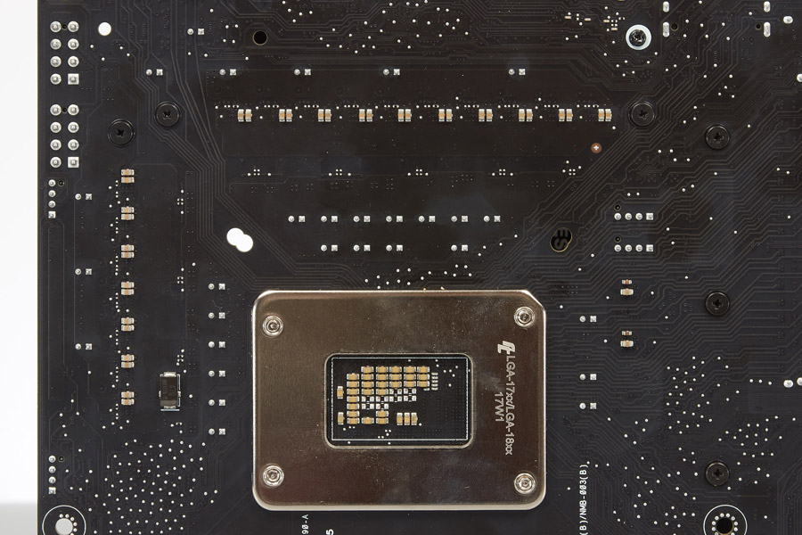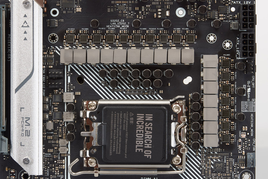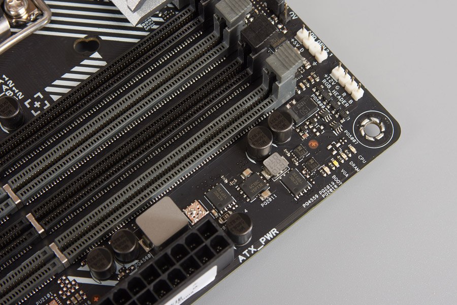 Преобразователь питания процессора построен по схеме 16+1, для процессора и графического ядра соответственно, на базе элементов Vishay SiC643 и управляется контроллером Digi+ ASP2100. Еще пару фаз расположили в аккурат под сокетом, возле первого разъема M.2. Подвод питания осуществляется через два разъема EPS12V.