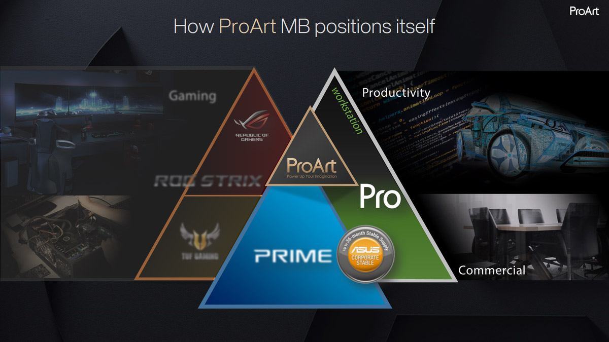 Нащупывая новые рыночные ниши, компания ASUS проложила путь к созданию линейки продуктов ProArt. Я не случайно говорю именно о семействе, поскольку сближение в одной сборке различных компонентов заложено целенаправленно, и всё же сосредоточимся на материнских платах. Изучая официальную визию, можно понять всю суть задумки. Ненавязчиво проводится параллель с игровыми изделиями, где среднюю категорию заняла серия ROG Strix. Так и ProArt досталась срединная позиция, отправляя платы Prime в начальный эшелон, а топ-решения оставляя за продуктами Workstation (Pro WS).
