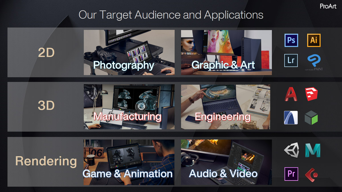 Для лучшего понимания форм рабочих задач есть другой слайд, где роль основной рабочей среды уготована таким продуктам, как Adobe Photoshop/Lightroom, Autodesk AutoCAD и прочему известному флагманскому ПО.