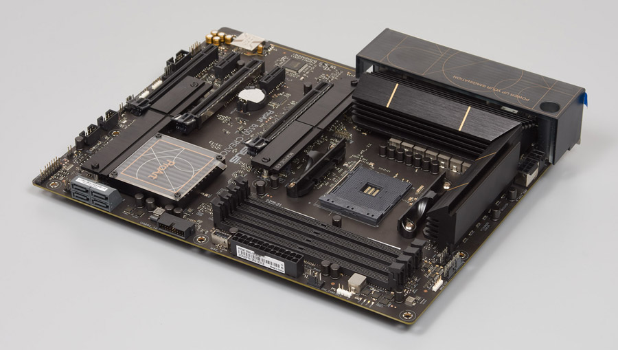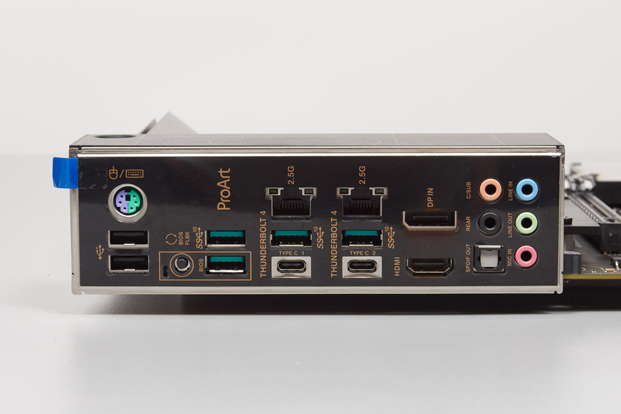 Переходя к цели обзора, держим в уме превосходство продуктов серии над платами Prime, а значит «начинка» тут определённо должна чем-то серьёзно превосходить рядовые платы, и таковой является поддержка сразу «из коробки» Thunderbolt 4 двумя выходами на задней панели. Кроме того, подчёркнутая оторванность от плат из игровых серий дарит владельцу строгость линий в дизайне и полное отсутствие элементов подсветки.