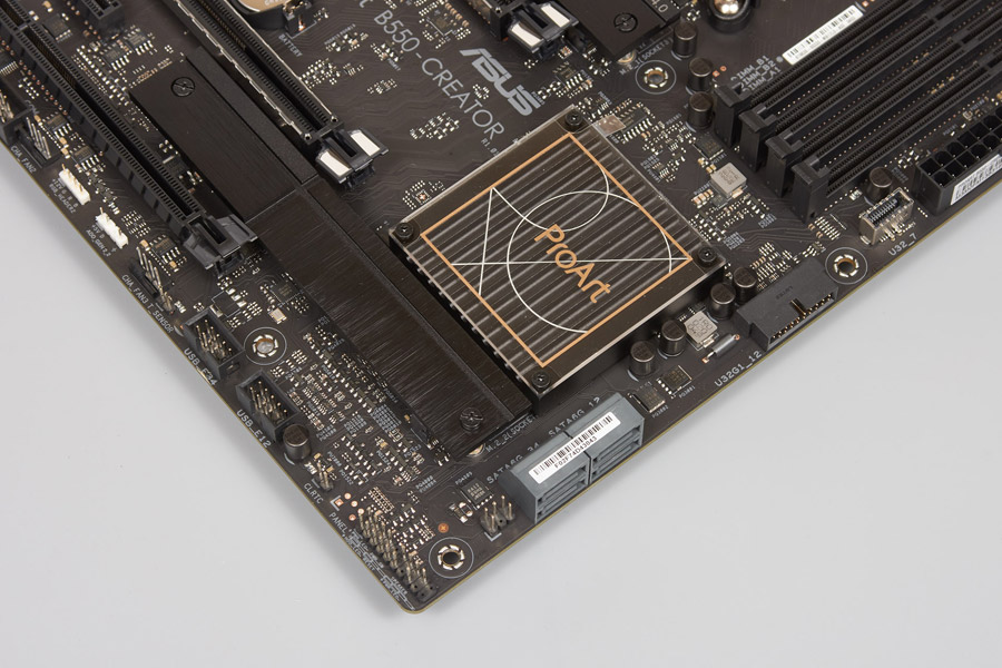 Поддержка всего четырёх SATA не ставит их доступность под сомнение, как это бывает на прочих продуктах с бо́льшим числом таких выходов, когда ограниченность ресурсов AMD B550 даёт о себе знать. Вопросы будут с доступностью нижних слотов PCI-E, о чём мы поговорим чуть позже.
