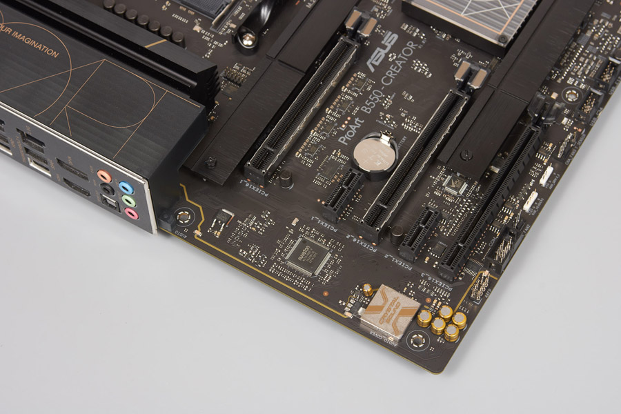 Четвёрка микросхем PI3EQX16021 от Diodes Incorporated обеспечит работу двух верхних армированных PCI-E x16 по схеме x8+x8, поддерживается поколение PCI-E 4.0. Нижний PCI-E x16@x4 делит ресурсы с контроллером Intel JHL8540, который помогает работе Thunderbolt 4 в лице двух портов на задней панели, то есть работать будет что-то одно. Под этот чип распаян повторитель сигналов (Redriver) DS80PCI402 от Texas Instruments.