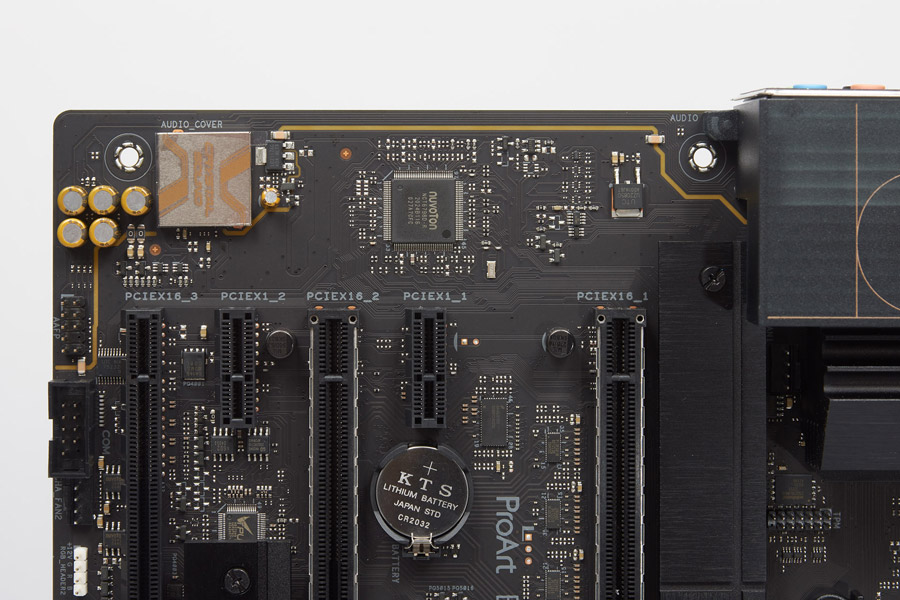 Звуковой кодек S1220A от Realtek упрятан под экранирующий колпак, ему в работе поможет группа из шести аудиоконденсаторов. Ещё можно выделить экранирующий участок из вытравленных слоёв текстолита. Более примечательного тут нет ничего.