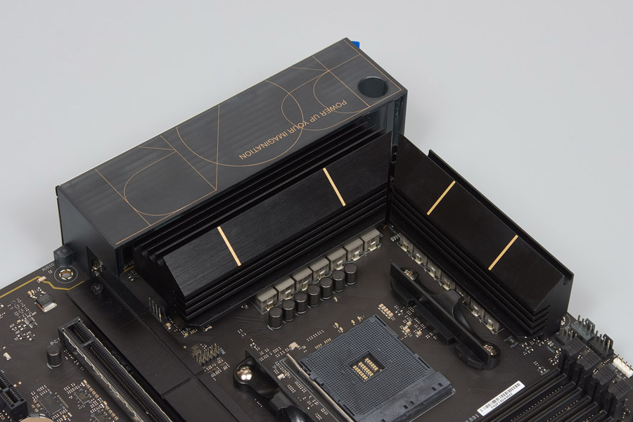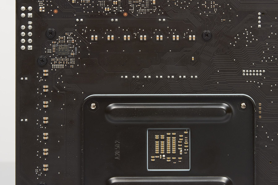 Удивляет экономия на площади термопрокладок. Всё сделано впритык, и если на одном радиаторе контакт всё же прошёл полноценно со сборками, то во втором вышло не так красиво, лишь огромный запас мощности VRM может послужить оправданию такой политики. Однако, как это уже нередко бывает, перфекционисты тут смогут своими силами улучшить положение вещей вплоть до идеального. Нарекания к охладителям чипсета и под изделия формата M.2 отсутствуют.