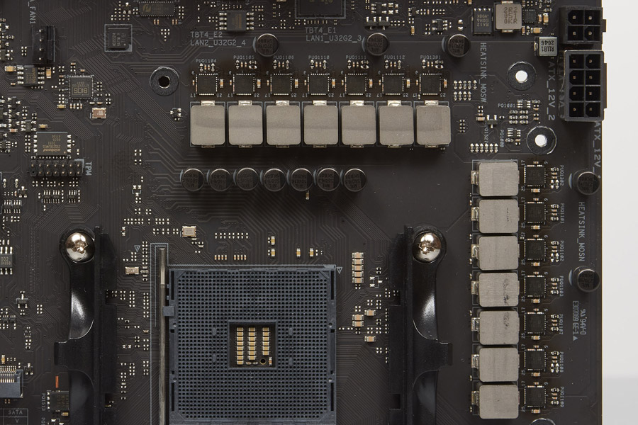 Инженеры не стали придумывать велосипед и воспользовались готовыми наработками в вопросе организации процессора достаточным питанием, в нашей лаборатории прямым примером послужит модель Prime X570-Pro. Итак, по схеме 4+2 фазы с привлечением переименованного контроллера ASP1106JGQW были получены 12 и 2 канала для CPU и SOC Voltage, то есть число силовых элементов в первом случае утроено. Модели сборок те же, это SiC639 от Vishay Intertechnology. Такая же идея используется в ряде плат ROG Strix на базе AMD B550. Плюсы и минусы нам уже известны — это низкий нагрев и посредственная стабилизация соответственно, останется всё лишний раз подтвердить на практике. Конденсаторов в округе стало меньше, но зато они «военного» класса надёжности, причём рассчитанные на те же пять тысяч часов работы в условиях повышенных температур.
