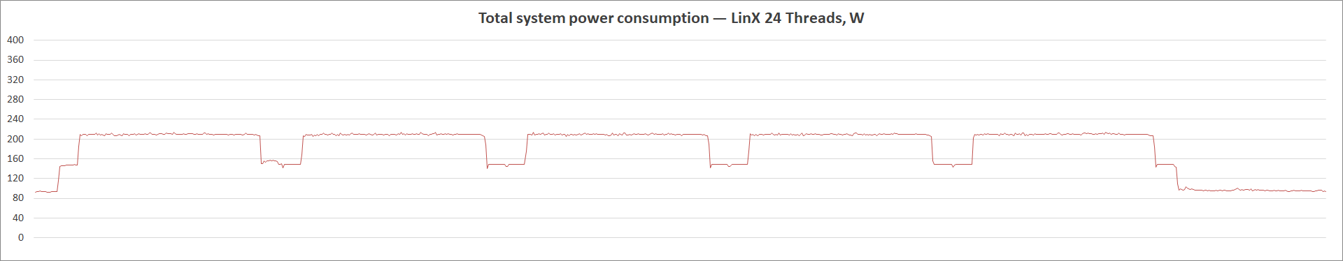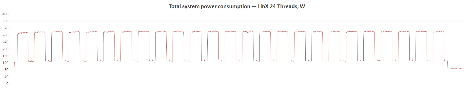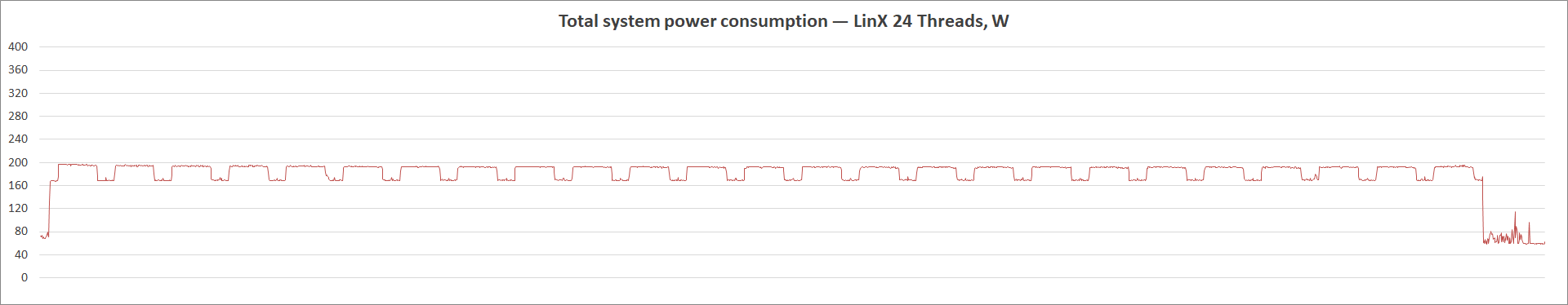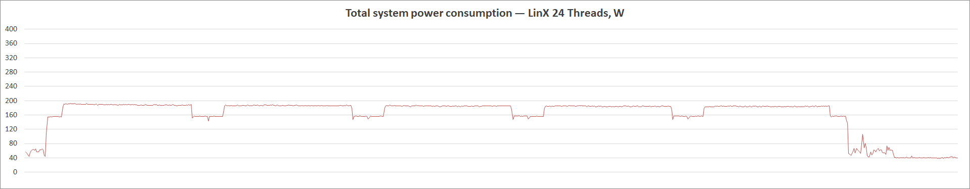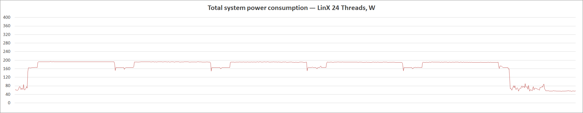 Сохраняя схожий уровень продуктивности в LinX, ProArt B550-Creator оказалась более экономичной, уровни потребления составили 39–192 Вт.
