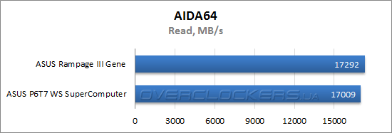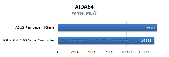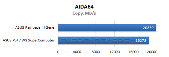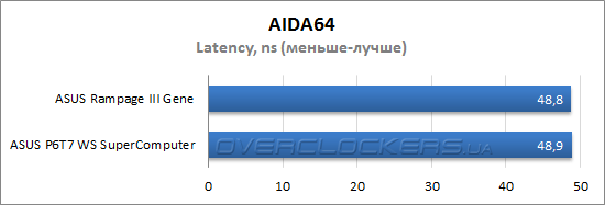 Сравнение показателей производительности плат ASUS в самом начале преподнесло сюрприз: набор бенчмарков подсистемы памяти FinalWire Aida64 обнаружил солидное преимущество Rampage III Gene. Разница достигла 2,8% в тесте записи в память и 8,2% в тесте копирования.