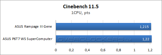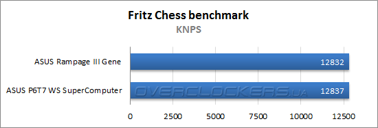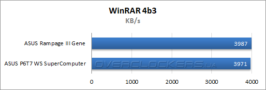 Само собой разумеется, Rampage III Gene использовала BIOS версии 0805. Ее соперницей выступила ASUS P6T7 WS SuperComputer — плата в форм-факторе CEB (305 x 269) для построения высокопроизводительных рабочих станций. Последняя тестировалась с BIOS v.1001. Приведенные ниже результаты являются средним значением по итогам двух бенч-сессий. Процессор и модули памяти на обеих платах работали в одинаковых режимах.