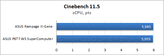 В процессорном тесте Cinebench R11.529 решения ASUS демонстрируют одинаковый потенциал. Как видно, тенденция, наметившаяся в Aida64, не подтверждается другими бенчмарками.