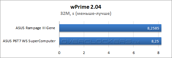 Одна из зачетных дисциплин оверклокерской лиги HWBot — wPrime 1024M — дает понять, что P6T7 WS SuperComputer тоже не лыком шита. На «длинной дистанции» она справляется с тестовым заданием на 0,4 сек. быстрее.
