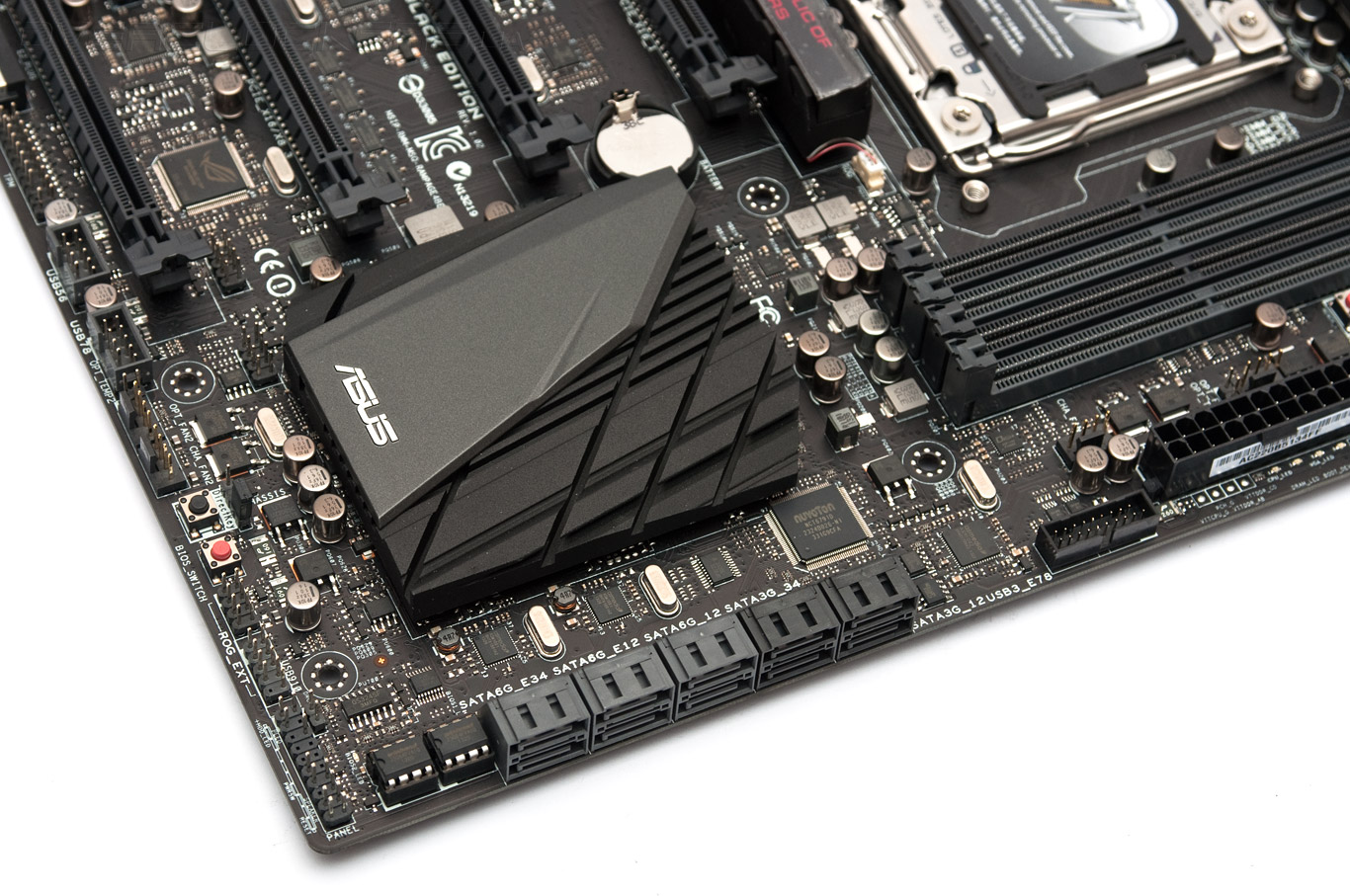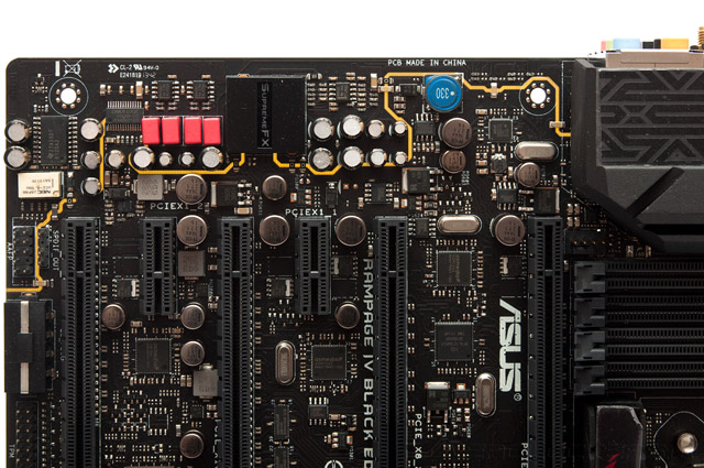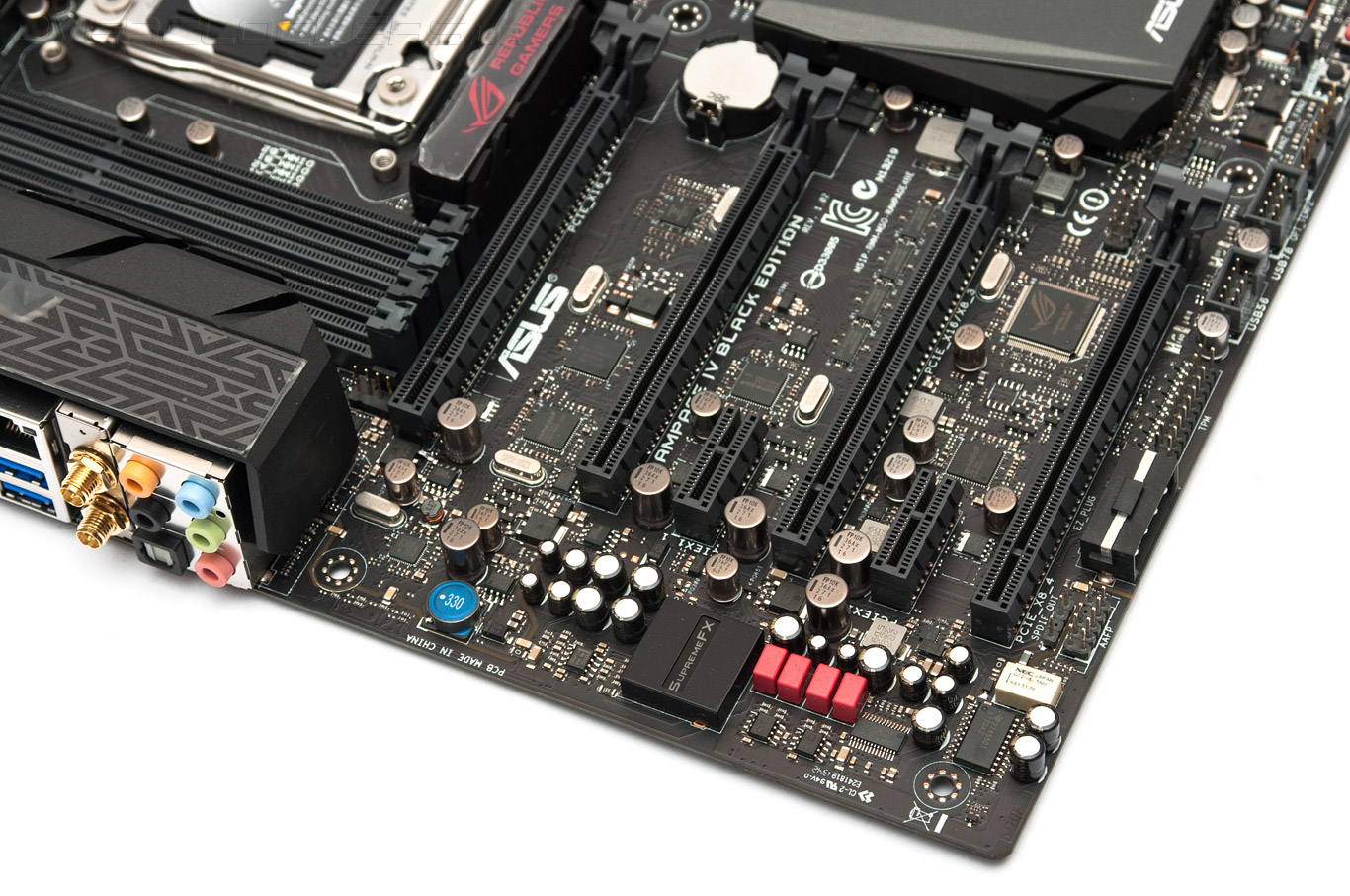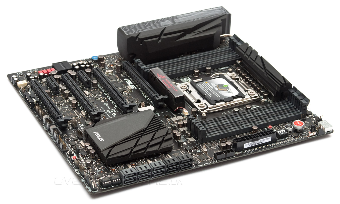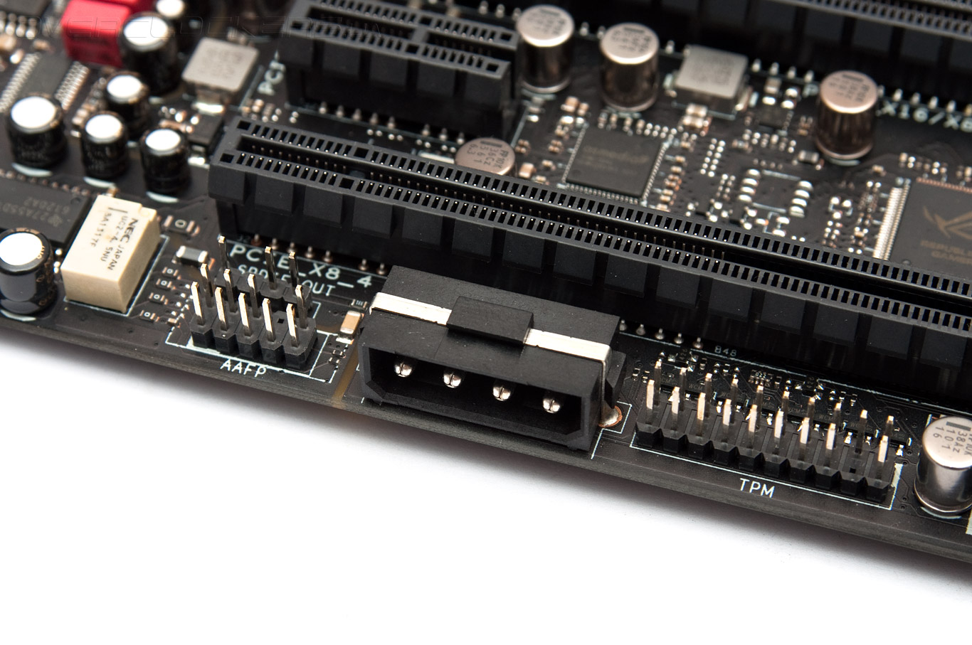 И если организация питания процессора у новинки по сравнению с той же Rampage IV Extreme ничем не отличается, то подача дополнительного питания для тандема видеокарт претерпела некоторые изменения — теперь вместо шестиконтактного разъема используется привычный «молекс». Вполне логично, если использовать от трех до четырех акселераторов, ведь не каждый блок питания будет обладать необходимым количеством разъемов.